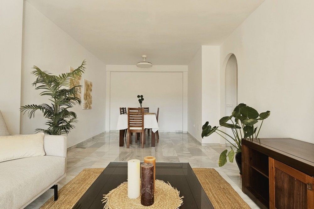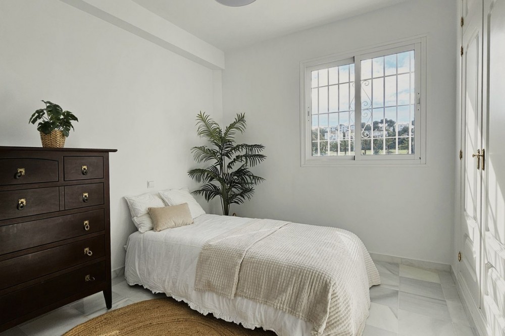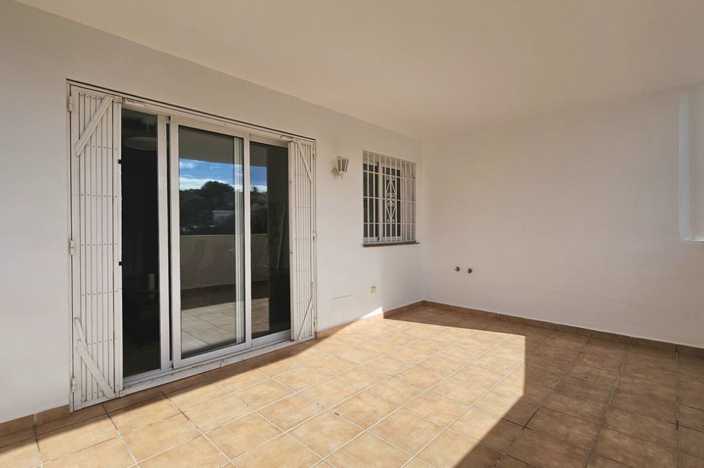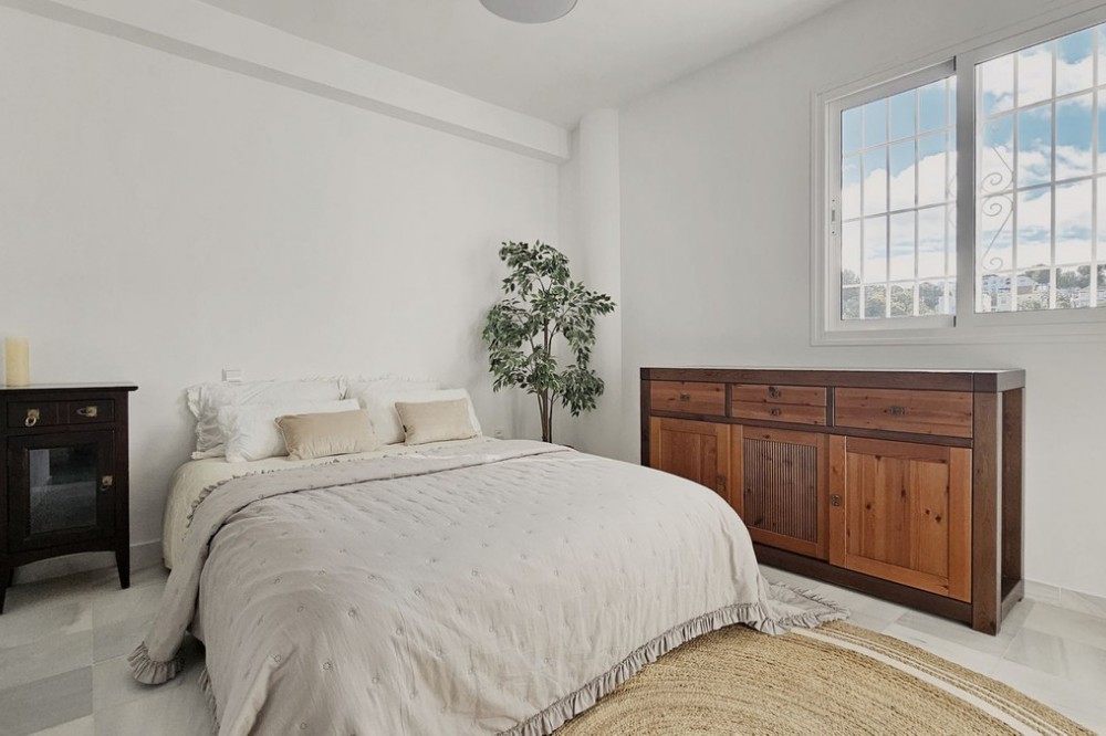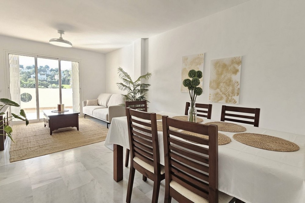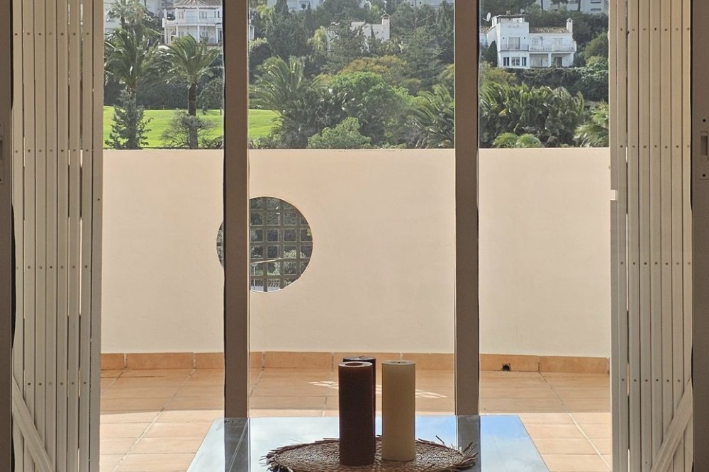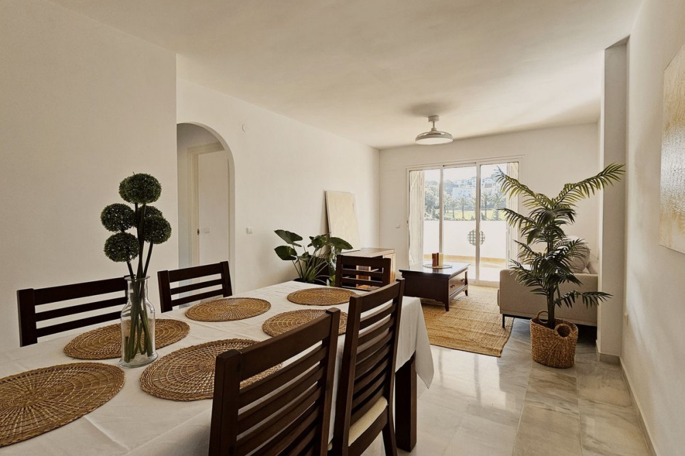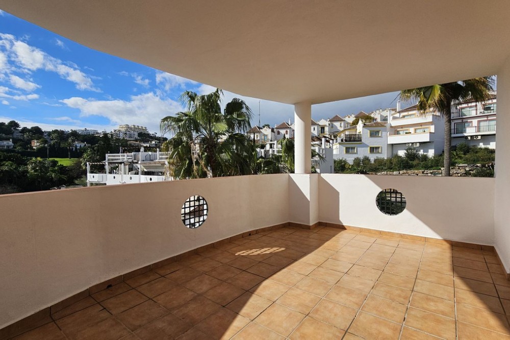 - Beautiful 3 bedroom + 2 bathroom apartment for sale in Miraflores area. Spacious south & west facing covered terrace with open green views to the Miraflores golf course and gardens. Nice and quiet location only few minutes drive away from the beach village La Cala de Mijas and the amenities in Riviera del Sol. No lift, but the apartment is located only 8 steps from the street level. It's a third floor apartment, but there is an entrance from the street behind the building, and that entrance is between the floors 2 and 3. 700 m from Miraflores golf club 800 m from supermarket & restaurants 1,5 km from the beach (Playa El Bombo in La Cala village) 5 min drive to Max Beach or El Oceano beach clubs. Come view this beautiful apartment that suits perfectly for permanent living or having your very own holiday paradise on Costa del Sol.