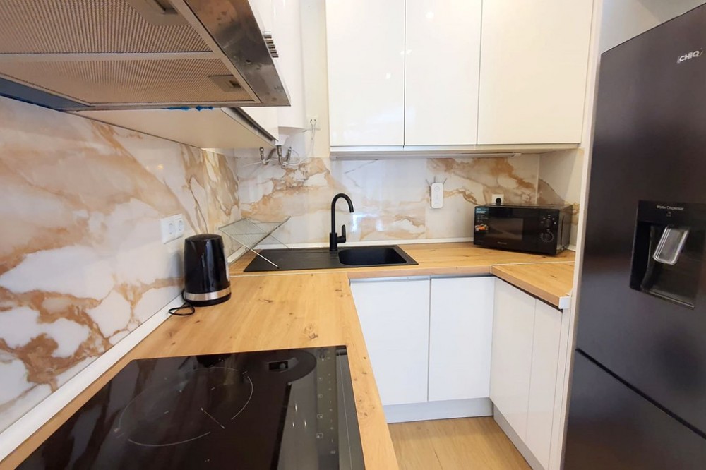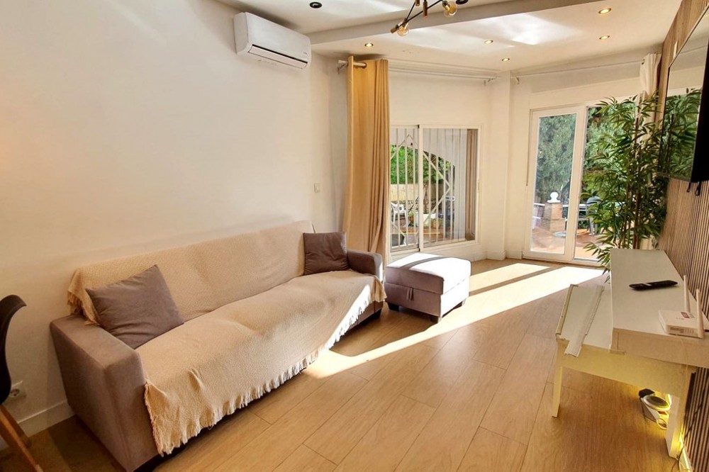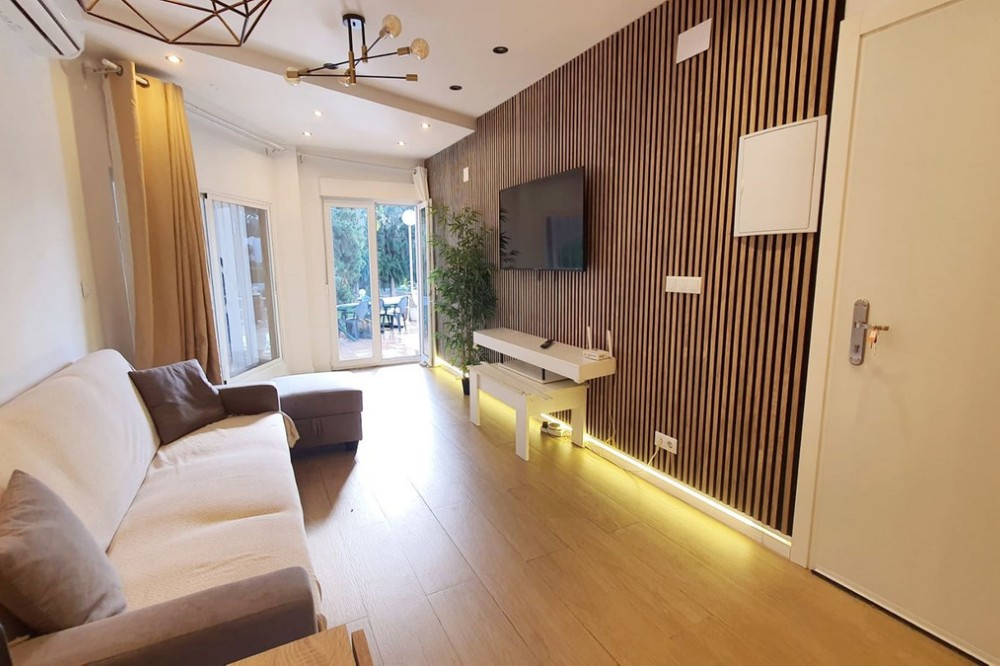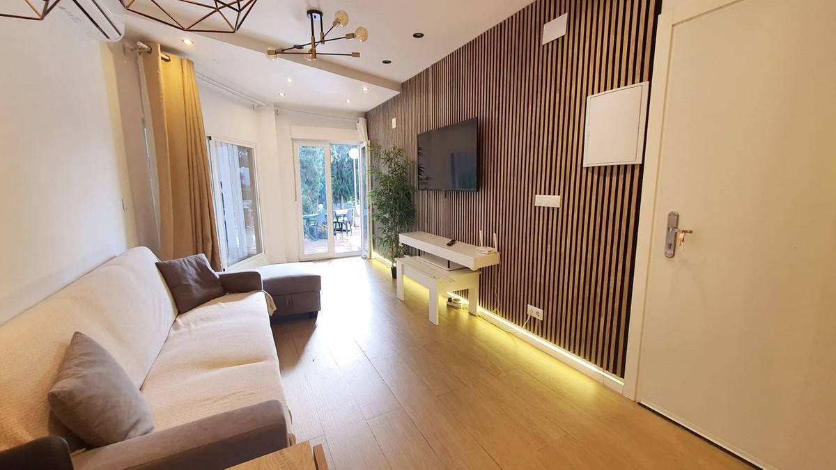 - Cozy ground floor corner apartment for sale in Doña Pilar, completely renovated! This property offers a modern open plan design with fully equipped kitchen, lounge dining with access to the terrace, 2 bedroom, and one bathroom with large italian walk in shower. The apartment offr new plumbing, new electric, new floor, new doors, spots lights, A/C, double glazed windows, all very well presented. The terrace is facing the lovely pool area with plenty of place to eat, sunbathe, and with grass all around. It is walking distance to transport and five minutes driving to the Fuengirola beaches. Ideal as a holiday place for a family! Ground Floor Apartment, Mijas, Costa del Sol. 2 Bedrooms, 1 Bathroom, Built 48 m², Terrace 12 m². Setting : Suburban, Urbanisation. Orientation : South. Condition : Excellent, Recently Renovated. Pool : Communal. Climate Control : Air Conditioning. Views : Garden, Pool. Features : Near Transport, Double Glazing. Furniture : Part Furnished. Kitchen : Fully Fitted. Garden : Communal. Parking : Communal. Category : Bargain, Holiday Homes, Resale.
