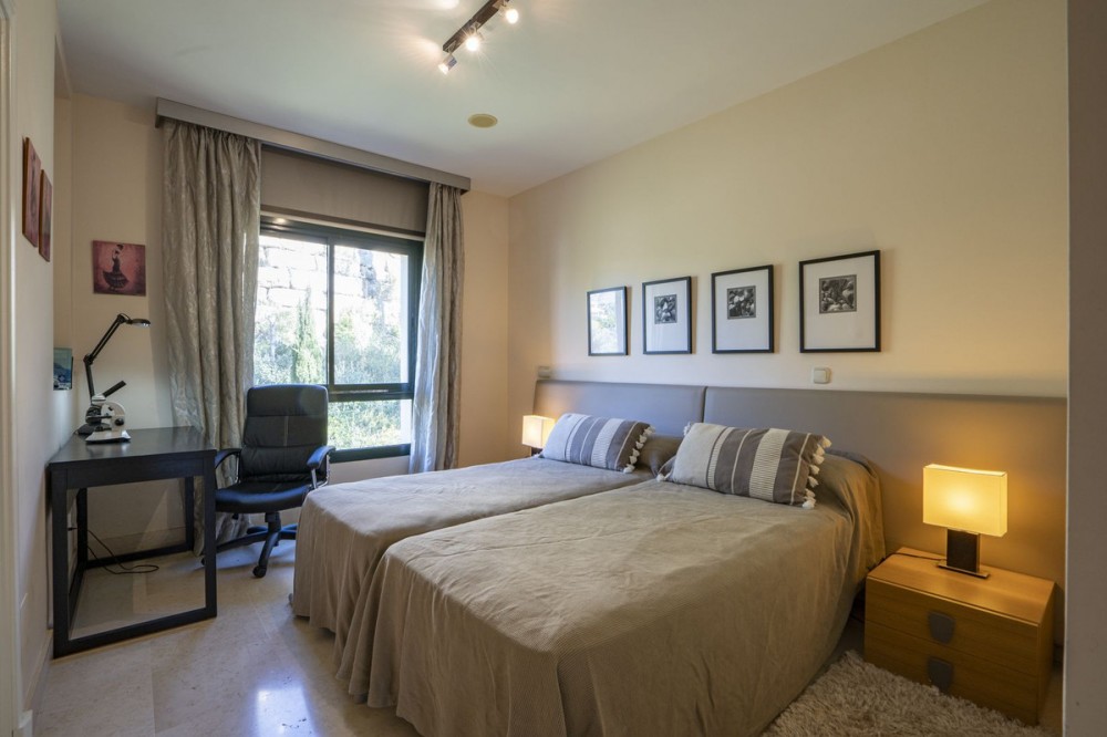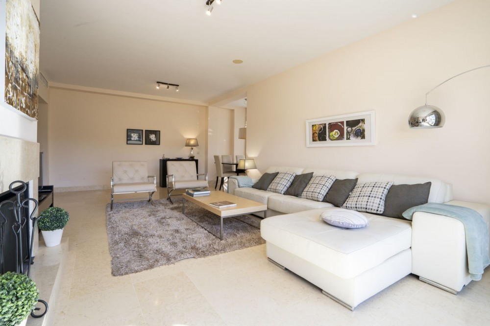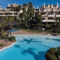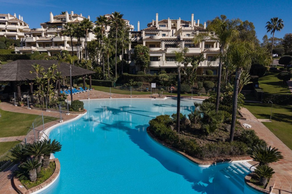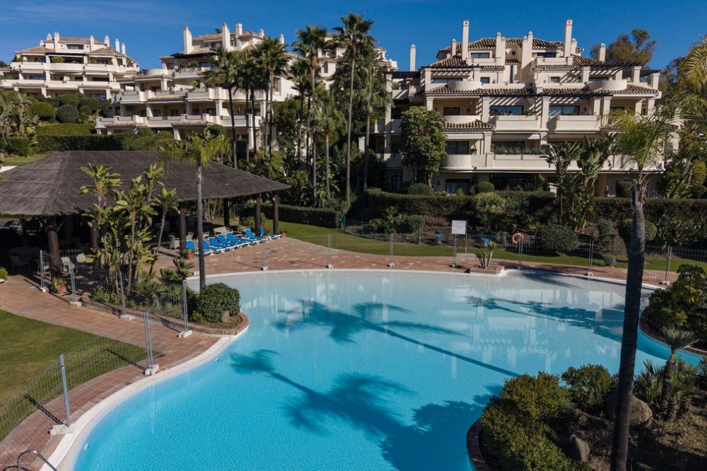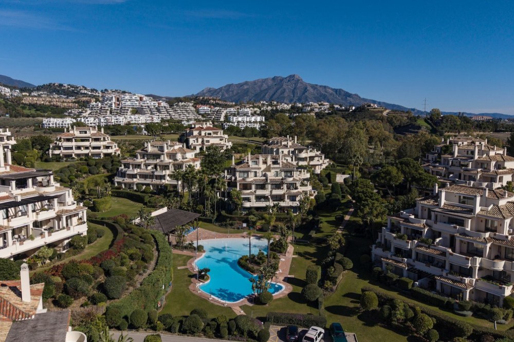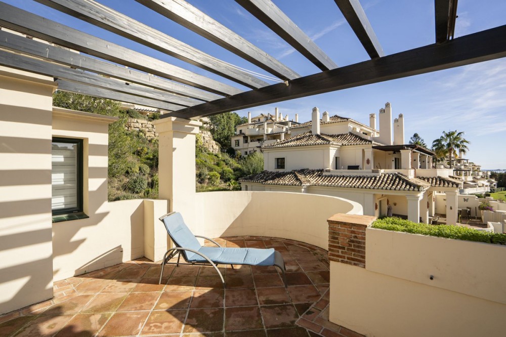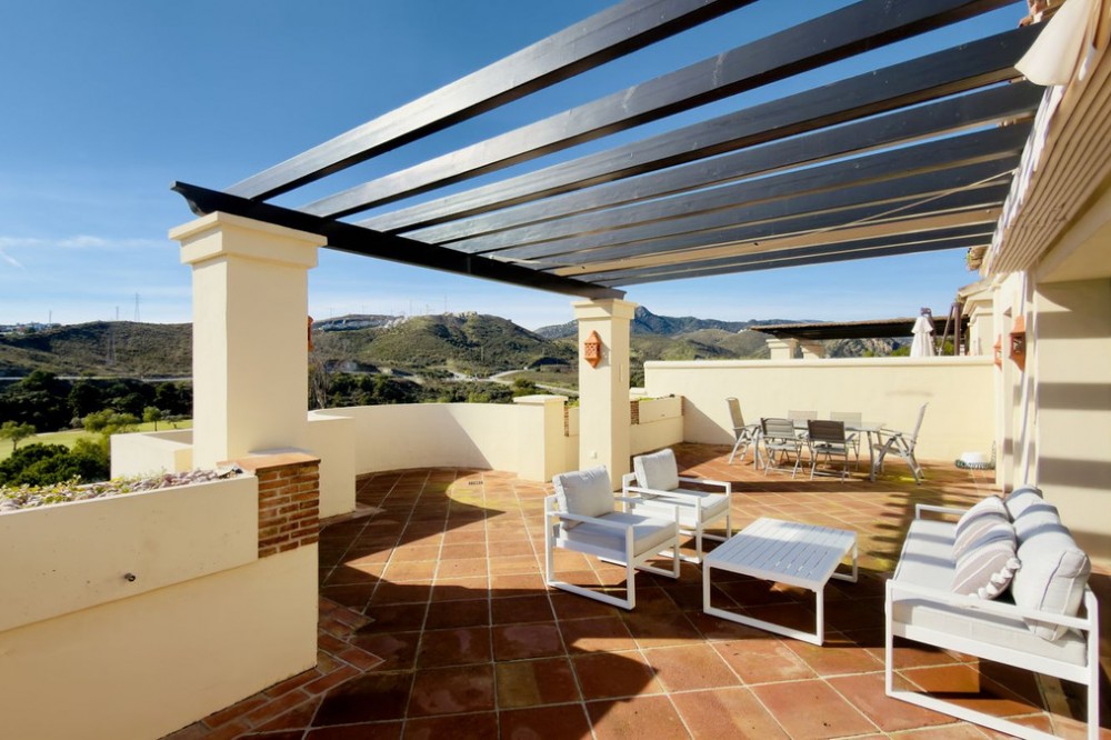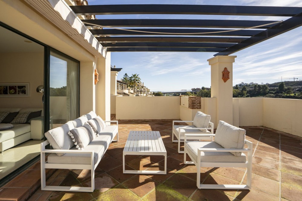 • This exceptional duplex penthouse is located within an exclusive residential community, set in the heart of the El Higueral Golf Course. Surrounded by over 50,000 m² of beautifully landscaped communal gardens, the property offers a refined lifestyle defined by privacy, comfort, and natural surroundings. The secure, gated development provides outstanding resort-style amenities, including five outdoor swimming pools, an indoor heated pool, a fully equipped gym, and spa. Ideally positioned, the property benefits from easy access to everyday amenities, supermarkets, and several renowned golf courses, as well as excellent connections to the coast and nearby towns Benahavís and San Pedro de Alcántara. Arranged over two levels, the penthouse features three spacious bedrooms, each with its own en-suite bathroom. The expansive 106 m² terrace enjoys open views over the golf course and sea, offering an ideal space for outdoor living and entertaining. Additional features include a fully fitted kitchen, a separate laundry room, two underground parking spaces and a private storage room.
