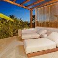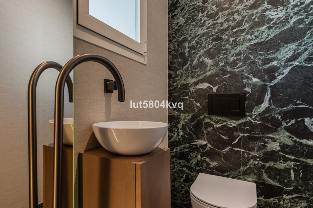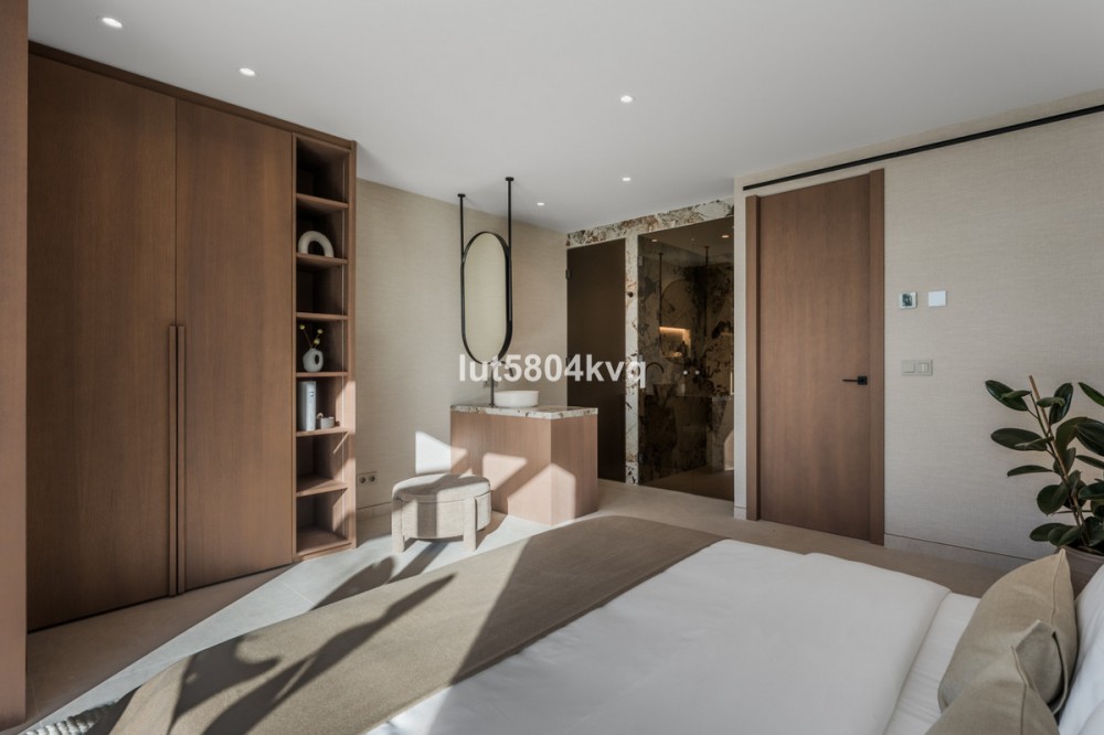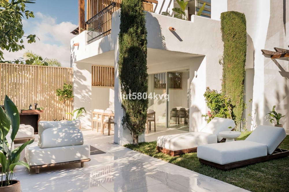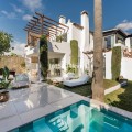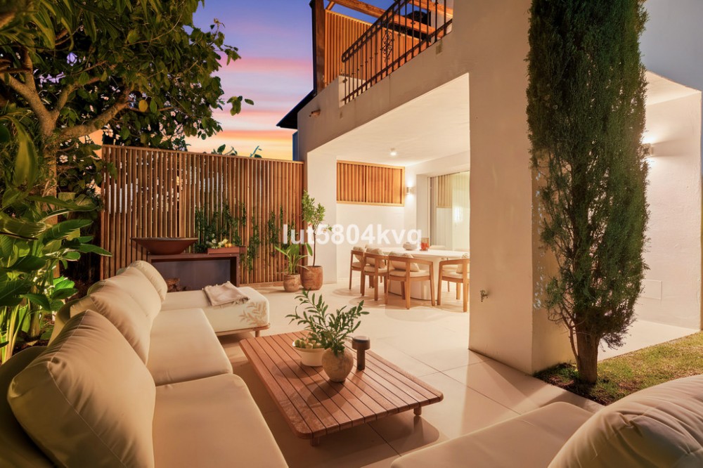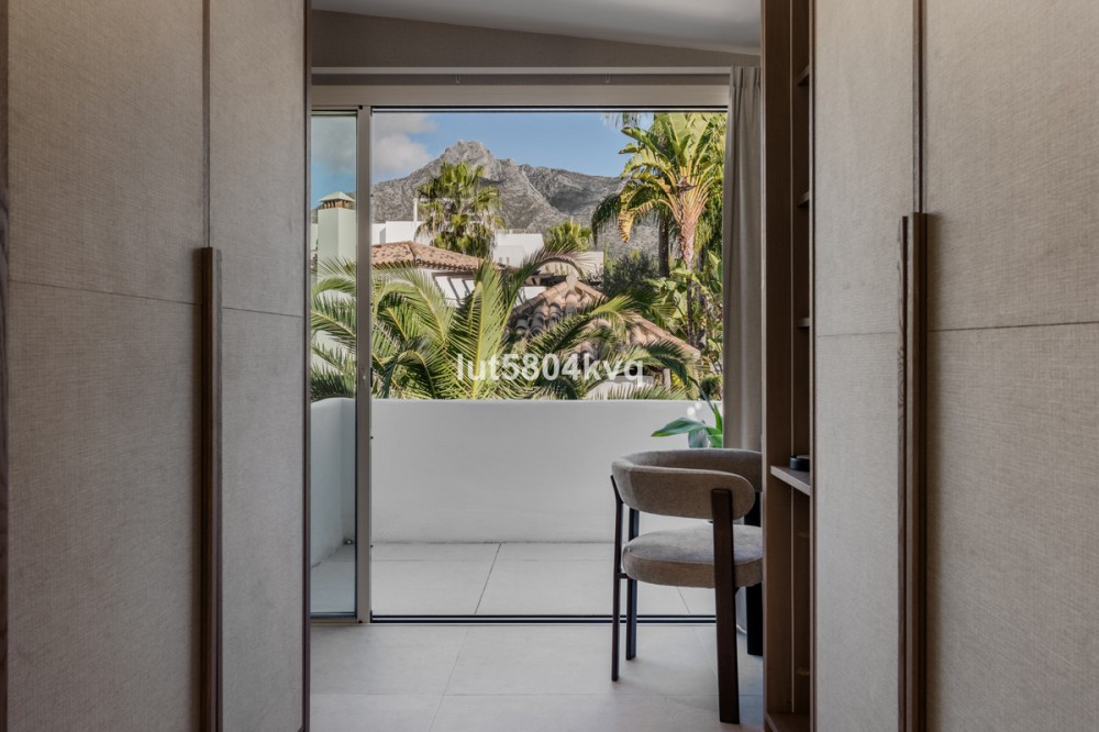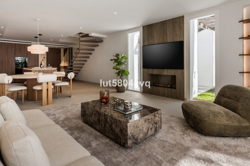 - Semi-Detached Villa in Altos de Salamanca – Marbella’s Golden Mile Located within the prestigious gated community of Altos de Puente Romano, in the charming community of Altos de Salamanca, this newly renovated semi-detached corner villa offers the pinnacle of luxury living on Marbella’s iconic Golden Mile. Set in a secure environment with 24-hour surveillance and camera systems, the property guarantees absolute privacy and peace of mind. This elegant home is enveloped by a lush, south-facing garden that enjoys sunlight throughout the day—from early morning to late afternoon—creating a bright, warm ambiance inside and out. The communal areas include immaculately maintained gardens and a large shared swimming pool, ideal for families and social gatherings. Just a short stroll from the beach and the legendary Puente Romano and Forum, the location is nothing short of exceptional. Set on a prime corner plot, the property is surrounded by mature palm trees and vibrant Mediterranean landscaping and a private plunge pool. Inside, the villa showcases a sophisticated, high-end interior design with carefully selected materials, fixtures, and finishes. Every room has been thoughtfully redesigned to enhance comfort and elegance. The ground floor features a state-of-the-art kitchen with premium appliances, a separate laundry room, and an open architectural flow into the dining area—ideal for entertaining. The expansive living room is flooded with natural light from large windows and sliding glass doors that open directly onto the private terrace and garden. A feature fireplace, designer lighting, and stylish finishes complete the space. Also on the main level is a generously sized primary suite, complete with a walk-in dressing area and a luxurious en-suite bathroom featuring a double vanity, walk-in rain shower, and ample natural light. Upstairs, the villa features three generously sized en-suite bedrooms, each thoughtfully designed for comfort, privacy, and natural light. The master suite, located on this level, is a true highlight—featuring a stylishly centered bed, a spacious walk-in wardrobe, and a luxurious en-suite bathroom. This serene retreat offers uninterrupted panoramic views of both La Concha Mountain and the Mediterranean Sea, creating a breathtaking visual experience from the moment you wake. One of the guest bedrooms enjoys access to a private south-facing terrace with sea views, ideal for enjoying the coastal breeze and morning sun. The third upstairs bedroom also includes its own en-suite bathroom and showcases stunning views of La Concha, making it an inviting space for guests or family members. From nearly every angle, this home is blessed with extraordinary vistas, offering a constantly inspiring backdrop of mountains and sea. This move-in-ready masterpiece offers the rare combination of modern luxury, stunning views, and an unbeatable location—ideal for year-round living or as an exclusive holiday retreat.