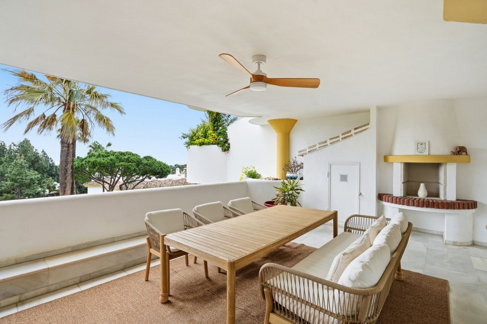 - Luxury 3-Bedroom Apartment with private Sauna in Calahonda Golf. This exceptional 3-bedroom, 2-bathroom luxury apartment is located in the highly sought-after Calahonda Golf community, set in the heart of a picturesque 9-hole golf course. Recently refurbished to the highest standards, the property showcases a sophisticated Japandi design, blending clean Scandinavian lines with warm Japanese minimalism. With a south-facing orientation, the apartment enjoys plenty natural light and beautiful sea and golf views. The spacious terrace is a true highlight, featuring a private sauna—perfect for year-round relaxation and wellness. The property is ideally positioned within walking distance to the beach (15 minutes) and shops, restaurants, and amenities (10 minutes), offering both tranquility and convenience. Set within a secure gated community, residents benefit from communal parking and access to three stunning swimming pools, all surrounded by perfectly landscaped gardens. Some other features: - Brand new air-conditioning units throughout - Newly installed windows, enhancing insulation, comfort, and energy efficiency - Elegant marble flooring throughout the apartment - State-of-the-art kitchen with a Bora-style induction hob and sleek integrated appliances - Sold fully furnished. Simply bring your suitcase. - Rental license in place.