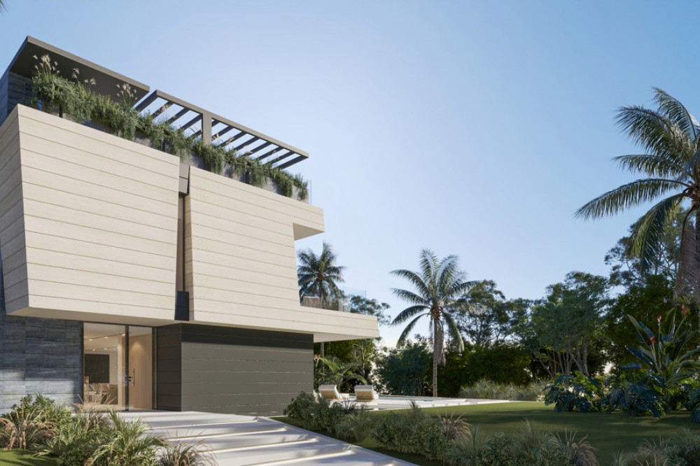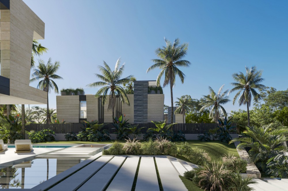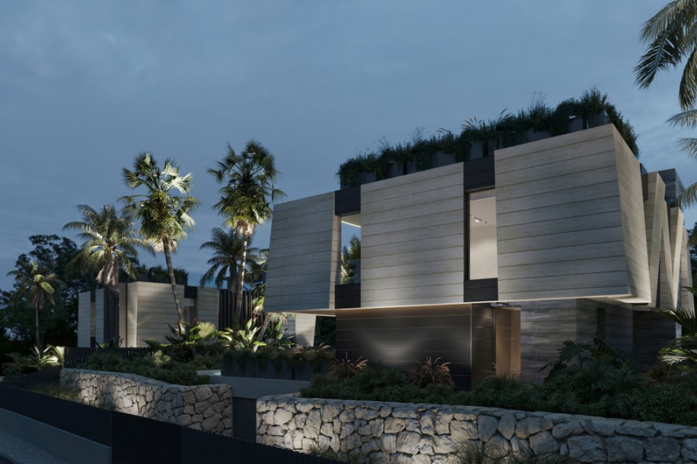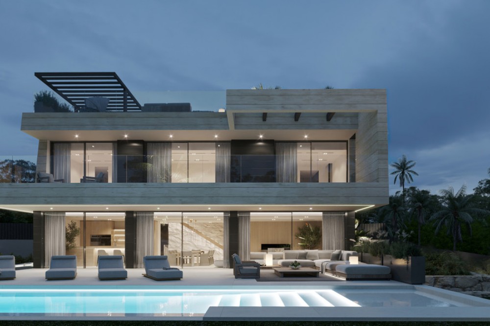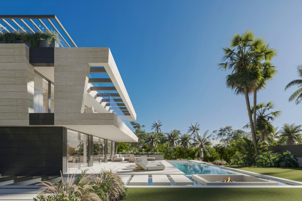 - New Development: Prices from €5,700,000 to €6,100,000. [Bedrooms: 5] [Bathrooms: 5] [Built size: 1044m2 - 1132m2]. Three contemporary villas showcase cutting-edge architecture, expansive layouts, and the highest quality finishes. Designed with the latest technology specifications and delivered fully furnished, each residence features floor-to-ceiling windows, panoramic terraces, a private pool, landscaped gardens, and a rooftop chill-out area from where to enjoy the sea and mountain views. Spanning multiple levels, they offer open-plan designer kitchens, outdoor jacuzzi and underground garage. An oustanding masterpiece through close collaboration between developer Cosehisa, architectural firm ER Arquitectos and Spain Sotheby's International Realty.