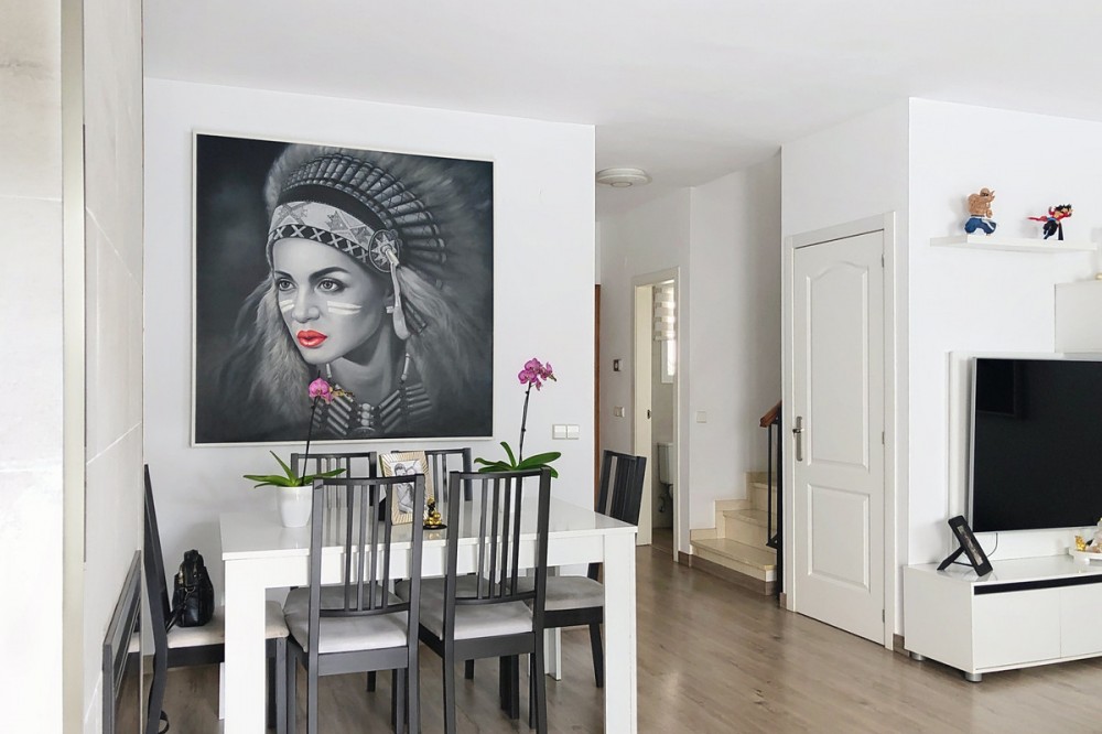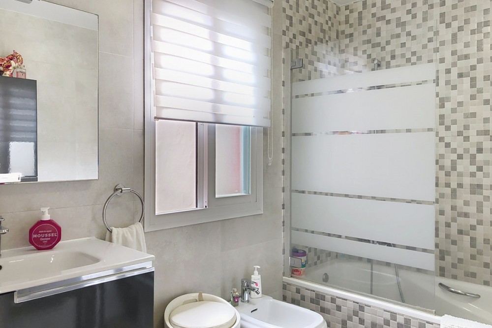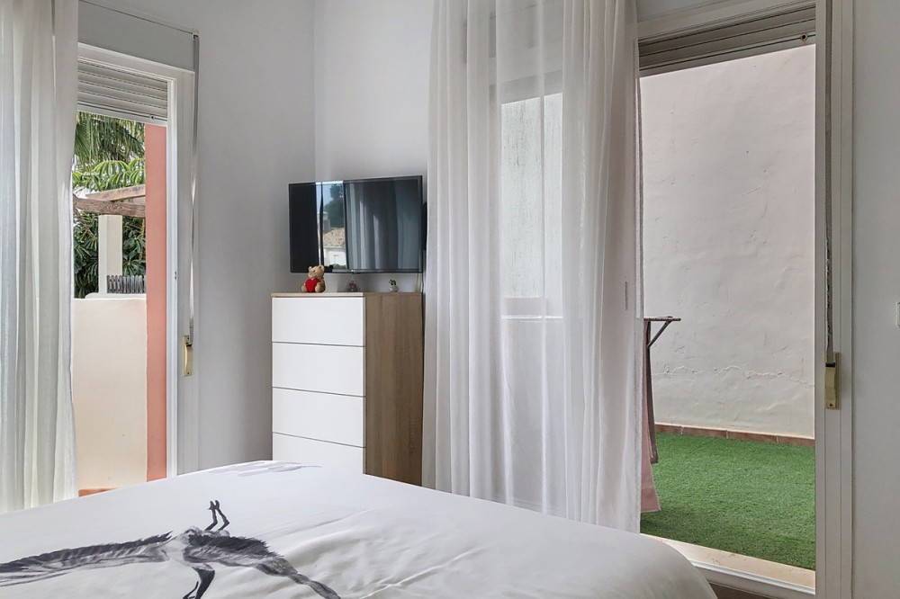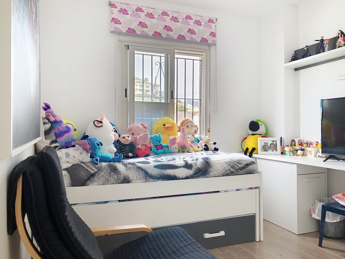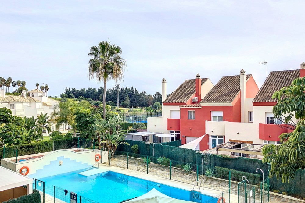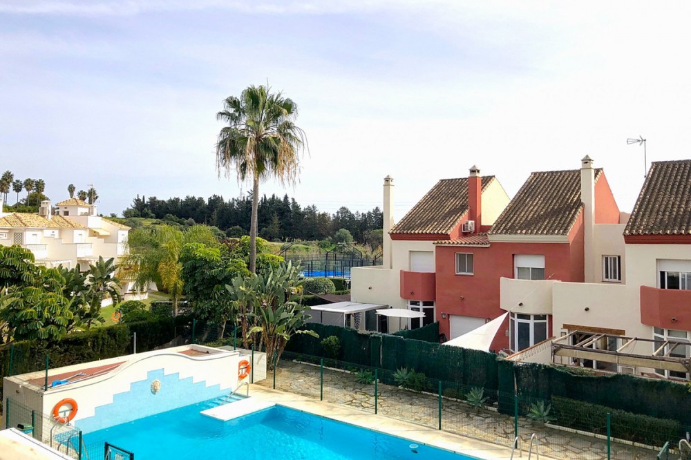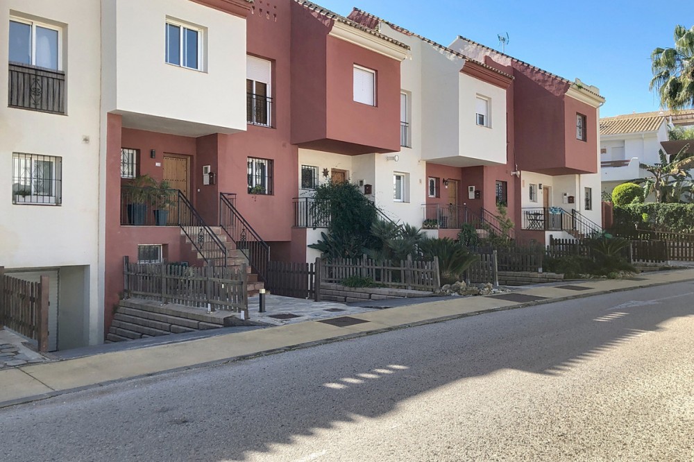 - Located in the peaceful and well-connected lower area of Selwo, this charming townhouse offers a fantastic opportunity for those seeking comfort, convenience, and future expansion possibilities. Nestled in East Estepona, it is just minutes from essential services, pristine beaches, golf courses, shops, and restaurants, making it an ideal choice for both year-round living and a holiday retreat. The main floor features a bright and inviting living room with a cozy fireplace, seamlessly flowing into the dining area. The fireplace includes a system that allows the generated heat to be distributed to other areas of the house including the bedrooms. The fully equipped and renovated kitchen is designed for practicality, while a bathroom with shower adds to the convenience of this level. The living area extends onto a private terrace, offering a tranquil outdoor space to relax or entertain. Upstairs, the home boasts three well-appointed bedrooms, each with built-in wardrobes for optimal storage. The spacious master bedroom benefits from two private terraces, creating additional areas to enjoy the fresh air and sunshine. A large family bathroom serves this floor, combining comfort and functionality. The lower level offers a versatile basement with a laundry area and a generous garage that can accommodate two cars. This space also presents excellent potential for customization, whether as a home gym, additional storage, or even an extra living area. Additional features include individual air conditioning in the living room, elegant marble flooring, and double-glazed windows. The property is situated within a well-maintained, family-friendly urbanization with lush gardens and a communal swimming pool. Well-preserved and move-in ready, this townhouse is an excellent investment in one of Estepona’s most desirable areas.