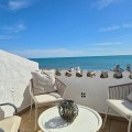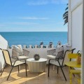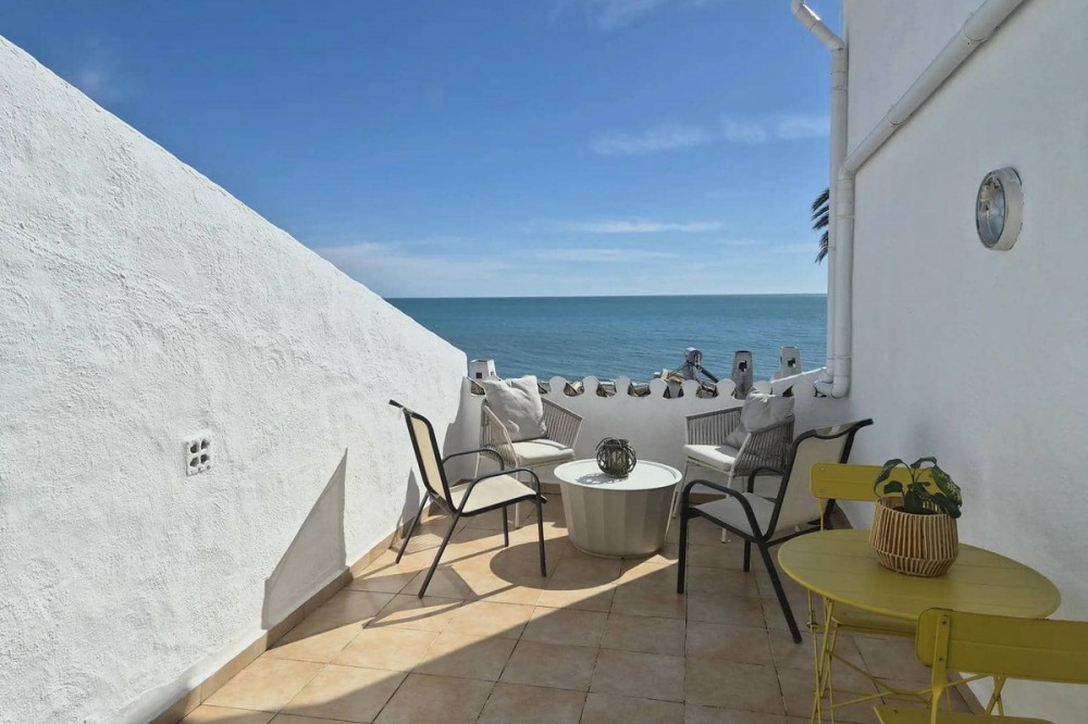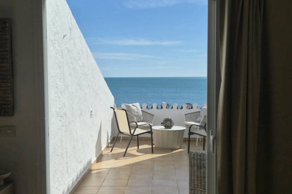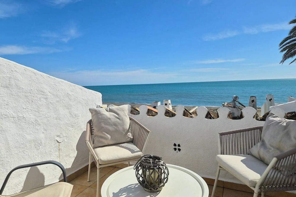 - Situated in a sought-after frontline beach complex, this property enjoys a truly fantastic position right by a quiet, unspoilt stretch of coastline. The apartment is within easy walking distance of the vibrant Estepona Marina, offering a wide selection of restaurants, cafés, and amenities, while the charming centre of Estepona is just a short drive away. This is an ideal location for those seeking both tranquillity and convenience, with the Mediterranean on your doorstep and all local services close at hand. This bright and spacious one-bedroom apartment welcomes you into an open-plan living area filled with natural light. Large windows frame lovely views over the communal pool and lush landscaped gardens, creating a relaxing atmosphere. To the right, the kitchen is neatly positioned in the corner and features a breakfast bar that connects seamlessly to the living space, making it perfect for hosting and socialising. Upstairs, the generous bedroom offers built-in wardrobes and an adjoining bathroom. Elegant glass French doors open to stunning sea views, allowing you to wake up and enjoy the Mediterranean from the comfort of your bed. The apartment boasts a beautiful and spacious terrace with direct sea views and panoramic outlooks towards Estepona. This wonderful outdoor space is perfect for dining, relaxing, and enjoying the peaceful surroundings. With direct access to the beach and set in a quiet, charming environment, this property is a true gem for those looking for a serene coastal lifestyle.