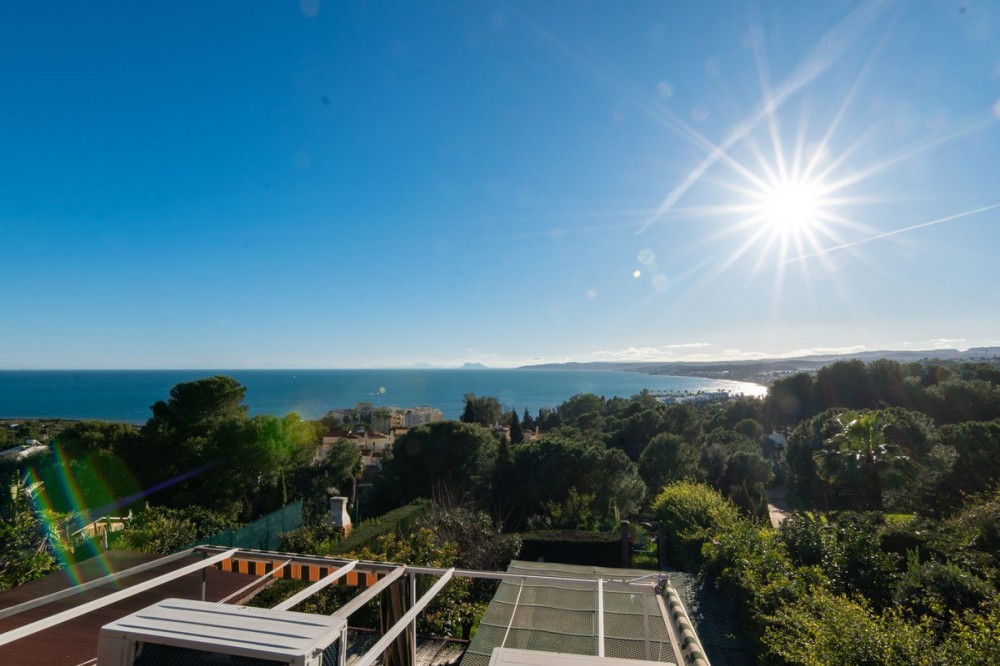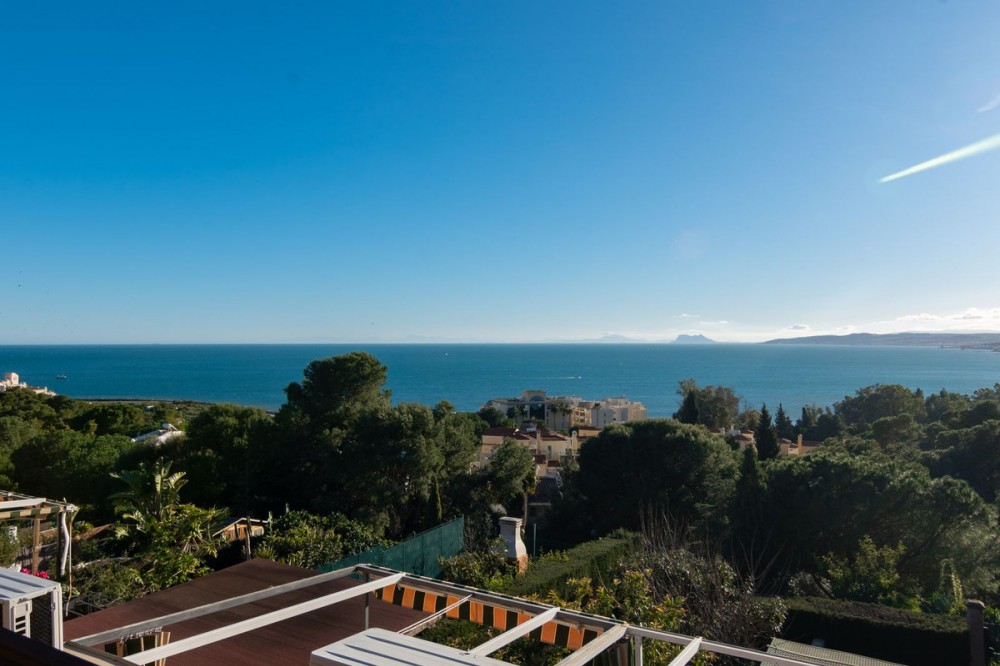 - Exclusive townhouse with stunning sea views located in the prestigious residential area of Seghers, one of Estepona’s most sought-after locations thanks to its tranquillity and its close proximity to the Marina, Playa del Cristo and the charming historic town centre. The property, offering 220 m² of built area and a south-facing orientation, stands out for its brightness, generous space and spectacular panoramic views of the Mediterranean, Gibraltar and Africa, which can be enjoyed from several rooms and terraces. The house is distributed over several levels. The main floor features a fully fitted kitchen, guest toilet and a spacious, light-filled living and dining area with direct access to a pleasant terrace with open sea views, perfect for sunny breakfasts or sunset dinners. On the upper level there is a large attic-style bedroom with private toilet and exceptional views. On the lower level you will find the spacious master bedroom with en-suite bathroom, two additional bedrooms and another full bathroom, with direct access to the private outdoor area consisting of a cosy 27 m² porch and a 33 m² garden, an ideal space to enjoy the Costa del Sol climate all year round. The property also benefits from a large multifunctional basement including a lounge area, games space, laundry room and storage, providing valuable additional living space for family life. Features include air conditioning, a solar hot water system and private parking directly at the entrance of the property. As an important added value, the owner includes the share in Club Babylon, allowing access to its swimming pool and communal facilities for a montly fee. An ideal property as a permanent residence, holiday home by the sea or a secure investment in one of Estepona’s finest residential areas. The render pictures are just to see how it would look if a total reform was carried out.