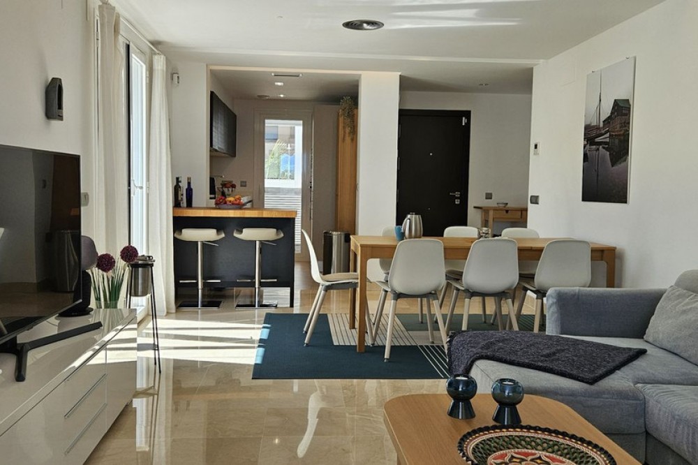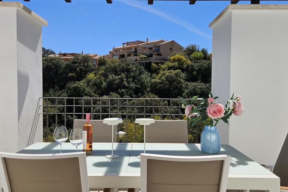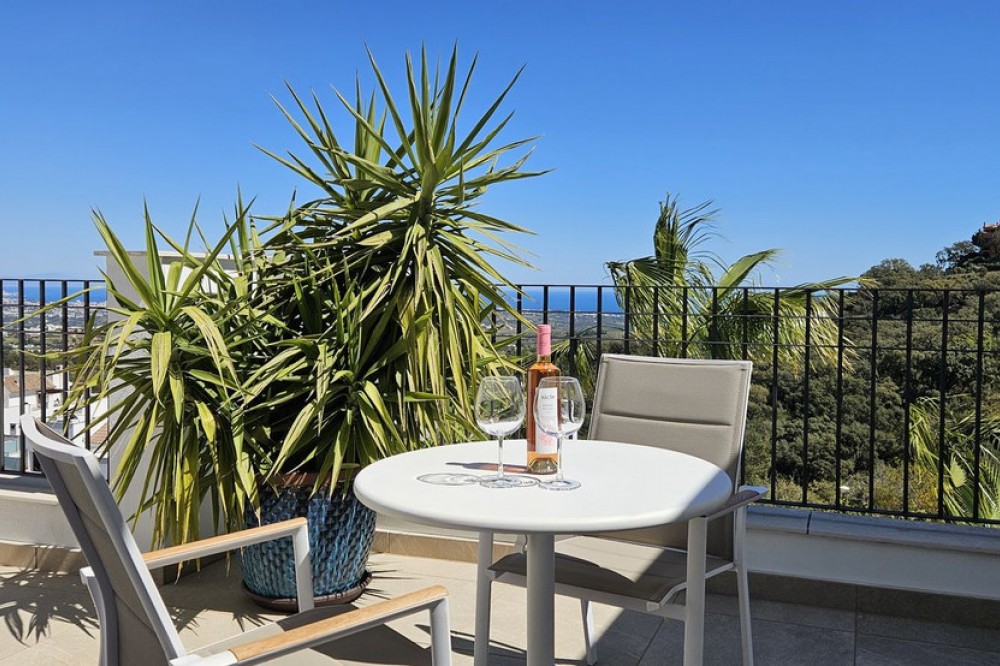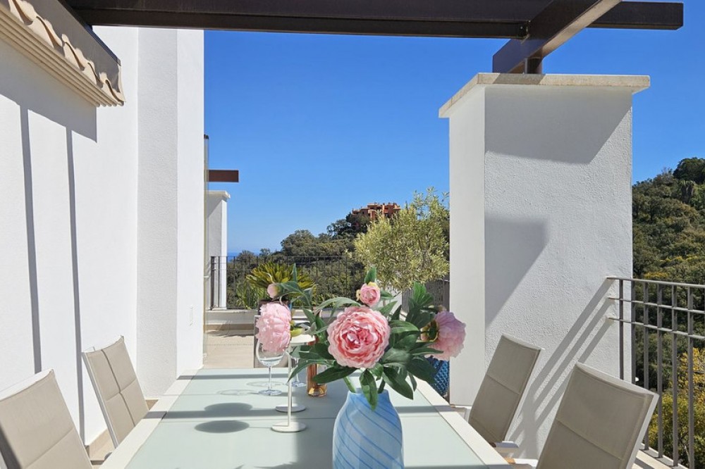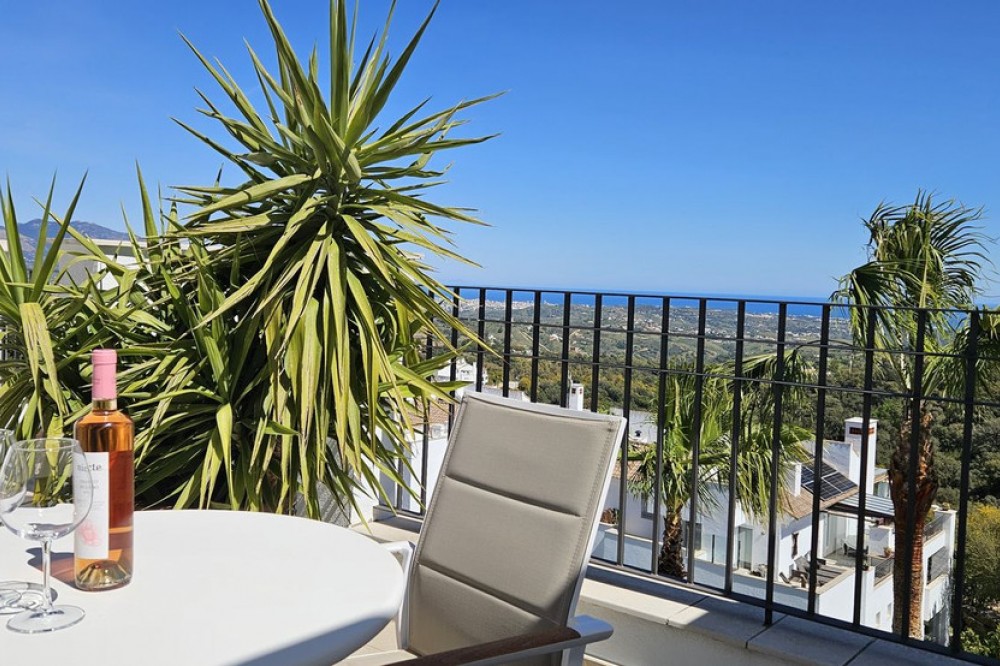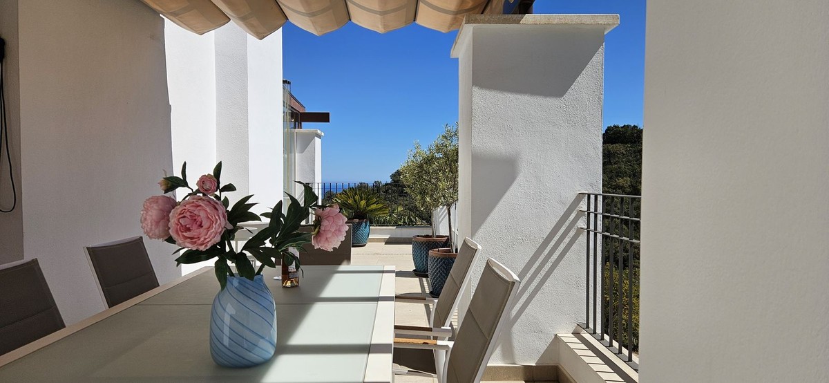 - Panoramic Sea-View Penthouse on One Level – Seamless Indoor-Outdoor Living This modern one-level penthouse enjoys breathtaking panoramic sea views and is located within a protected UNESCO biosphere area, ensuring a unique natural setting, preserved surroundings and a sense of tranquility that will remain untouched over time — a truly special environment on the Costa del Sol. Designed for relaxed Mediterranean living, the home offers a strong connection between indoor and outdoor spaces. While the layout is both comfortable and functional, the property truly stands out for its beautifully maintained interior, presented in immaculate, showhome condition throughout. The true highlight, however, is the expansive L-shaped terrace, which is as generous as the living area itself and invites you to enjoy life outdoors all year round. The current owners have enhanced part of the terrace with high-quality glass curtains, creating a versatile additional living space that can be enjoyed in all seasons — ideal for cooler evenings while still making the most of the views. The property offers three bedrooms and two bathrooms, including a master bedroom with en-suite. The open-plan living and kitchen area creates a bright and practical living space, with direct access to the terrace from both the living room and the kitchen — ideal for everyday living, alfresco dining and enjoying the views. As part of the community, owners benefit from full access to the El Soto Clubhouse facilities, including a golf course, tennis & padle court and a gym — ideal for enjoying an active lifestyle. The clubhouse also features a popular restaurant, available to residents on a pay-per-use basis. A lovely penthouse with panoramic sea views, exceptional outdoor areas, pristine interiors and access to resort-style facilities — perfect as a holiday home, permanent residence or investment on the Costa del Sol.