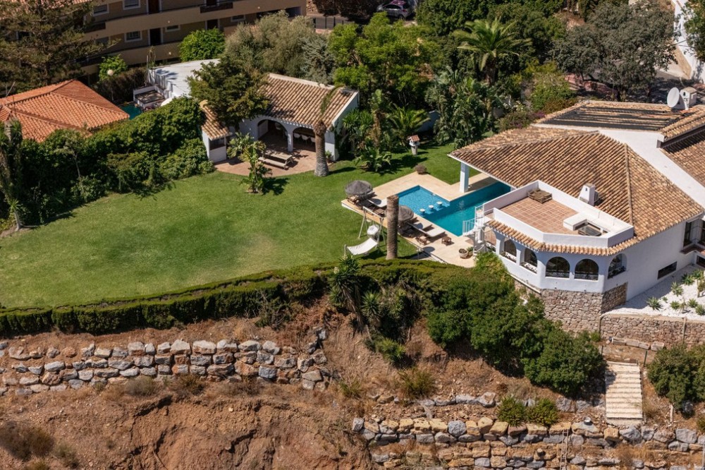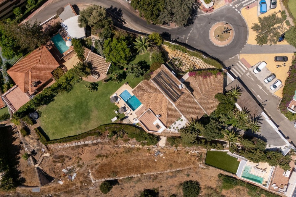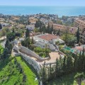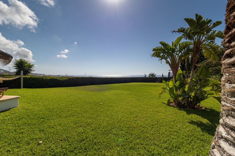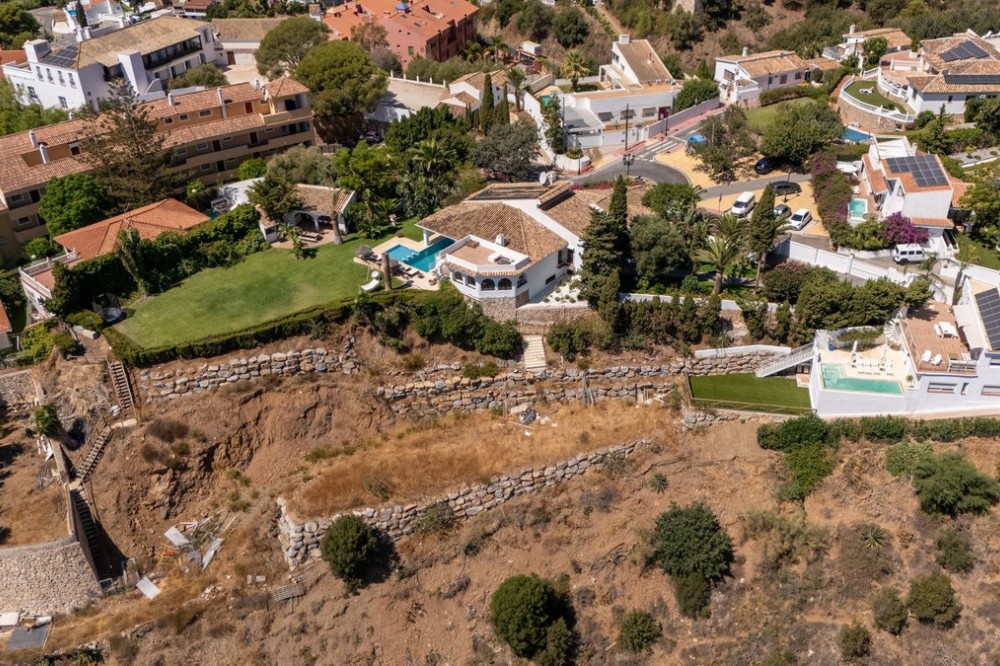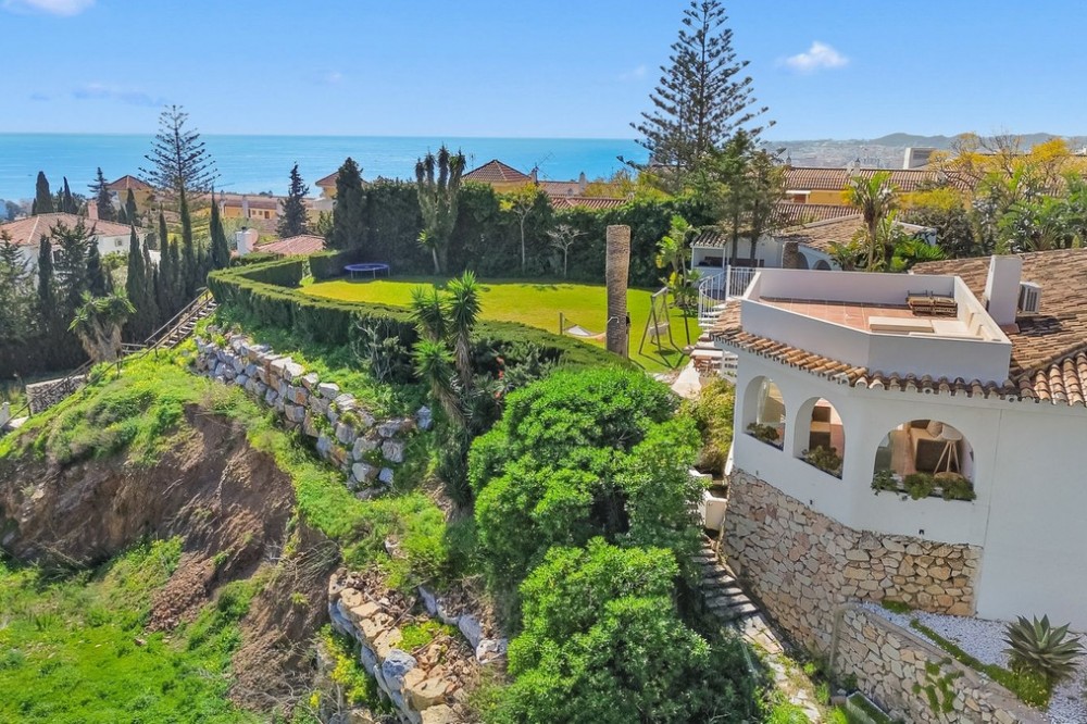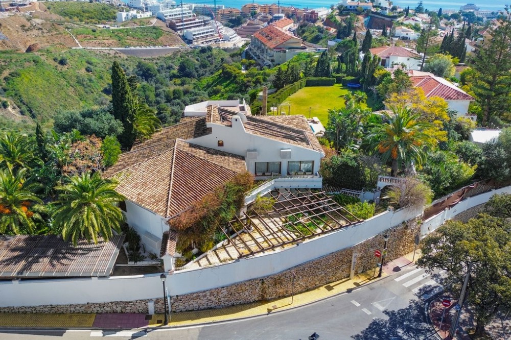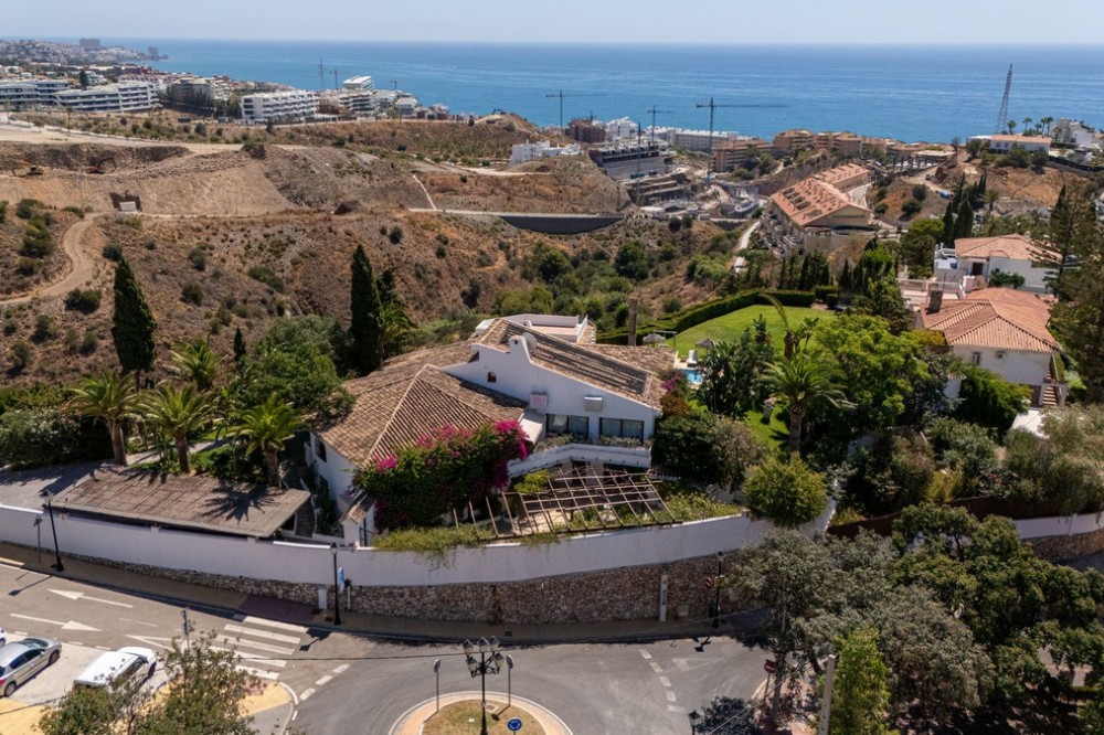 - **Panoramic 6-Bedroom Villa with Protected Green Border & 2,100 m² Plot – El Higuerón / El Majadal** Set in a commanding hilltop position above El Higuerón and El Majadal, this exceptional villa offers the feeling of a private lookout with uninterrupted open views and absolute privacy. Bordering a protected green zone of the Junta de Andalucía to the east—where the Arroyo Zaragoza natural corridor runs—the setting guarantees preserved surroundings that are increasingly rare so close to all services. From the property, enjoy deep panoramic views over the Mediterranean Sea and the mountains of Benalmádena and Mijas. On clear days, the horizon stretches as far as Sierra Nevada and the Sierras of Tejeda, Almijara and Alhama. Thanks to existing view easements over the southern neighboring property, the sea views are structurally protected, reinforcing the long-term value of the asset. Located just 1 km in a straight line from the sea, the villa combines elevation (privacy, breeze, open horizon) with true beach proximity. Only 150 meters away, a scenic pedestrian access connects to Carvajal Beach via “El Sendero del Mar,” a beautiful ~700 m coastal walking route. With 2,100 m² of land and approximately 680 m² built, the scale of the property is uncommon in this consolidated urban area where large plots with privacy and views are increasingly scarce. The layout offers 6 bedrooms, 5 bathrooms and 2 guest toilets distributed over two levels, with the main living areas designed for comfortable single-level living. **Main Floor** Entrance hall, guest toilet, master suite with walk-in wardrobe, fireplace and en-suite bathroom; open kitchen with dining area; additional en-suite bedroom; spacious double-height living room with large fireplace and library; separate sitting room; laundry and pantry area. **Lower Floor** Entrance hall, storage room, en-suite bedroom, two additional bedrooms sharing a bathroom, 90 m² multi-purpose room (cinema, gym, etc.), and a guest apartment with en-suite bathroom and kitchenette. The design allows full day-to-day living on the main floor—ideal for comfort and reduced mobility—while the lower level can function independently for guests, family members or staff. **Outdoor Areas** Multiple terraces, interior patio with fountain and mature citrus trees, glazed porch with panoramic sunrise views year-round, summer dining area for up to 14 guests with outdoor kitchen and guest toilet. A separate 35 m² garden studio (currently used as a yoga room) sits within a 230 m² garden area and has independent street access—ideal as an office or creative space. The mature garden features species over 40 years old. Covered parking for 5 vehicles. There is also the possibility to build a rooftop structure in the solarium area, creating a potential 360° panoramic experience including views towards Fuengirola and Marbella. An additional 500 m² plot with 135 m² buildability plus terraces can be acquired separately, with access from Calle Águila or directly from the main property. This offers expansion potential or use as a guest house, large covered carport (for collectors or large vehicles), gym or storage. Alternatively, the buildability could be transferred to the main 2,100 m² plot, increasing total potential to approximately 2,600 m² of land. A rare opportunity to secure a private, structurally protected panoramic estate in one of the most connected yet naturally preserved areas of the Costa del Sol.