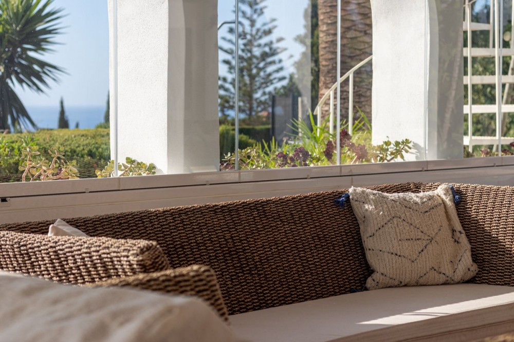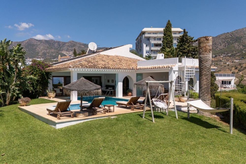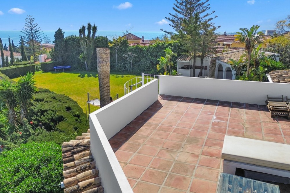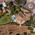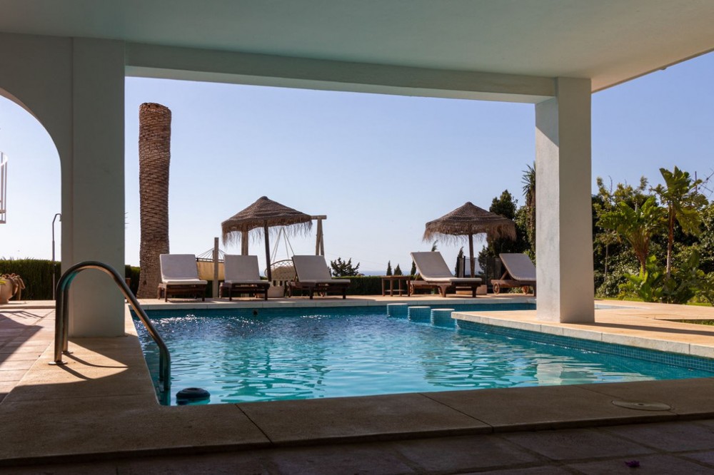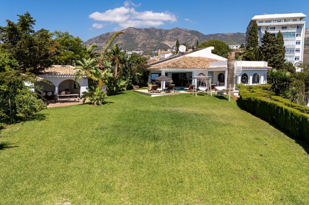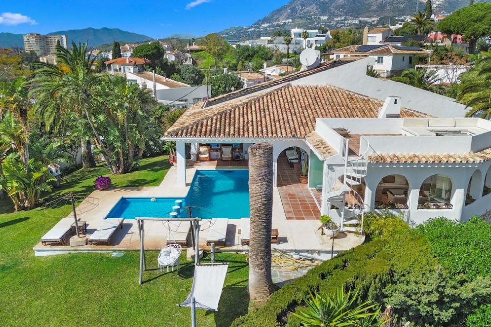 - **Panoramic 6-Bedroom Villa with Protected Green Border & 2,100 m² Plot – El Higuerón / El Majadal** Set in a commanding hilltop position above El Higuerón and El Majadal, this exceptional villa offers the feeling of a private lookout with uninterrupted open views and absolute privacy. Bordering a protected green zone of the Junta de Andalucía to the east—where the Arroyo Zaragoza natural corridor runs—the setting guarantees preserved surroundings that are increasingly rare so close to all services. From the property, enjoy deep panoramic views over the Mediterranean Sea and the mountains of Benalmádena and Mijas. On clear days, the horizon stretches as far as Sierra Nevada and the Sierras of Tejeda, Almijara and Alhama. Thanks to existing view easements over the southern neighboring property, the sea views are structurally protected, reinforcing the long-term value of the asset. Located just 1 km in a straight line from the sea, the villa combines elevation (privacy, breeze, open horizon) with true beach proximity. Only 150 meters away, a scenic pedestrian access connects to Carvajal Beach via “El Sendero del Mar,” a beautiful ~700 m coastal walking route. With 2,100 m² of land and approximately 680 m² built, the scale of the property is uncommon in this consolidated urban area where large plots with privacy and views are increasingly scarce. The layout offers 6 bedrooms, 5 bathrooms and 2 guest toilets distributed over two levels, with the main living areas designed for comfortable single-level living. **Main Floor** Entrance hall, guest toilet, master suite with walk-in wardrobe, fireplace and en-suite bathroom; open kitchen with dining area; additional en-suite bedroom; spacious double-height living room with large fireplace and library; separate sitting room; laundry and pantry area. **Lower Floor** Entrance hall, storage room, en-suite bedroom, two additional bedrooms sharing a bathroom, 90 m² multi-purpose room (cinema, gym, etc.), and a guest apartment with en-suite bathroom and kitchenette. The design allows full day-to-day living on the main floor—ideal for comfort and reduced mobility—while the lower level can function independently for guests, family members or staff. **Outdoor Areas** Multiple terraces, interior patio with fountain and mature citrus trees, glazed porch with panoramic sunrise views year-round, summer dining area for up to 14 guests with outdoor kitchen and guest toilet. A separate 35 m² garden studio (currently used as a yoga room) sits within a 230 m² garden area and has independent street access—ideal as an office or creative space. The mature garden features species over 40 years old. Covered parking for 5 vehicles. There is also the possibility to build a rooftop structure in the solarium area, creating a potential 360° panoramic experience including views towards Fuengirola and Marbella. An additional 500 m² plot with 135 m² buildability plus terraces can be acquired separately, with access from Calle Águila or directly from the main property. This offers expansion potential or use as a guest house, large covered carport (for collectors or large vehicles), gym or storage. Alternatively, the buildability could be transferred to the main 2,100 m² plot, increasing total potential to approximately 2,600 m² of land. A rare opportunity to secure a private, structurally protected panoramic estate in one of the most connected yet naturally preserved areas of the Costa del Sol.