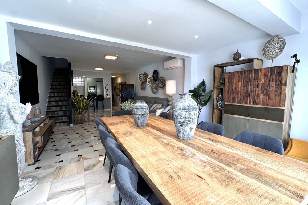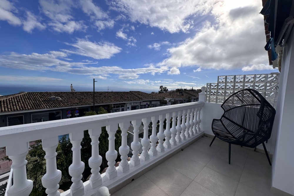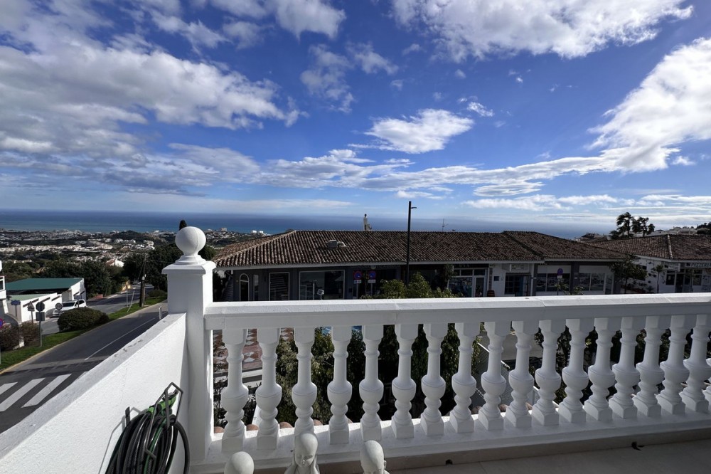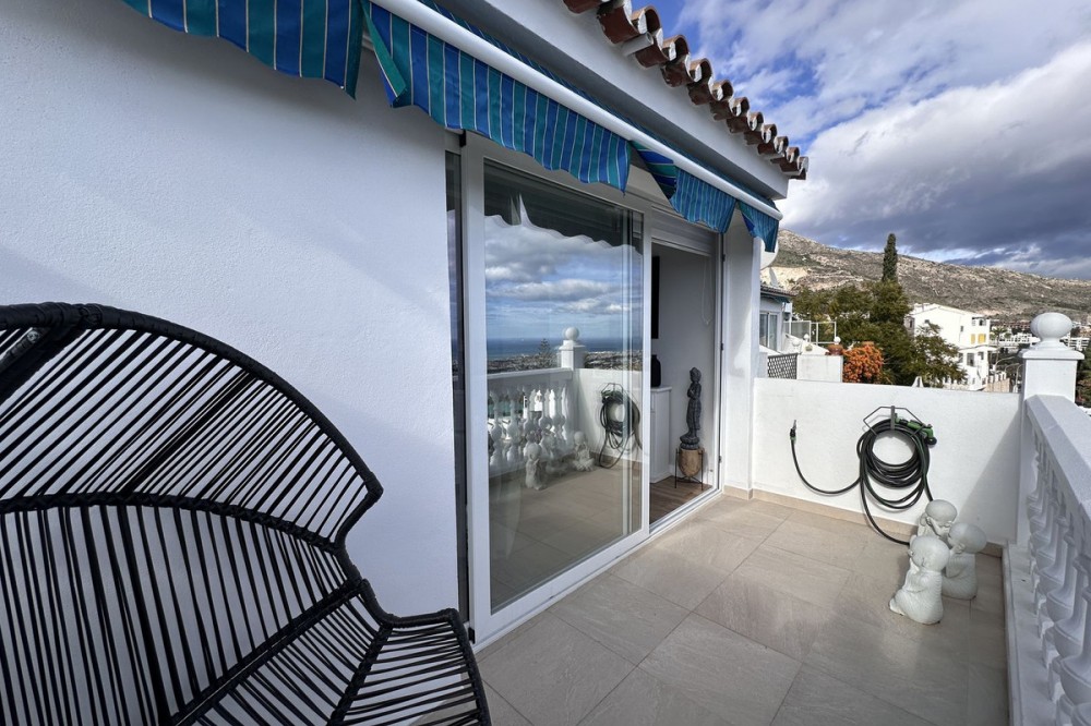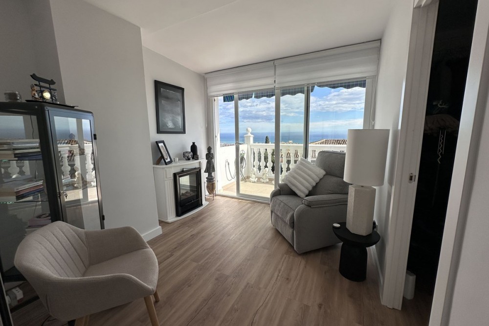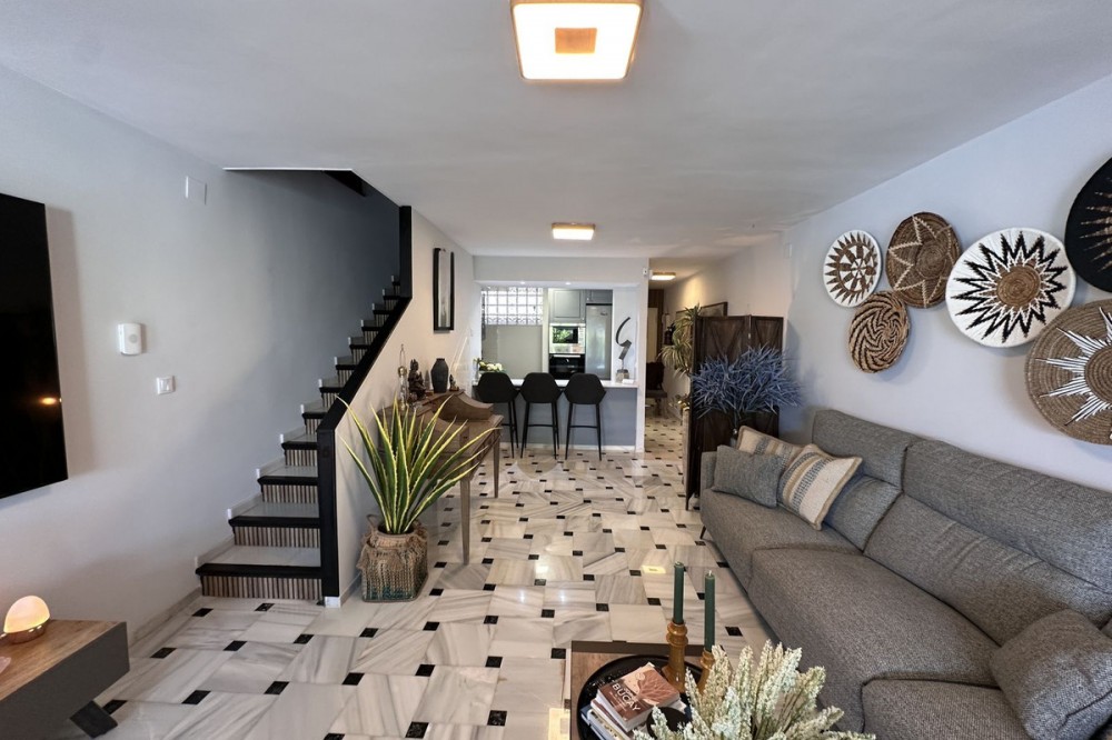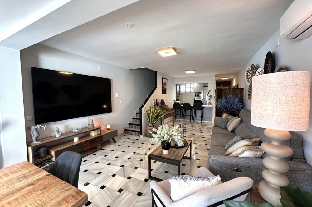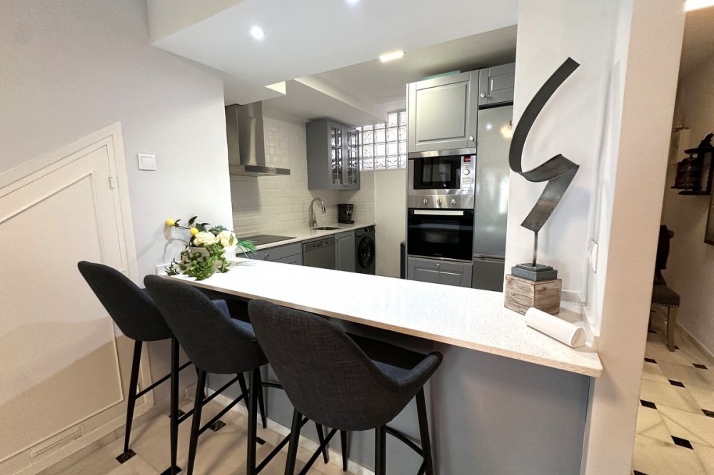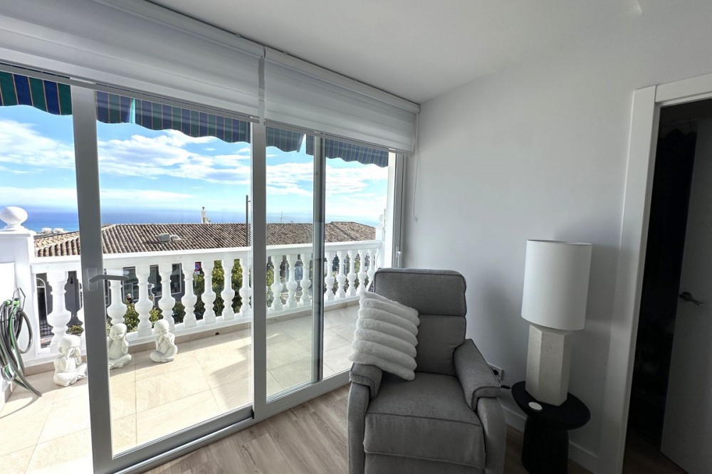 - Located in one of the most charming and peaceful areas of Benalmádena Pueblo, this elegant townhouse offers privacy, natural light and breathtaking Mediterranean sea views. The property is distributed over two comfortable levels and is ideal as a permanent residence, holiday home, or investment on the Costa del Sol. Main Floor Upon entering, you are welcomed by a spacious and bright open-plan living and dining area, perfect for entertaining or relaxing in total comfort. Large sliding doors connect the interior with a generous private patio, ideal for al fresco dining or creating a chill-out space. The modern open-plan kitchen has been completely renovated with a contemporary design and high-quality finishes, ready to move in. This level also includes a guest bathroom. Upper Floor Upstairs, the property features: Two spacious double bedrooms with built-in wardrobes A full bathroom An impressive walk-in dressing room, the size of an additional bedroom From this level, you access the upper terrace, where you can enjoy spectacular open views of the Mediterranean Sea — a perfect setting for morning coffee or sunset evenings. Additional Features Outdoor private parking space Beautiful communal swimming pool Very quiet residential area Excellent natural light throughout the day This home combines Andalusian charm with modern comfort in a serene environment, just minutes from the village center, beaches, and Málaga airport. A unique opportunity to own a sea-view property in one of the most sought-after locations on the Costa del Sol. For further information or to arrange a private viewing, please contact us.
