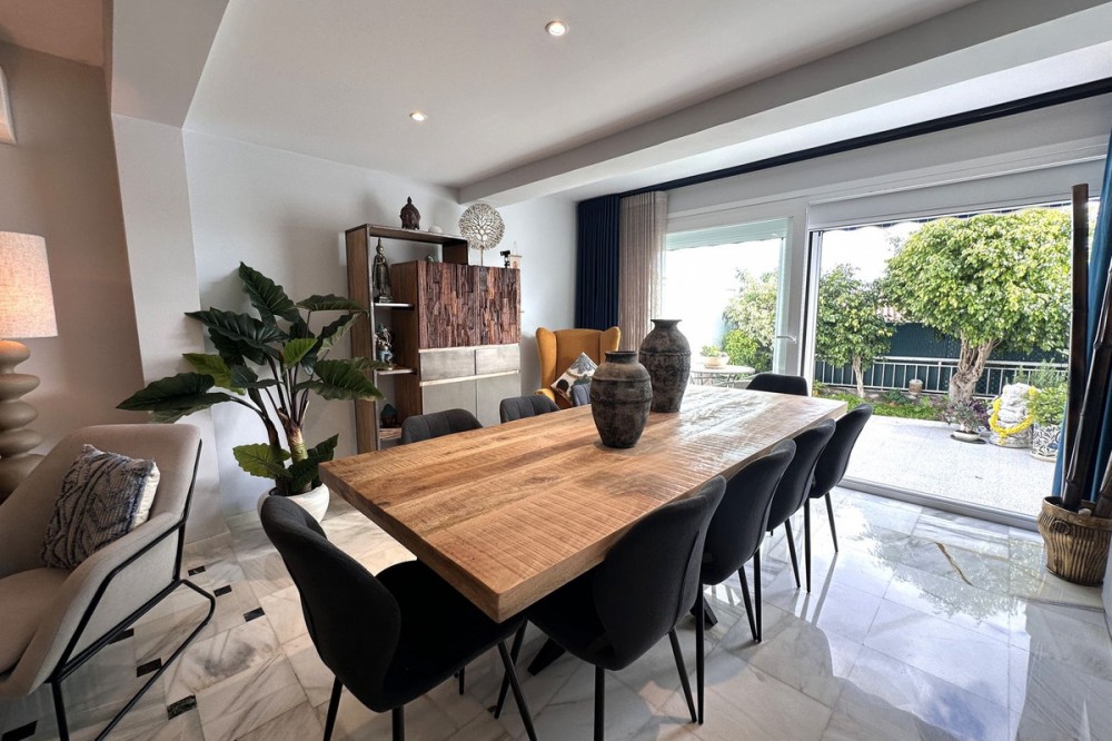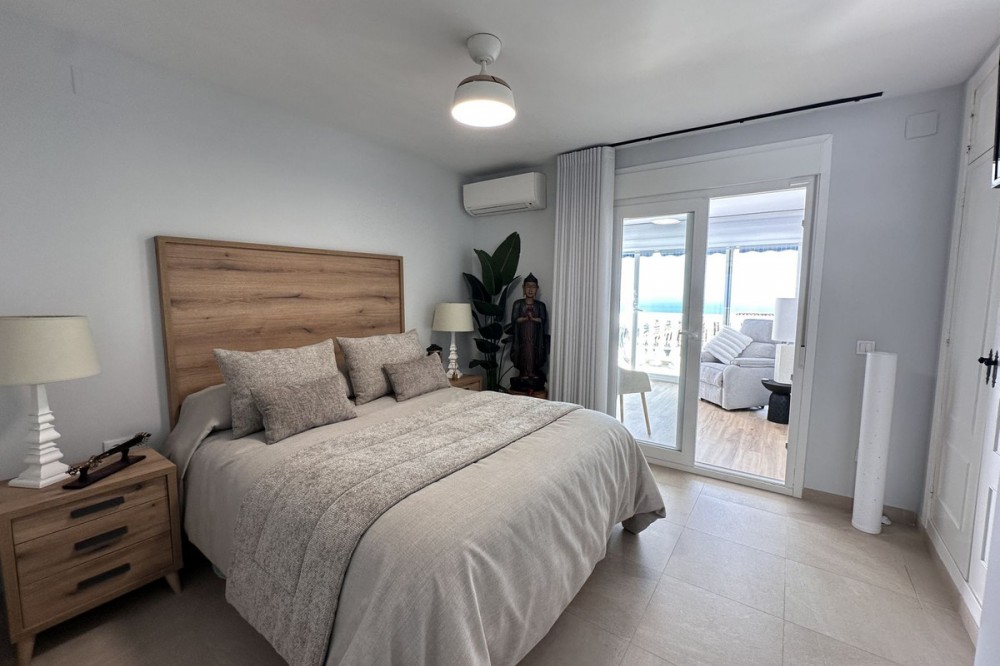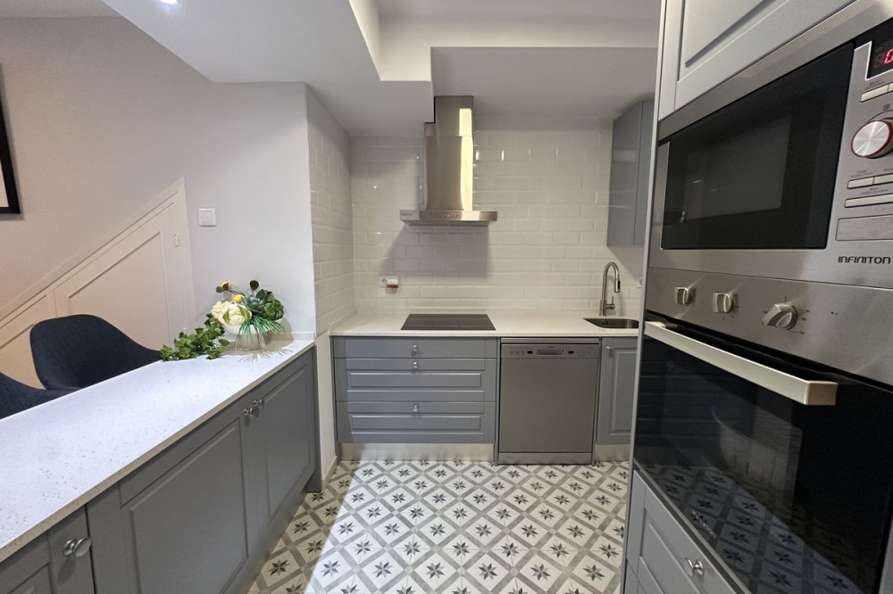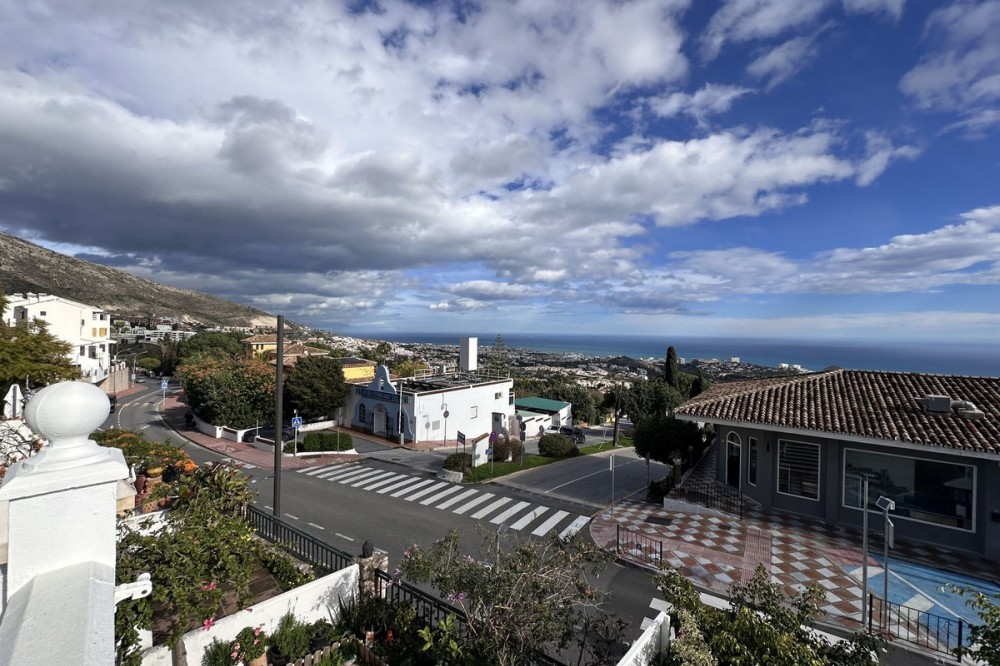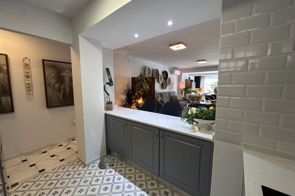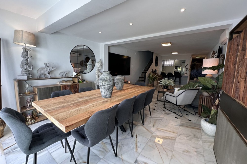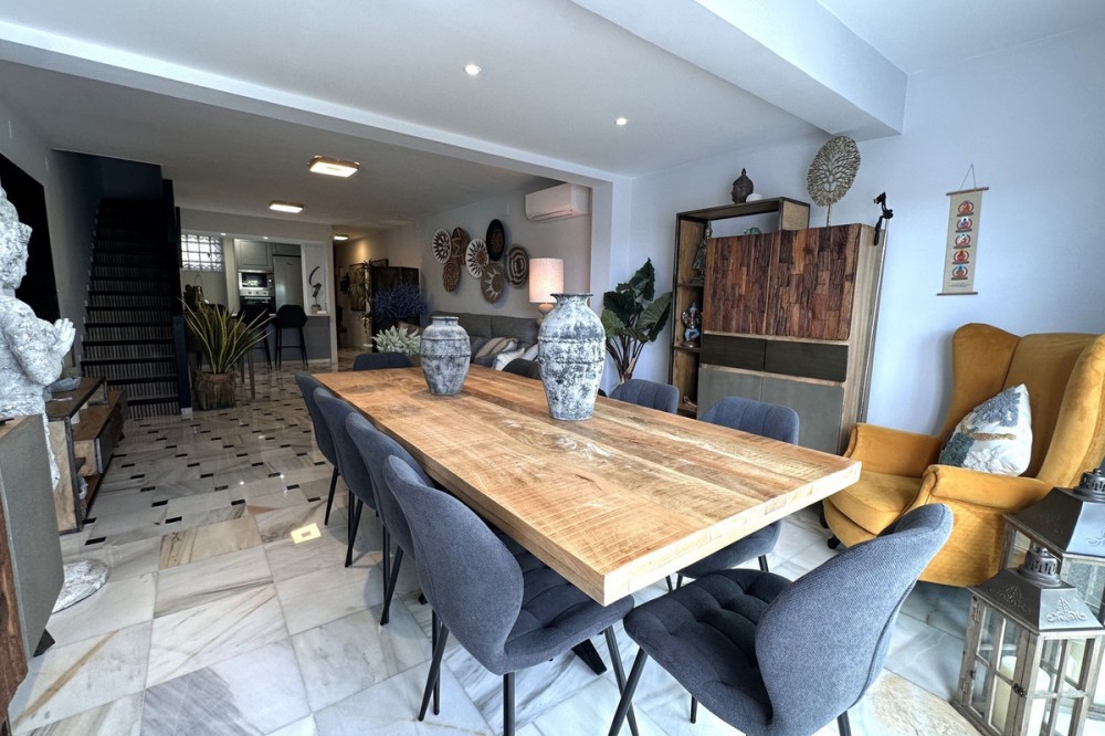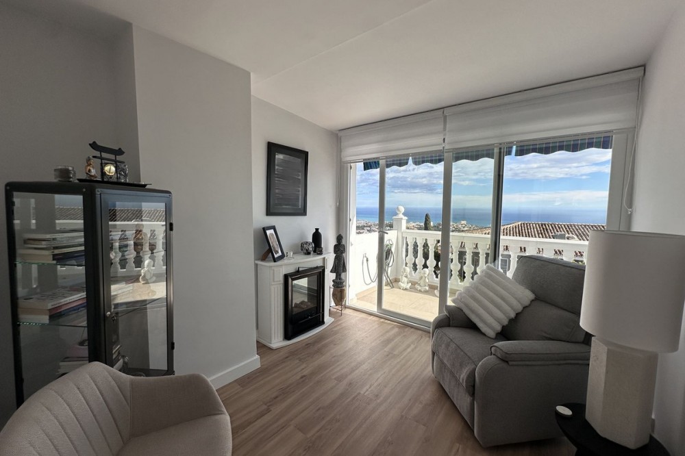 - Located in one of the most charming and peaceful areas of Benalmádena Pueblo, this elegant townhouse offers privacy, natural light and breathtaking Mediterranean sea views. The property is distributed over two comfortable levels and is ideal as a permanent residence, holiday home, or investment on the Costa del Sol. Main Floor Upon entering, you are welcomed by a spacious and bright open-plan living and dining area, perfect for entertaining or relaxing in total comfort. Large sliding doors connect the interior with a generous private patio, ideal for al fresco dining or creating a chill-out space. The modern open-plan kitchen has been completely renovated with a contemporary design and high-quality finishes, ready to move in. This level also includes a guest bathroom. Upper Floor Upstairs, the property features: Two spacious double bedrooms with built-in wardrobes A full bathroom An impressive walk-in dressing room, the size of an additional bedroom From this level, you access the upper terrace, where you can enjoy spectacular open views of the Mediterranean Sea — a perfect setting for morning coffee or sunset evenings. Additional Features Outdoor private parking space Beautiful communal swimming pool Very quiet residential area Excellent natural light throughout the day This home combines Andalusian charm with modern comfort in a serene environment, just minutes from the village center, beaches, and Málaga airport. A unique opportunity to own a sea-view property in one of the most sought-after locations on the Costa del Sol. For further information or to arrange a private viewing, please contact us.