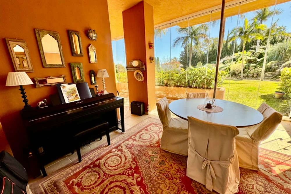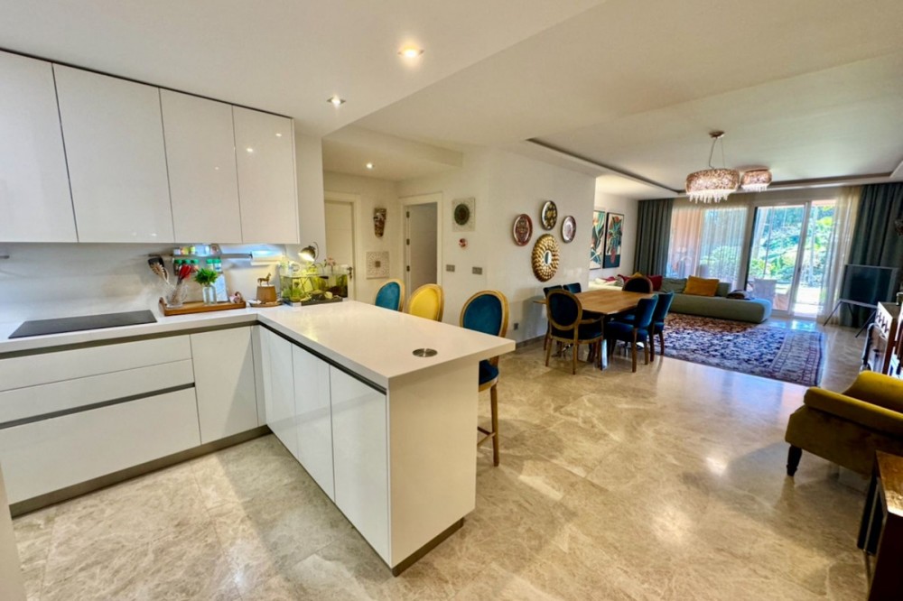 - Beautiful Ground floor apartment in Nueva Andalucía. Spacious 2-bedroom apartment located in gated complex Alminar de Marbella, Nueva Andalucía – the heart of Marbella’s Golf Valley. Big open-plan living and dining area with direct access to a private covered terrace and private garden with mountain and pool views. Modern fully equipped kitchen with Siemens appliances and utility/laundry room. Two bedrooms and two bathrooms, including a master suite with en-suite bathroom and direct access to the terrace and garden. Apartment has south-east orientation, has plenty of natural light throughout the day. Marble floors, underfloor heating throughout the apartment including bathrooms (water heating), and independent A/C systems (hot & cold). Underground garage space and storage are included in the price. Secure gated community surrounded by lush greenery and tranquility. The complex offers: • 24-hour security service • Three swimming pools with sunbathing areas • Beautifully landscaped tropical gardens • Easy access to nearby golf courses, restaurants, schools, and shops Just a short drive away, you will find Puerto Banús, Marbella town, and the surrounding beaches — making this the perfect residence or investment opportunity on the Costa del Sol. This apartment is ideal for those seeking an exclusive and peaceful lifestyle while being just minutes from all amenities and the beaches of Puerto Banús.