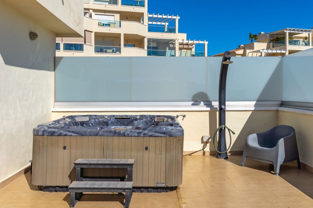 - PROPERTY HIGHLIGHTS: * Huge 157 m² terrace: A true "open-air living room" with a jacuzzi, outdoor shower, a cozy fireplace in the living room, and a separate covered dining area. * Modern and bright: The 103 m² interior features two bedrooms, two bathrooms, and a stylish modern kitchen. * Premium amenities: Central air conditioning keeps the home cool in summer, and underfloor heating in the bathrooms adds a touch of luxury to winter mornings. * All included in the price: The apartment includes 2 parking spaces with room for 3 cars and 2 storage rooms. LOCATION The apartment is located in the prestigious and peaceful Cerros del Águila area. Its impeccable construction offers residents a private garden and a wonderful swimming pool. For golf lovers, the location is perfect: the course is right next door! Basic information: * Address: Calle Buitre 107, Mijas * Apartment: 2 bedrooms, 2 bathrooms, kitchen, dining room * Area: 103 m² (interior) + 157 m² (terrace) * Monthly community fees: 208€ * Annual property tax (IBI): 463€ This is a unique opportunity to own an apartment with a terrace as large as the house itself!
