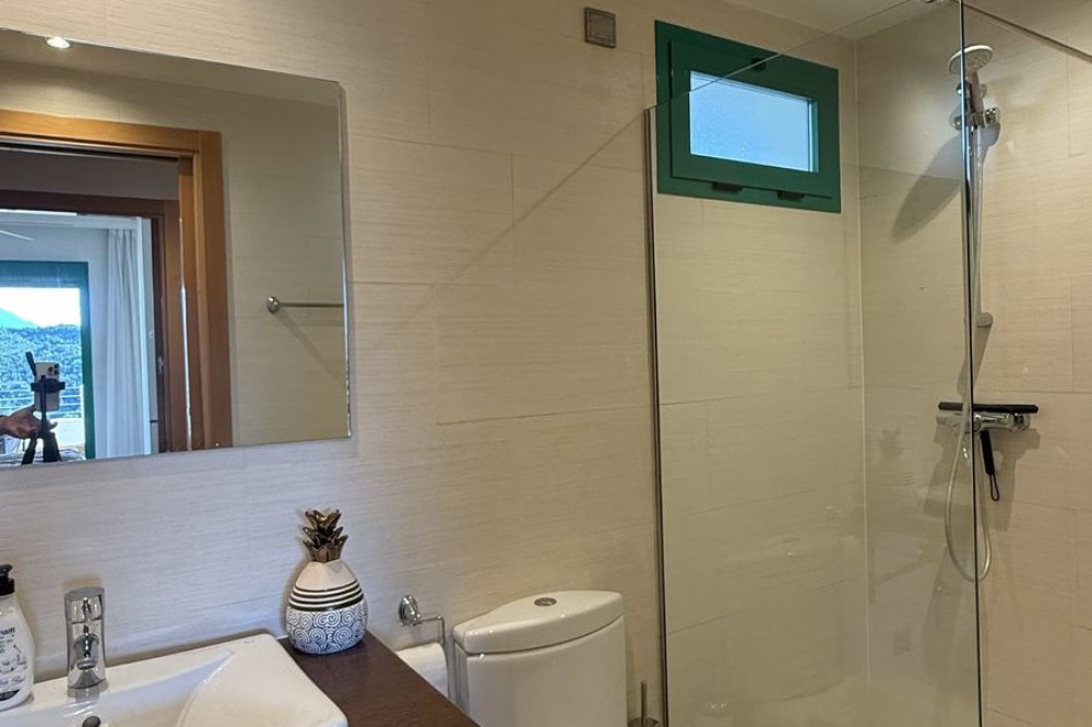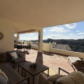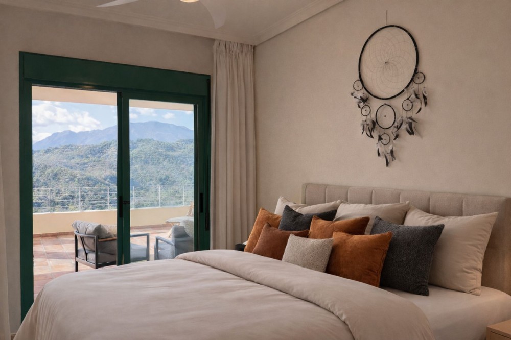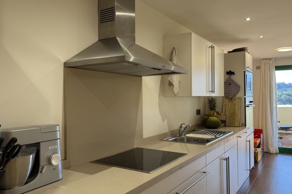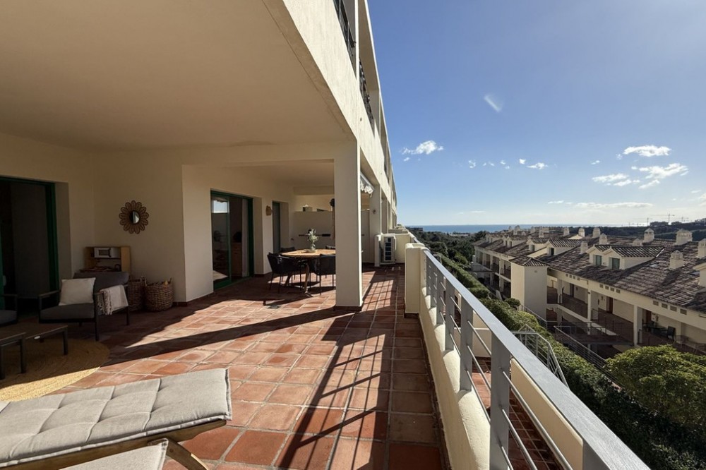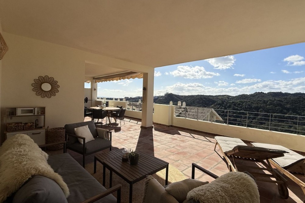 - You have beautiful panoramic views of the forest and mountains, as well as some sea views, from this bright and spacious middle-floor apartment, located in a quiet and well-kept community in popular Monte Selwo, east of Estepona. The kitchen is fully equipped with high-end appliances from Neff. The apartment offers 98 m² of living area and a large 60 m² very private southwest-facing terrace where you can enjoy the beautiful landscape in front of you and from where you fantastic sunsets, perfect for relaxing and taking in the beautiful views. The terrace is partly covered and partly open. Inside, you will find a good-sized living room and two bedrooms, with the master bedroom featuring an en-suite bathroom, as well as a total of two bathrooms and a fully equipped independent kitchen. All rooms, including the kitchen, have direct access to the huge terrace. There is a built-in AC system for both cooling and heating. The property also includes a generous underground parking space and an approximately 6 m² storage room. Short-term rentals are not allowed, which keeps the community peaceful and residential. The community fee is very attractive at just €120 per month. The area is especially popular with Nordic residents and offers easy access to shops, services, and main roads. A great option as a permanent home, holiday property, or long-term investment. Located east of Estepona, it is approximately 14 km to Puerto Banús and 12 km to Estepona town.