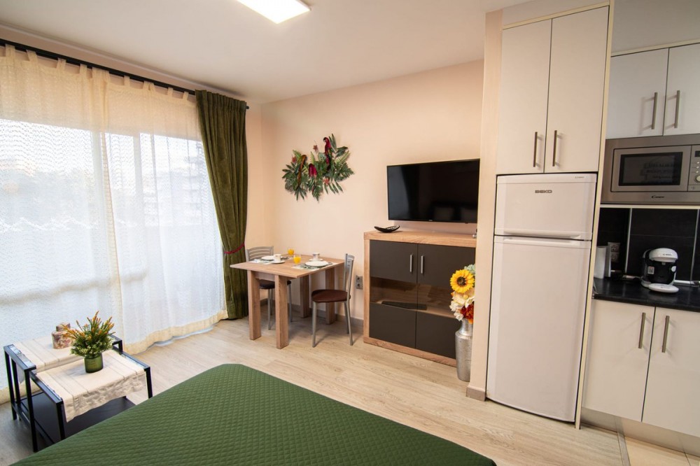 - Middle Floor Studio, Benalmadena, Costa del Sol. Built 33 m². with turistic licence. Setting : Close To Sea, Urbanisation, Front Line Beach Complex. Condition : Excellent. Pool : Communal. Features : Lift, Fitted Wardrobes, Near Transport, Private Terrace, Double Glazing, 24 Hour Reception. Kitchen : Fully Fitted. Garden : Communal. Security : Gated Complex, 24 Hour Security. Category : Investment, Reduced.