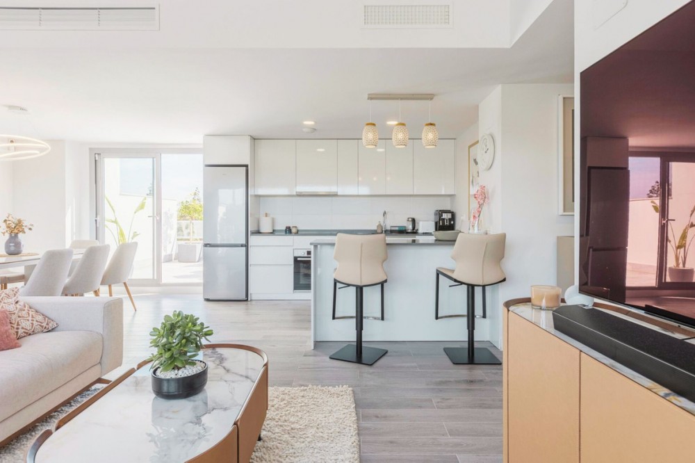 - Fully furnished and equipped, newly completed penthouse with four bedrooms and large terraces, ideal for discerning clients looking for comfort in a new gated development. The penthouse has about 119 sqm of indoor living space and more than 120 sqm of terrace space, giving a total of about 240 sqm of private living area. A spacious living room with kitchenette leads directly out onto the main terrace, while four bedrooms and three bathrooms provide comfort for family and guests alike. The property comes with two underground garage parking spaces and a storage unit. There are three terraces with different exposures, so you can enjoy the sun all day long – the perfect place for a chill‑out zone, outdoor dining and private loungers. The interiors are new, furnished and ready to move into, with no need for additional renovations or finishes. 4 bedrooms, 3 bathrooms 3 terraces Total area of about 240 sqm Total outdoor area of about 128 sqm Premium furnishings and equipment. Key amenities of the estate: Outdoor pools (including infinity, recreational and sports pools with a swimming lane) and an indoor heated pool. Spa area: indoor swimming pool, Turkish bath, sauna / hammam – a full wellness area within the estate. Fully equipped gym + outdoor running / fitness trail. Social/gastro zone: a social/gourmet club room for gatherings with family and friends, often referred to as a “gastrobar” or “gourmet place.” Playground / padel court and putting green for golf, plus playgrounds and green areas with urban gardens. Amazing location: just 5 minutes to the beach, 20 minutes to Marbella and only 23 minutes from Malaga airport. There is also a short‑term rental option. A great investment opportunity and a dream vacation home all in one. https://youtu.be/iNnFjaH0HYQ