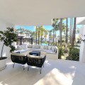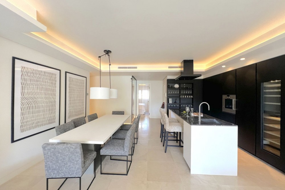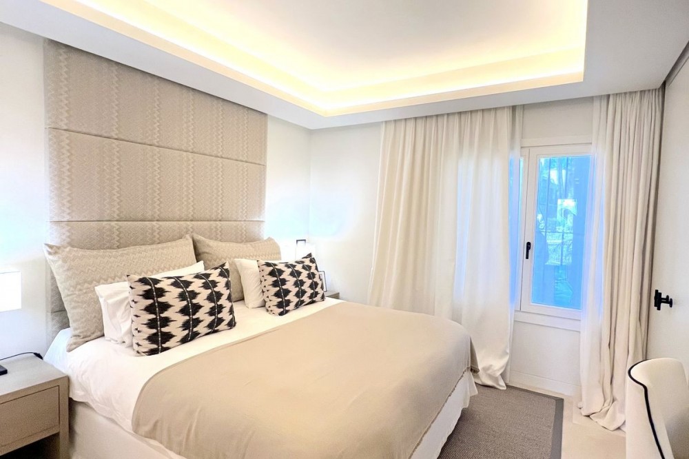 - Located in the prestigious Puente Romano – Jardines Japoneses, this exquisitely renovated ground-floor apartment offers a rare blend of elegance, comfort, and prime positioning. The property features a contemporary open-plan layout with a fully fitted designer kitchen seamlessly integrated into the spacious living and dining area, creating an ideal setting for both relaxation and entertaining. It comprises three generously sized bedrooms, each with its own en-suite bathroom, as well as a stylish guest toilet. One of the apartment’s standout features is its direct access to the communal swimming pool, providing a true resort-style living experience from the privacy of your own home. Additional highlights include underground parking and high-quality finishes throughout, making this a turnkey residence in one of Marbella’s most exclusive beachfront communities.