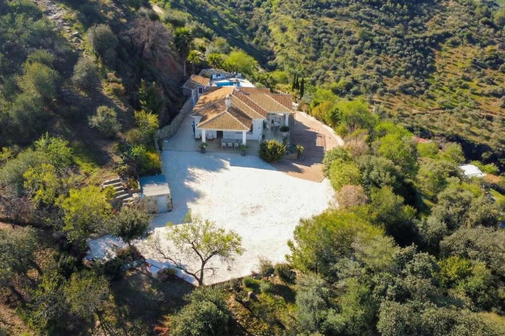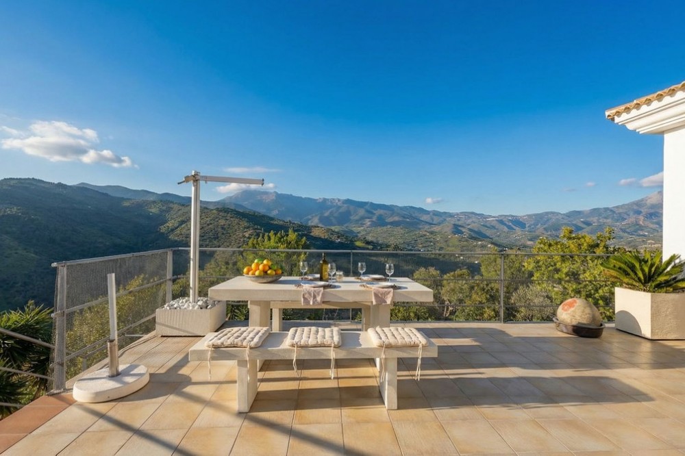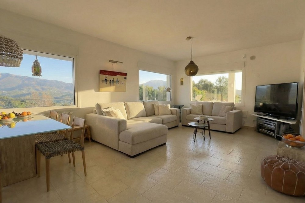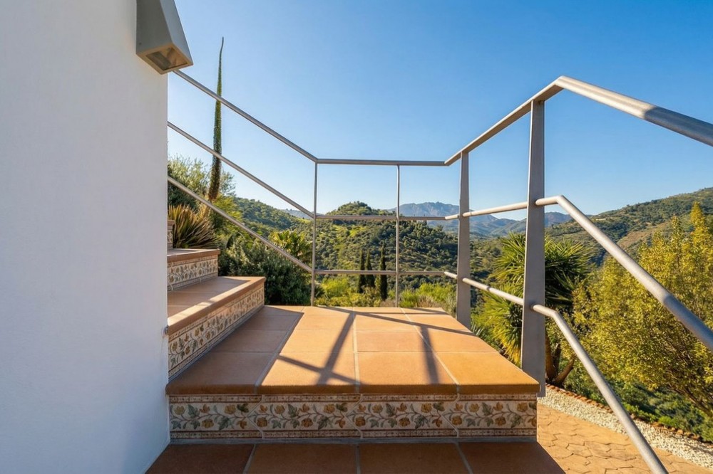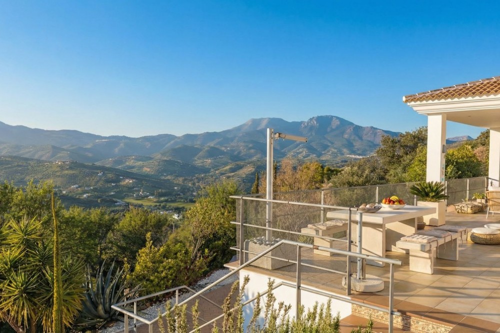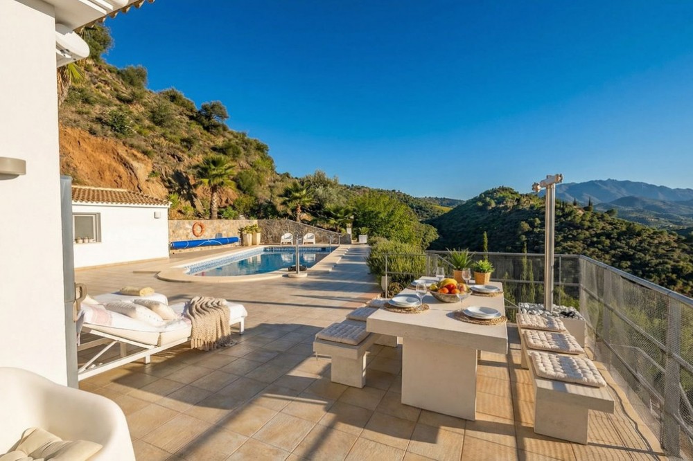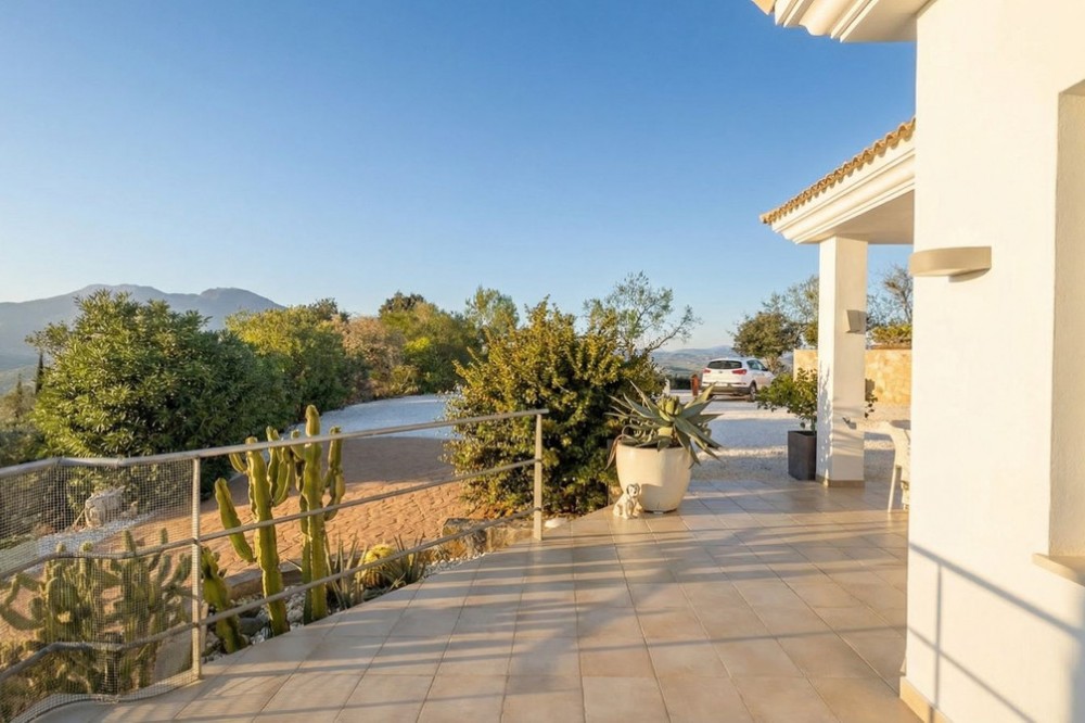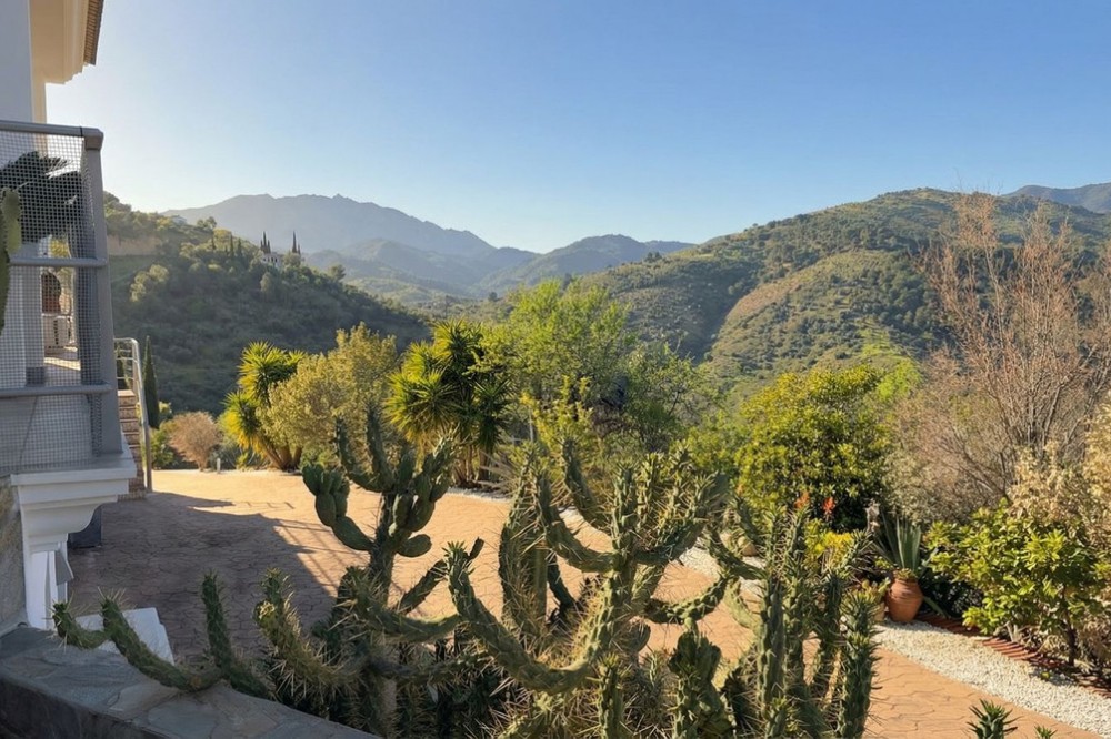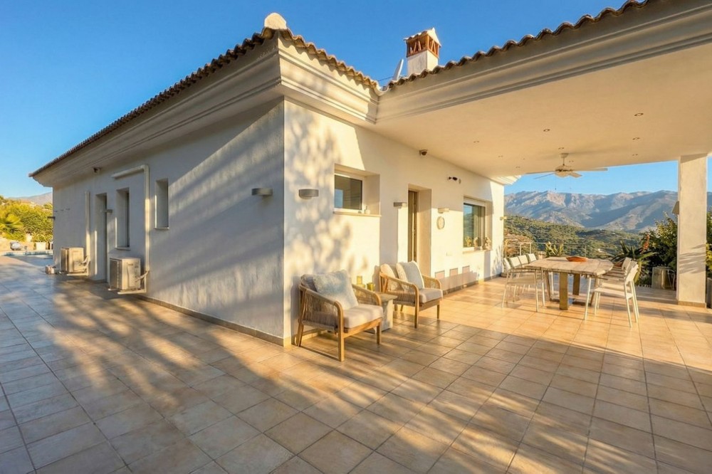- Modern Detached Villa in a Unique Location A modern detached villa, less than 17 years old, situated in a truly unique spot. Located just 25 km from the beaches of Marbella and only 5 minutes from the charming village of Guaro! During construction in 2009, the Dutch owners at the time left nothing to chance. The property was built to Northern European standards, featuring fully insulated floors, walls, and roofs. Only the finest materials were used, resulting in a perfect and unique country villa. Technical Highlights and Extras: Comfort: Central heating and air conditioning in all rooms. Quality: PVC window frames (tilt-and-turn) with double bulletproof glass, mosquito nets, and aluminum shutters. Exterior: 92 outdoor light points (individually adjustable via timers) and 32 outdoor water taps. Sustainability: Rainwater collection in an 8,000-liter reservoir. Security: Automatic gate with camera system and CCTV surveillance around the entire property. Facilities: Private sauna and Starlink internet connection. Beyond the technical sophistication, this is above all a fantastic, spacious villa with a living area of nearly 300 m², spread over two floors. Through the veranda, you enter the central hall, which provides access to the living room, a guest toilet, and a guest bedroom. The living room is characterized by large windows that make you feel as if you are sitting inside a painting; the views are phenomenal in every direction. The living room features central heating, air conditioning, and a high-quality open-plan kitchen (German-made) with built-in Bosch appliances. You can also enjoy the stunning views from the dining area. The kitchen has its own door leading to the covered terrace on the side of the house. On this same level, you will find the master bedroom with an ensuite bathroom and a large built-in wardrobe. This room offers direct access to the pool and breathtaking views. A marble staircase leads to the lower level. Here you will find a guest apartment with an ensuite bathroom and its own spacious kitchen. Next to the guest quarters, passing through the massive garage (55 m²!), is a fourth bedroom, that can also be used as an office. Additionally, this level houses the technical room (with the pool pump) and a storage/workshop area of 30 m². Given the space and the existing plumbing, this floor offers ample possibilities to create 2 or 3 extra guest rooms—ideal for starting a B&B. The terrace with the generous swimming pool is enchanting, offering views of the Sierra de las Nieves and the surrounding valleys. There is plenty of space around the pool for seating and sunbeds. Here you will also find the spacious sauna, an outdoor shower, and a toilet. A set of stairs leads to a private "hide-away" with a lounge chair—the perfect spot to enjoy the sunset with a glass of wine. The plot exceeds 22,000 m². Behind the house is a large parking area that is also suitable for use as a helicopter landing pad. The garden is beautifully landscaped with cozy seating areas and masonry stairs throughout. Here, too, everything has been finished to perfection. Adjacent to the parking area is the storage for the gas bottles for the central heating. In short: This villa is a rare find in the "campo." It offers quality and pure living pleasure in one of the most beautiful locations in the Guadalhorce Valley.