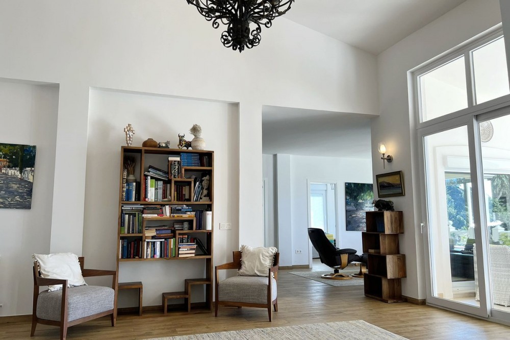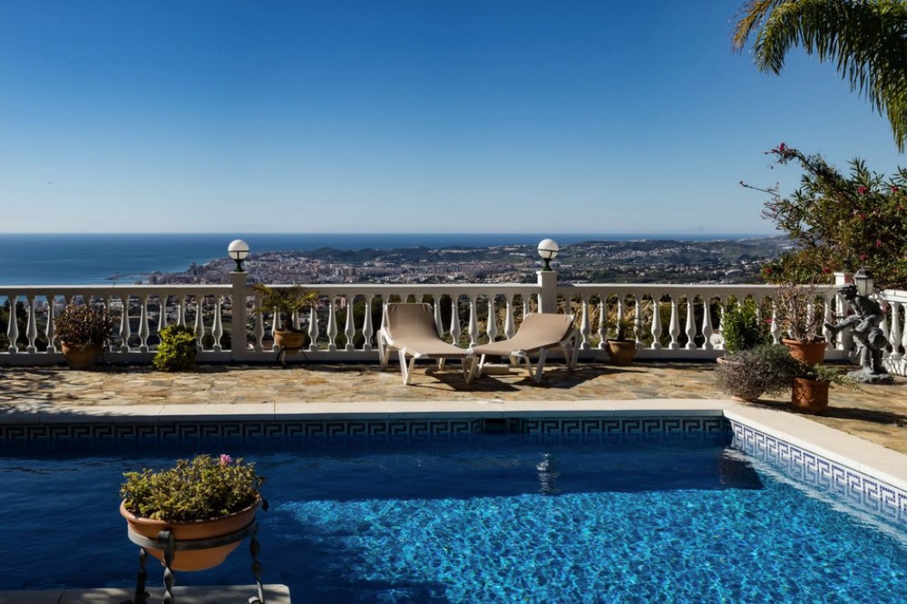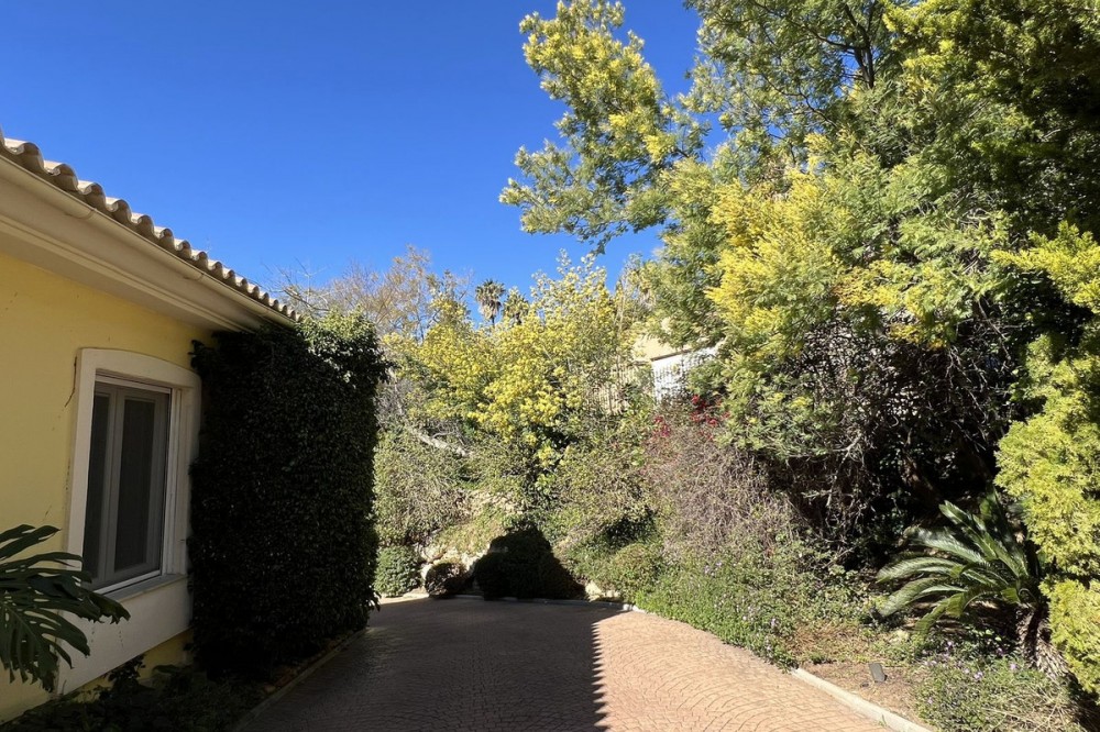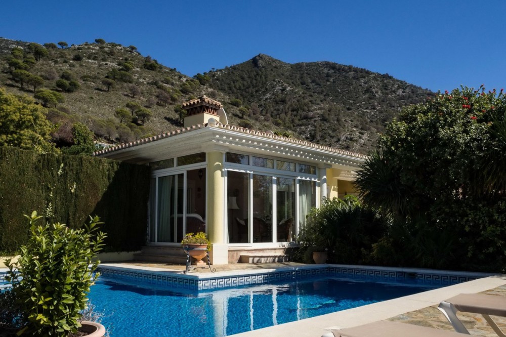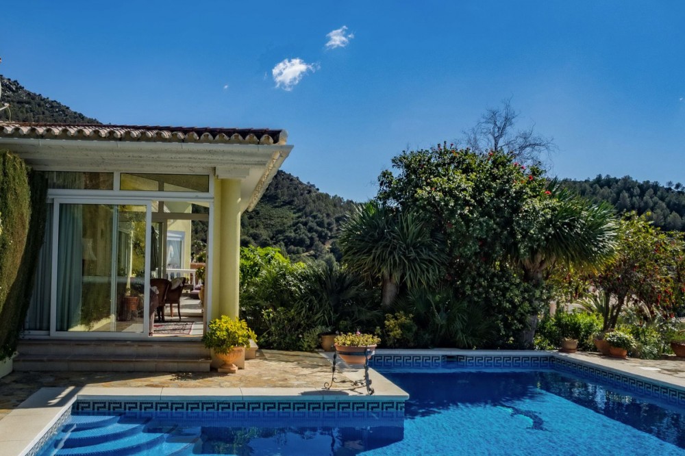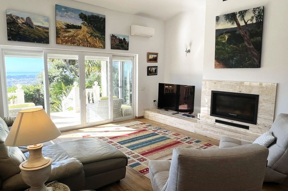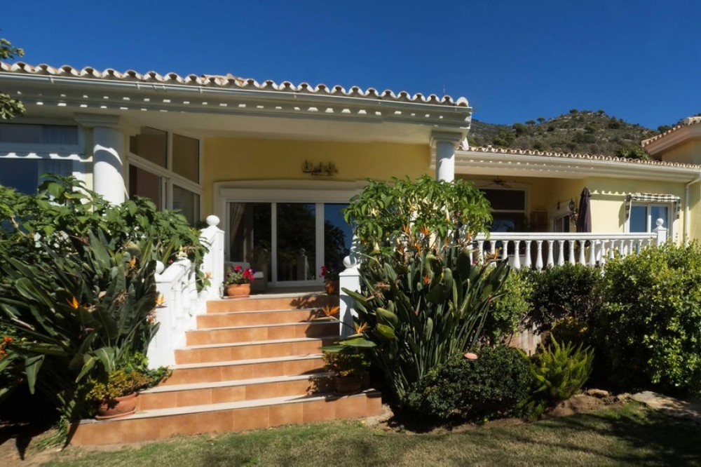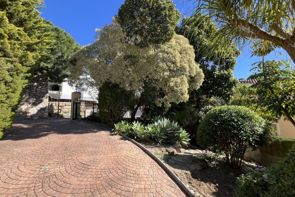 - AMAZING BEAUTIFUL VILLA in IMMACULATE CONDITION located in peaceful and prestigious residential community near all amenities. The property has been recently renovated 5 years ago to the highest most exceptional qualities. And boasts complete privacy and FABULOUS uninterrupted sea and mountain views! This gorgeous house blends a prime exclusive location with bespoke architecture, high-end materials (ceramics, natural wood) and specialized features such as a private gymnasium, 3-car garage and modern smart home technology. Large private driveway with remote controlled gates. Video intercom. Large covered entrance porch. Spectacular entrance hall with large wooden modern security doors; featuring a beautiful wrought-iron ceiling light fixture. Spacious lounge with danish fireplace, indirect lighting, dimmers and large picture windows. Access to wonderful covered terrace. Lovely guest wc. Designed open-plan spaces give the living areas a bright and airy feel, and natural light pours in through all the large windows. Large modern fully fitted kitchen with all modern cons including 3 different types of ovens, 5-plaque induction stove, bay-window and work island with breakfast bar. Adjacent sunny sitting room with access to terrace. FEATURES: Alarm system: both inside the villa connected to mobile via wifi, and exterior as well, by sensors. Professional WiFi coverage throughout the full property. All bedrooms + office have also network connection via lan & Wifi. The property is prepared for 10G. Central heating by radiators (heatpump) possible to regulate by mobile phone via Wifi connection and central panel on each floor. A/C h+c split systems in all main rooms. The villa has high ceilings throughout, with floor-to-ceiling picture windows. All main windows have professional mosquito nets. Huge master bedroom with large en suite bathroom, sunken tub + shower. Heated towel rail. Indirect lighting. Spacious child's room with bay window feature. Guest bedroom with en suite shower room. All bathrooms have heated towel rails and indirect lighting. All bedrooms have indirect lighting + dimmers. Sun room or winter-garden with adjacent lobby, an idyllic family room enclosed in glass for dining or relaxing in the sun. Direct access to terraces, swimming pool and BBQ area. DOWNSTAIRS: The service quarters: a laundry room and adjoining storage/dressing room. En suite spacious shower room. (Possible 2 guest bedrooms). ENORMOUS GARAGE: for at least 3-cars w/automatic door and neon lights. EV charging station (for electric vehicle) up to 22kw. There is a utility/storage area with plenty of shelvings and freezer. Laundry corner has washer & dryer. DIY tool area. 2 Water deposits (2000 L each), 2 heat pumps. Pool pump + machinery, pressure pump + water softener, and boilers (500 L + 300 L), etc. There is a connection in the driveway area for possible extra heat pumps. FANTASTIC PRIVATE GYM or hobby room. SELF-CONTAINED GUEST APARTMENT: Currently it consists of a lounge area, open kitchenette and fantastic spacious office space. There are doors to private terrace & garden. There are 2 Guest bedrooms + 1 modern bathroom. Storage cupboard and Walk-in closet. INCLUDING FURNITURE and all gym equipment: + 91.000 € (optional) EXTERIOR: Fantastic covered terrace surrounded and protected by large picture windows. Gorgeous pool area with Balinese style pergola & BBQ area ideal for "al fresco" dining. Fantastic property for entertaining!! Not over-looked – VERY PRIVATE ENCLAVE. Exterior electrics are prepared for future installation of an exterior kitchen, if desired. Mature landscaped gardens with fruit trees, palms, jacarandas and beautiful rockery features, automatic irrigation and plenty of night lights. Easy maintenance plot. And much much more! MUST BE SEEN. BEACH 10 MINUTES, MALAGA & AIRPORT 15 MINUTES, MARBELLA 25 MINUTES