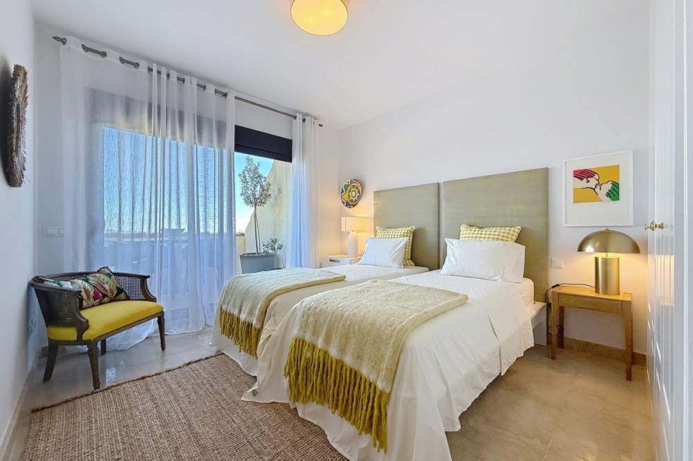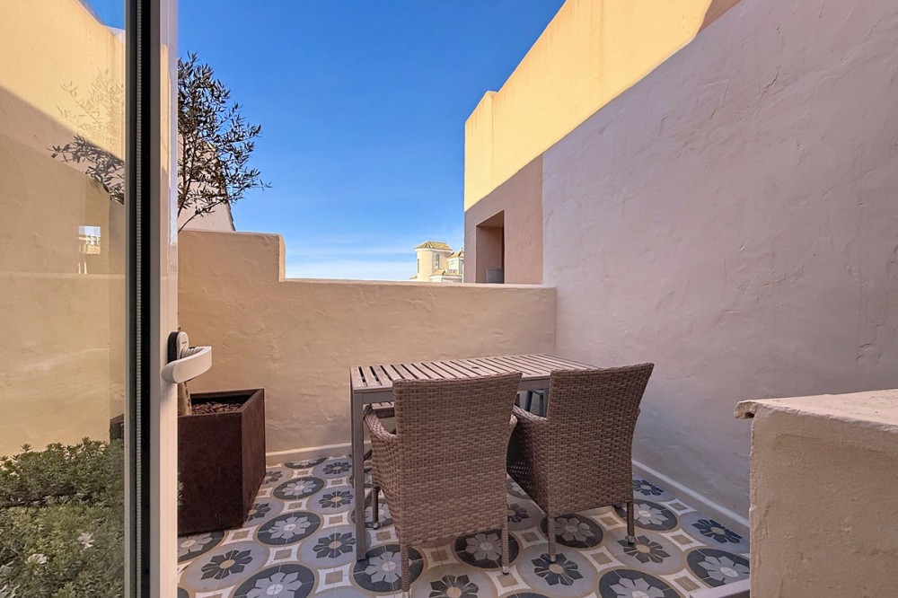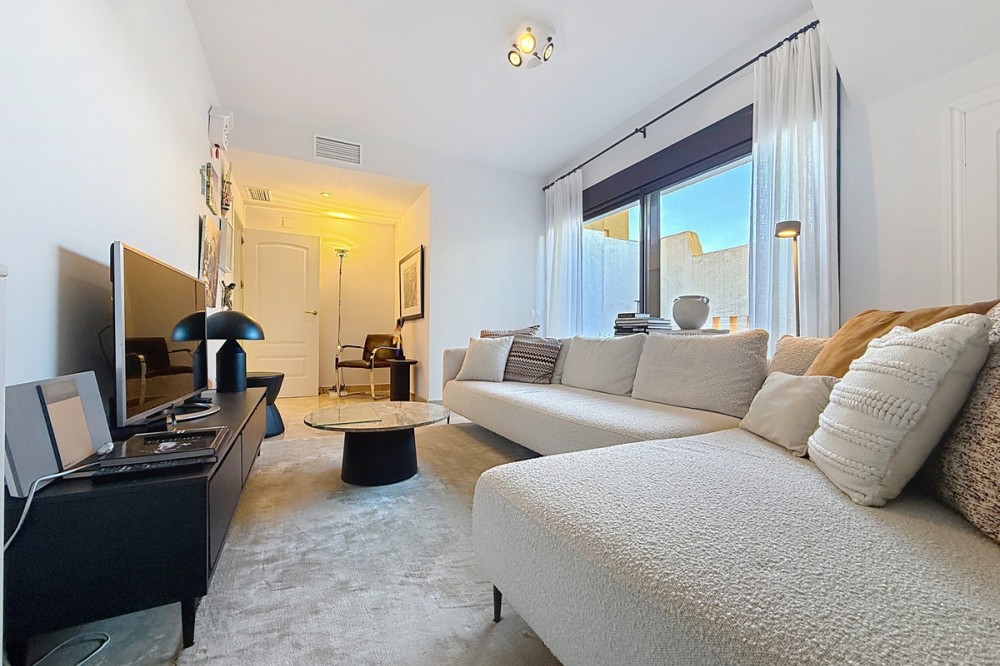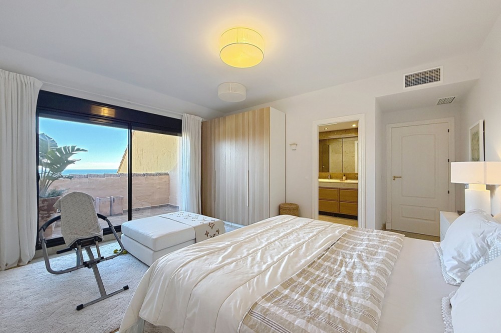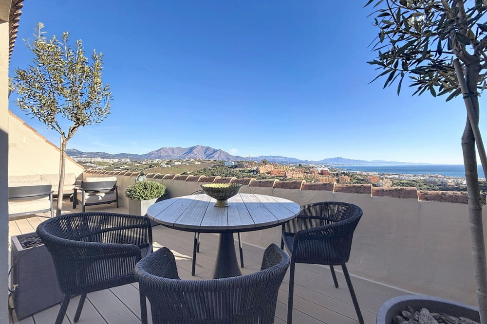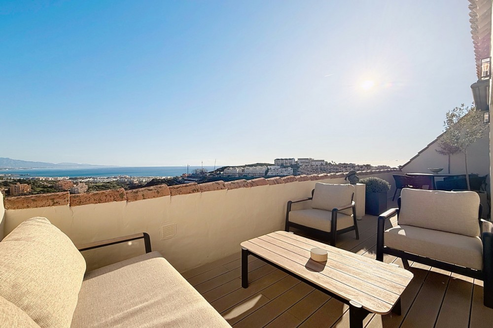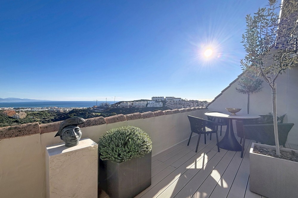 - ‘’Set within the prestigious Duquesa Village residential community, this outstanding penthouse combines generous proportions, abundant natural light and a truly privileged lifestyle. From the moment you step inside, the sense of space is immediate, enhanced by a skylight in the entrance hall and an open first glimpse towards the sea. The fully fitted, spacious kitchen stands out for its granite worktops and quality finishes. It opens onto a west-facing terrace, perfect for al fresco dining, sunset drinks or relaxed barbecues in complete comfort. The sleeping area features three bedrooms, each with its own large private terrace and beautiful views over the sea and mountains. Two bedrooms are en-suite, and one of them also offers a walk-in dressing area, delivering a genuine “suite” feel and everyday practicality. Sold fully furnished, the property also includes a garage space in the same building and a 5.28 m² storage room, ideal for additional organization. The gated community with 24/7 security offers several swimming pools, a children’s play area and paddle courts, all set within meticulously landscaped gardens. The location is equally compelling: close to several golf courses, minutes from La Duquesa beaches, and with fast access to Estepona, Sotogrande, Marbella and Gibraltar. Everyday amenities, supermarkets, restaurants, schools and main road links, are within easy reach, making this penthouse an excellent option as a second home or a solid long-term investment with rental appeal.’’