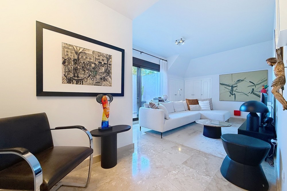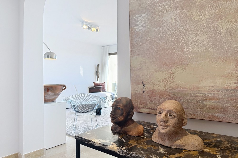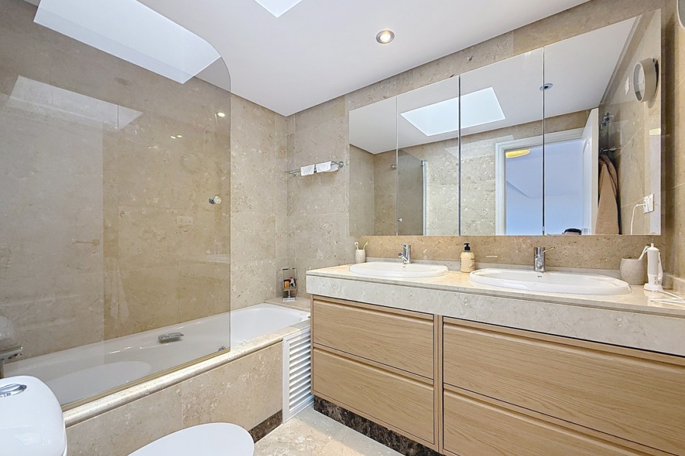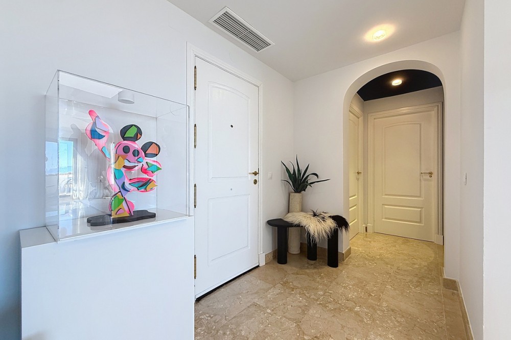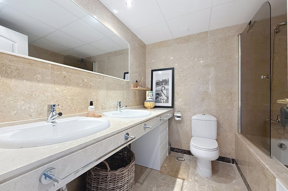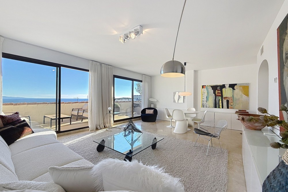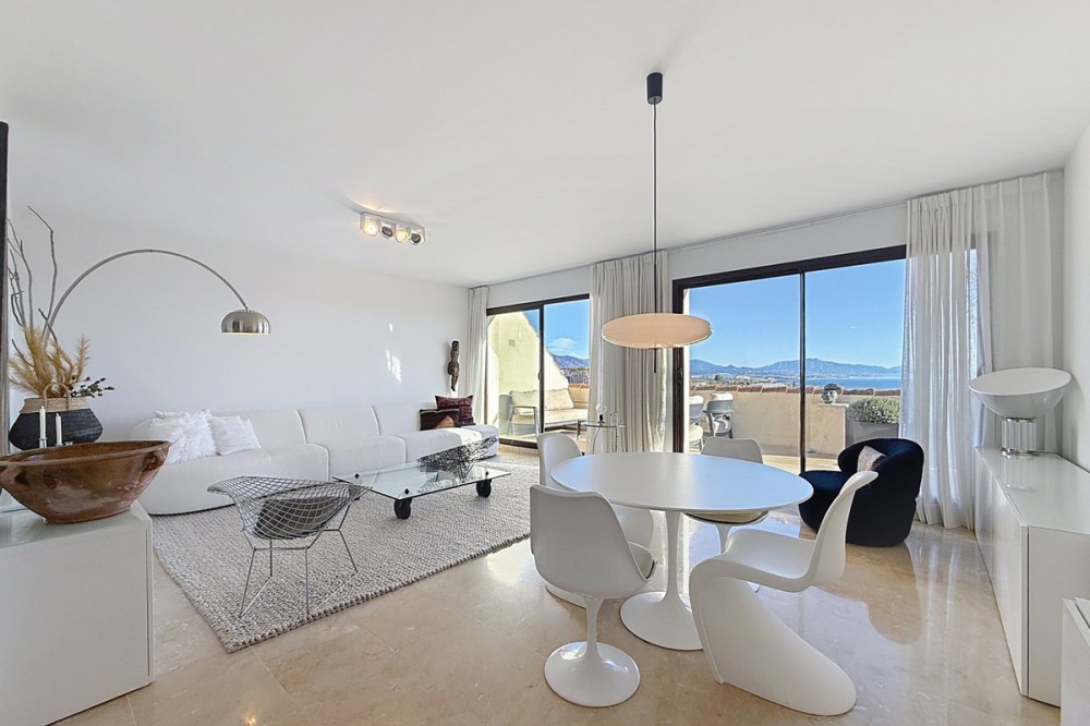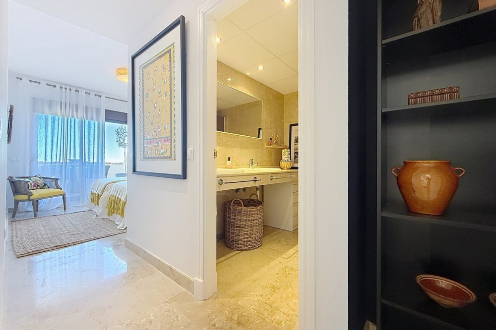 - ‘’Set within the prestigious Duquesa Village residential community, this outstanding penthouse combines generous proportions, abundant natural light and a truly privileged lifestyle. From the moment you step inside, the sense of space is immediate, enhanced by a skylight in the entrance hall and an open first glimpse towards the sea. The fully fitted, spacious kitchen stands out for its granite worktops and quality finishes. It opens onto a west-facing terrace, perfect for al fresco dining, sunset drinks or relaxed barbecues in complete comfort. The sleeping area features three bedrooms, each with its own large private terrace and beautiful views over the sea and mountains. Two bedrooms are en-suite, and one of them also offers a walk-in dressing area, delivering a genuine “suite” feel and everyday practicality. Sold fully furnished, the property also includes a garage space in the same building and a 5.28 m² storage room, ideal for additional organization. The gated community with 24/7 security offers several swimming pools, a children’s play area and paddle courts, all set within meticulously landscaped gardens. The location is equally compelling: close to several golf courses, minutes from La Duquesa beaches, and with fast access to Estepona, Sotogrande, Marbella and Gibraltar. Everyday amenities, supermarkets, restaurants, schools and main road links, are within easy reach, making this penthouse an excellent option as a second home or a solid long-term investment with rental appeal.’’