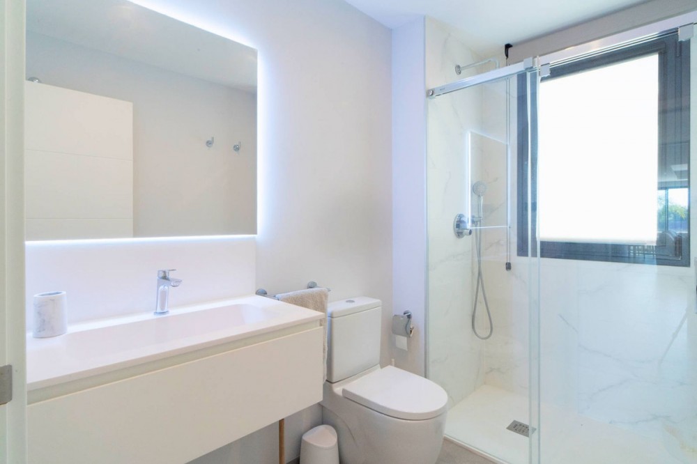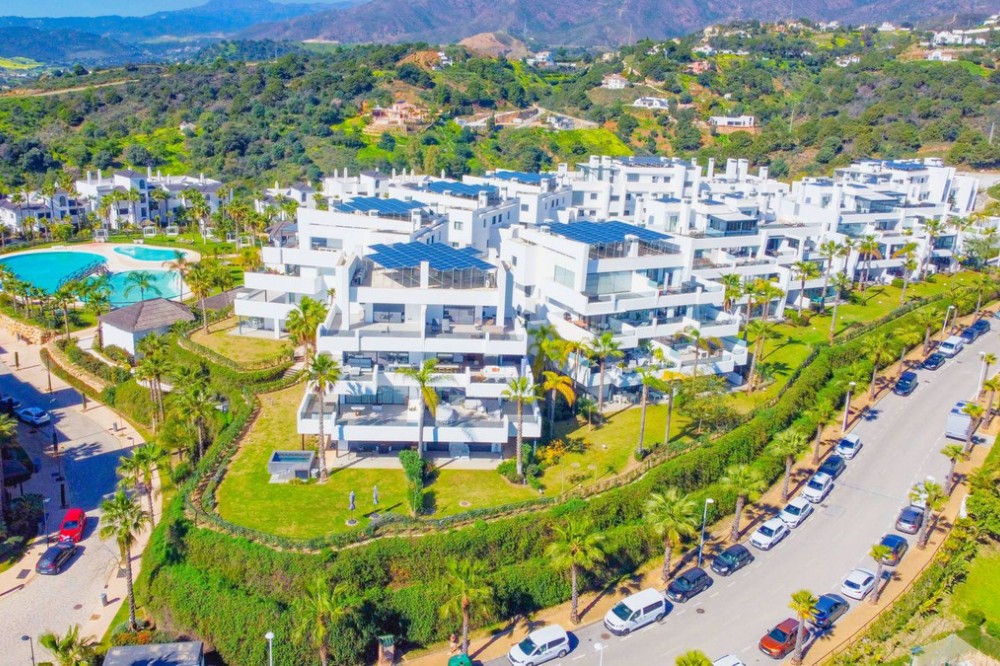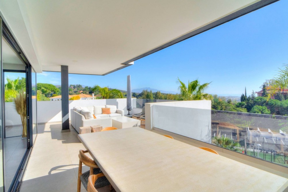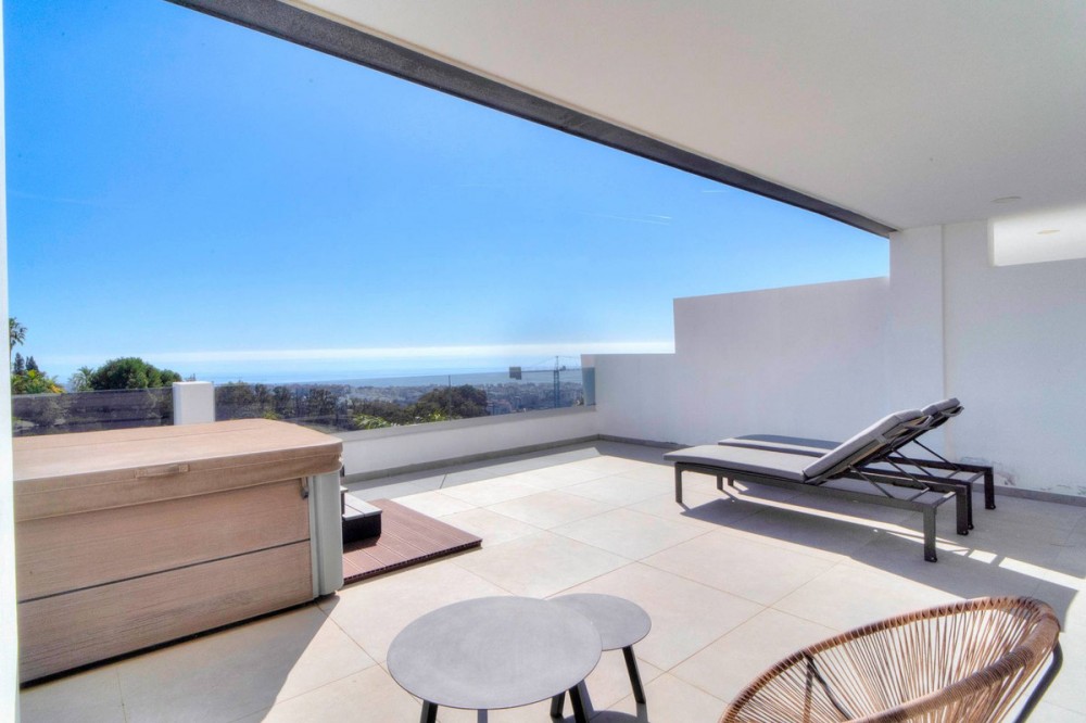 - Exceptional sought-after contemporary duplex penthouse for sale in Mirador de Estepona Hills, Estepona Apartment details * Spectacular, huge penthouse with 4 bedrooms which is very rare * Very modern, contemporary architecture * Top of the range appliances * Duplex distribution * South / South-East orientation * Spectacular panoramic 270º sea and mountain views, views over the entire urbanization * Very generous open plan kitchen, dining and living room with floor to ceiling windows * The kitchen is fully equipped with top brand appliances, there is a large associated utility room * Fitted wardrobes in all bedrooms * Air conditioning for cooling and heating * Private underground parking slot for 2 cars Complex details: * Superb new luxury village-complex just north of the centre of Estepona (walking distance via a dedicated path) * Gated, with 24h dedicated manned security + security cameras * Impressive tropical gardens, walkways with 2 swimming pools * Blue Duck cocktail bar and restaurant in the center of the urbanization near one of the pools 2600 sqm of sports zone, comprising a huge state-of-the-art gym of 1000 sqm, 5 padel tennis courts, 1 tennis court * Kids playground * Charging points for electric vehicles