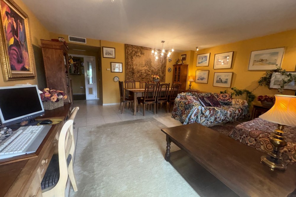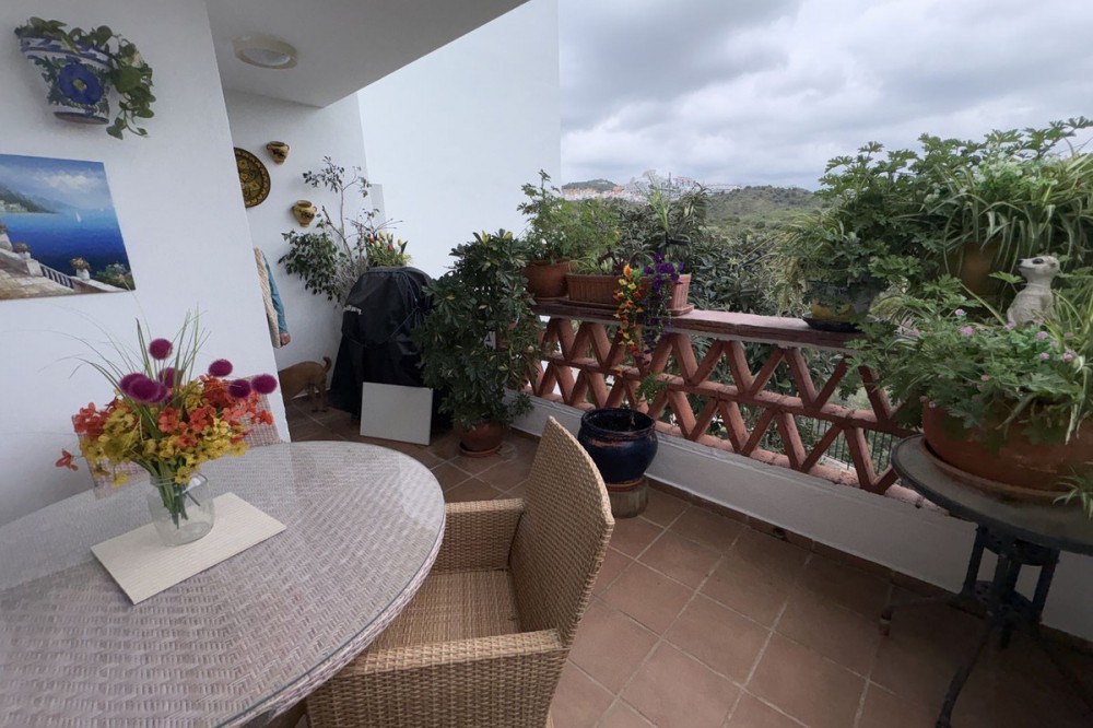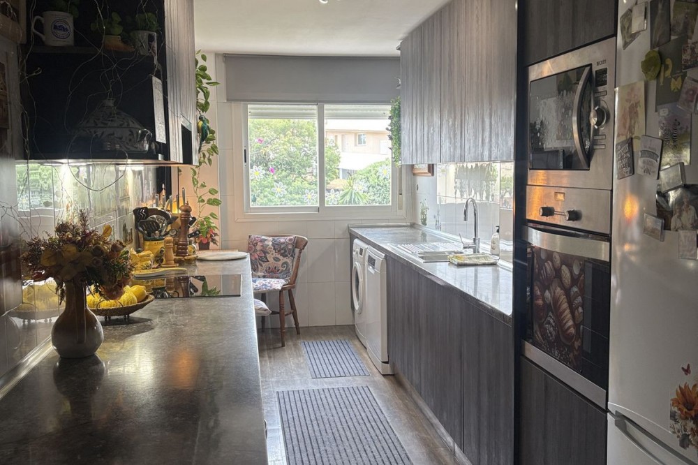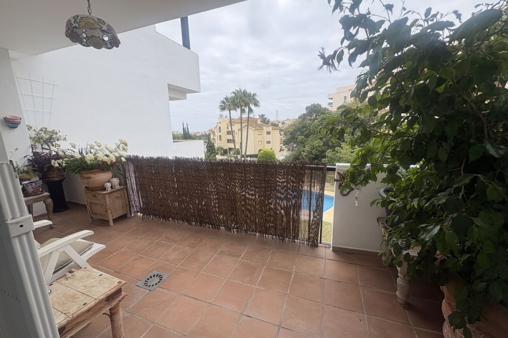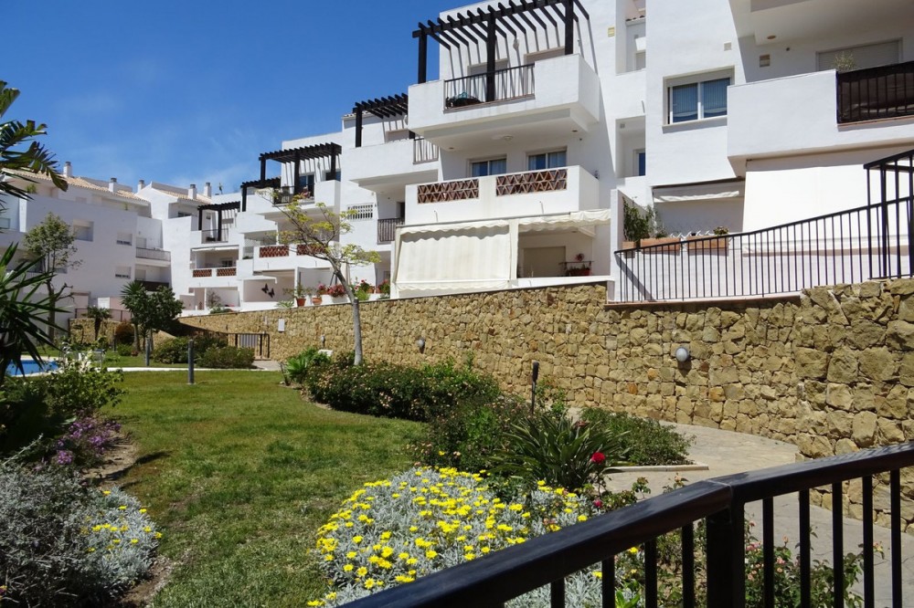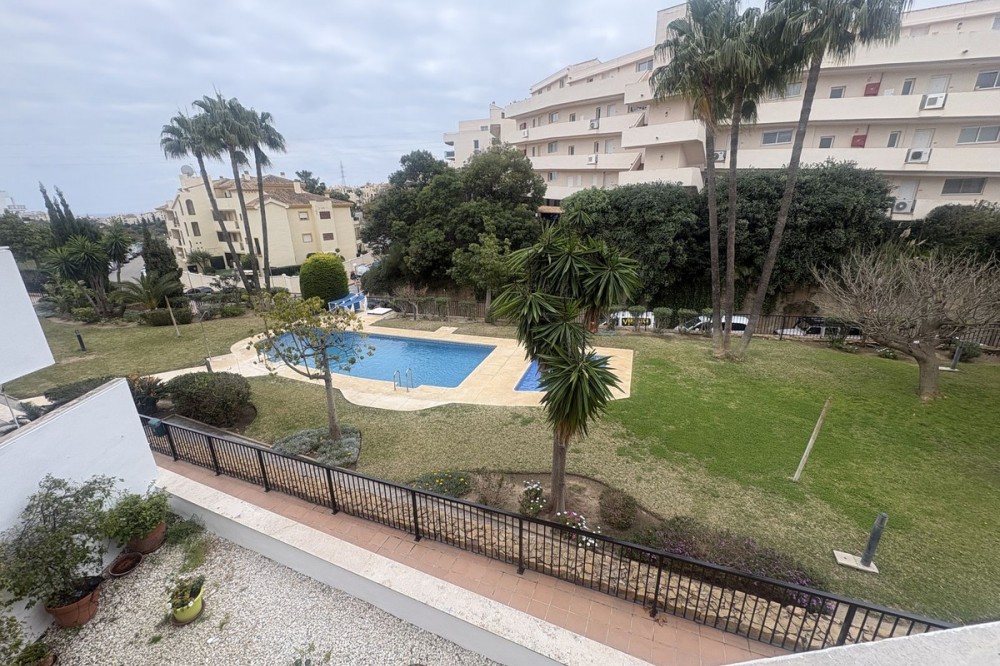 - Spacious 1st floor apartment in a lovely community within walking distance to the Miraflores golf course. This apartment gives you two good size bedrooms with fitted wardrobes both with access to the back terrace, the master bedroom there is a large un-suite bathroom that has recently been renovated and there is a smaller 2nd shower room. The kitchen is fully equipped, and it has also been renovated. The living room is large with 2 double doors leading to the front terrace, from there you have sea and pool views. It sold with private parking and storeroom in the communal underground garage.