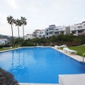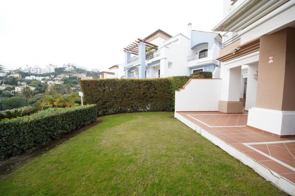 - Ground floor apartment with private garden, open views, and 4 communal swimming pools. A magnificent ground floor apartment is offered for sale within a well-maintained and quiet residential complex, surrounded by landscaped gardens and with open views of a green golf course/valley setting. It stands out for its combination of comfort, spaciousness, and private outdoor area: a large terrace with a dining area and a private garden, ideal for enjoying the Costa del Sol climate year-round. Inside, the apartment features a spacious and bright living-dining room with large windows and direct access to the outside. The layout is very practical, with a fully equipped independent kitchen and a utility room/laundry area. The sleeping area offers two good-sized bedrooms and two bathrooms: one with a shower and the other a full bathroom with double sinks and a bathtub, perfect for everyday use or entertaining guests. The apartment boasts high-quality finishes, light marble floors, and an elegant and contemporary aesthetic. Originally, it had three bedrooms and two bathrooms, but it was renovated, incorporating one of the bedrooms into the living room. The complex features four large communal swimming pools with a sun terrace and immaculate gardens, creating a resort-like atmosphere. The property also includes a parking space in the underground communal garage, as well as a storage room. Key features: Ground floor with terrace and private garden, Unobstructed views of the green area, Very spacious and bright living/dining room, Two bedrooms / Two bathrooms, Equipped kitchen and utility room, Communal swimming pool and gardens, Parking space and storage room included, Electric security shutters, Soundproofing of ceilings and walls, Air-source heat pump for heating and hot water, Thick-walled windows for noise and temperature insulation, Mosquito nets on windows, Private electric vehicle charging point in the garage. An ideal property as a primary residence, second home, or investment, in a pleasant, well-maintained setting with excellent communal areas.