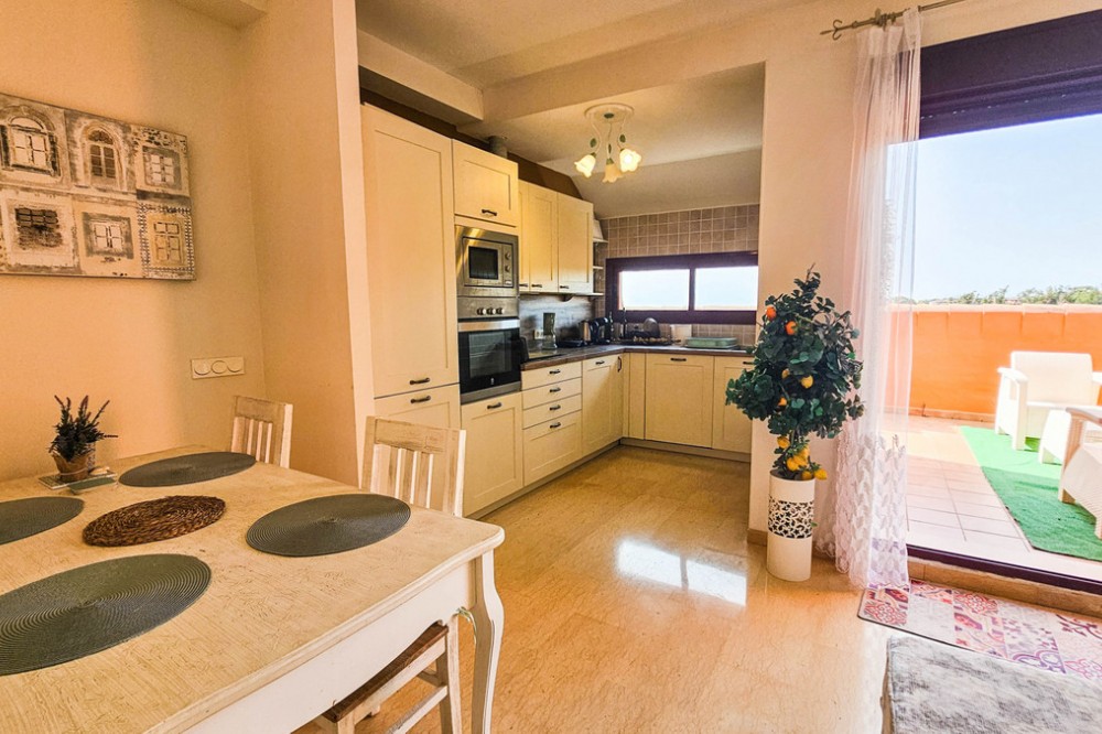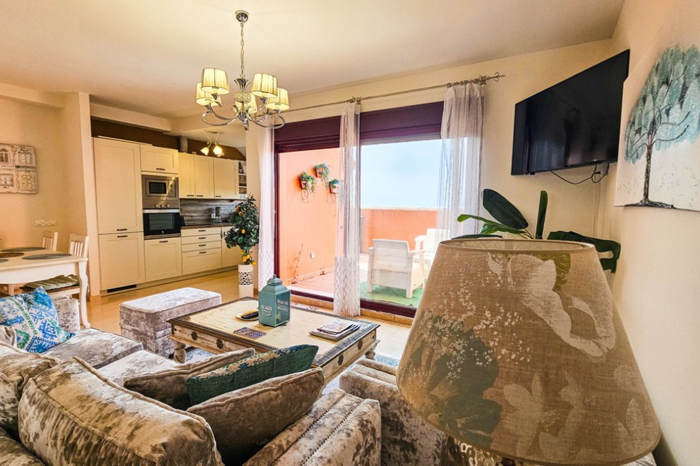 - Penthouse with Panoramic Sea Views in La Duquesa, Manilva This impressive penthouse is perfectly located in La Duquesa, just a short walk from the beach and the vibrant marina with its selection of restaurants, cafés, and bars. Offering an exceptional 111 m² of terrace space, the property enjoys panoramic sea views that create a truly unique setting for both relaxation and entertaining. Inside, the penthouse features two comfortable bedrooms, two bathrooms, and a guest WC. The open-plan living and dining area connects naturally to the expansive terrace, making the most of the property’s elevated position and abundant natural light. With its generous outdoor space, this home is designed for enjoying the Mediterranean lifestyle all year round. Residents benefit from a communal swimming pool and landscaped gardens, while a private garage space is also included. The development combines privacy with convenience, providing easy access to local amenities and excellent transport links along the Costa del Sol. La Duquesa is well known for its charming marina, relaxed atmosphere, and proximity to renowned golf courses and beaches. For international connections, Málaga Airport is around 1 hour by car, while Gibraltar Airport is just 30 minutes away. This penthouse represents a rare opportunity to own a spacious home with spectacular sea views and unbeatable access to the coast’s best lifestyle offerings.