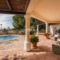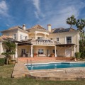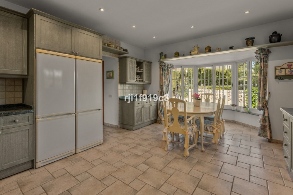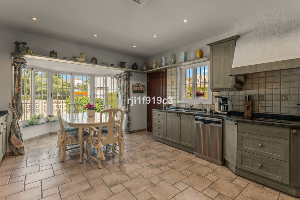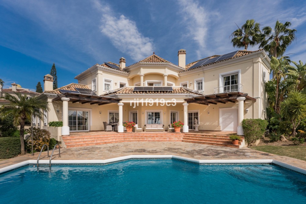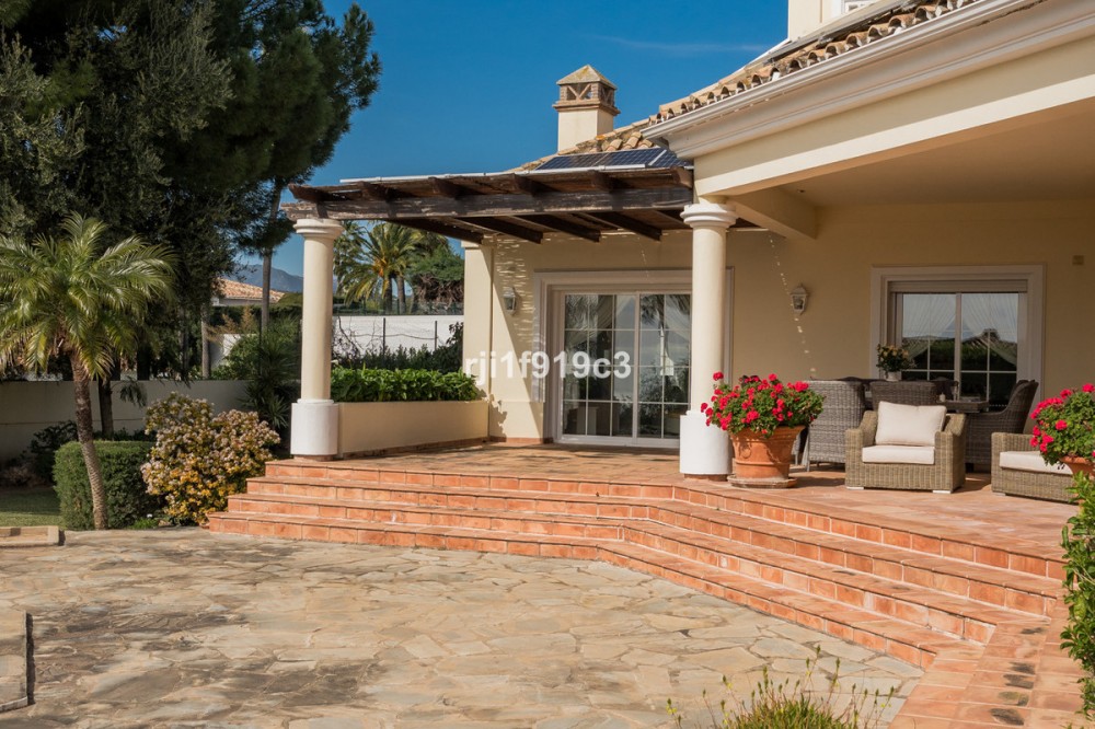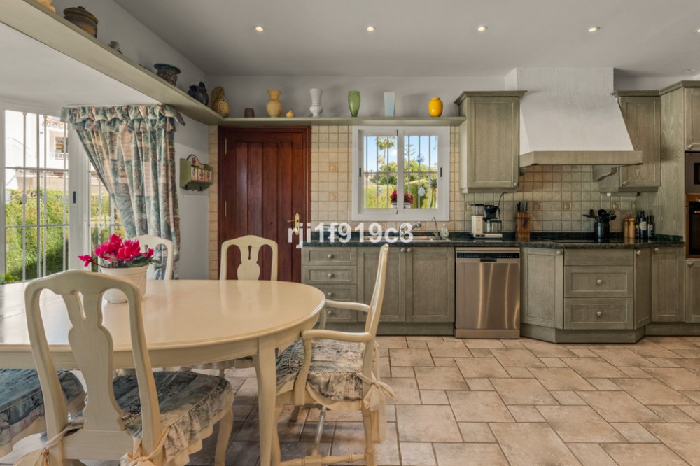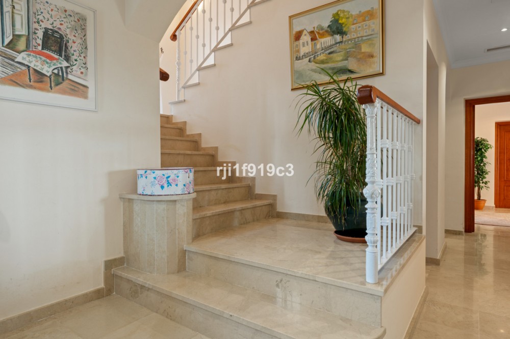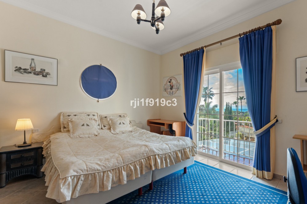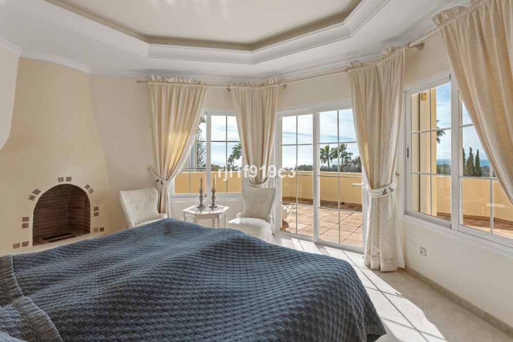 - Luxury Mediterranean Villa with Panoramic Sea Views in Elviria, Marbella East Nestled in the prestigious residential area of Elviria, in the eastern part of Marbella, this elegant villa offers privacy, space and breathtaking Mediterranean sea views. Set on a generous 1,443 m² plot with 571 m² built area, this beautifully constructed home (built in 1998) is distributed over three levels and designed for comfortable year-round living. The property features 4 spacious bedrooms, 4 en-suite bathrooms, and a guest toilet, combining classic Andalusian charm with timeless elegance. Layout & Living Spaces Lower Level A large underground garage with space for several vehicles. This level also includes an additional room with a full bathroom — ideal for a home cinema, private gym, guest suite, or children’s playroom. A charming wine cellar completes this floor. Main Floor An impressive entrance hall leads to a fully equipped kitchen with separate utility room. The main living room with fireplace enjoys direct access to the lush garden and terrace. On this level there is also a guest toilet and a beautiful en-suite bedroom with its own fireplace. Additionally, a separate dining room and second lounge — both with fireplace — open directly onto the main garden and terrace, creating a perfect indoor-outdoor lifestyle experience. Upper Floor The stunning master suite features a private dressing area, en-suite bathroom with hydromassage bathtub, fireplace, and access to a spacious terrace with spectacular panoramic sea views. Two additional bedrooms, both en-suite, complete this level. Outdoor Living The impeccably maintained garden offers total privacy, a cozy terrace with its private swimming pool, and open sea views — a perfect setting to enjoy Marbella’s 320 days of sunshine per year. Prime Location * 5 minutes by car to the beautiful beaches of Elviria and its shopping center with restaurants, supermarkets, banks and all amenities * 15–20 minutes to Marbella town centre * 30 minutes to Puerto Banús * 45 minutes to Aeropuerto de Málaga-Costa del Sol Golf enthusiasts will appreciate the proximity to renowned courses such as Cabopino Golf, Santa María Golf and Río Real Golf. The area is also home to several international schools, making it ideal for both permanent living and holiday investment. A refined Mediterranean residence offering space, elegance and exceptional sea views in one of Marbella’s most sought-after areas.
