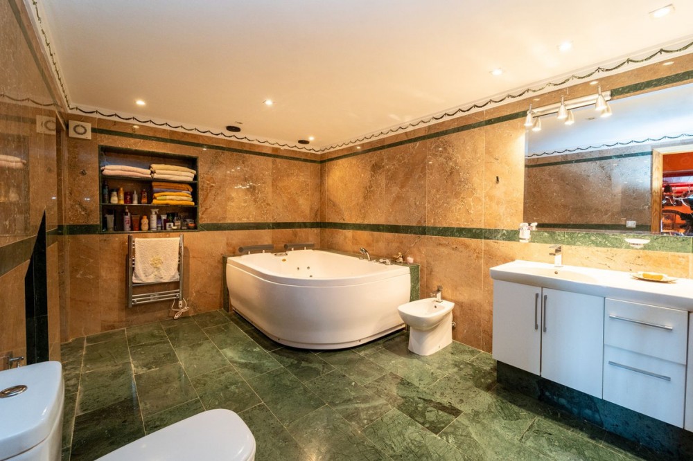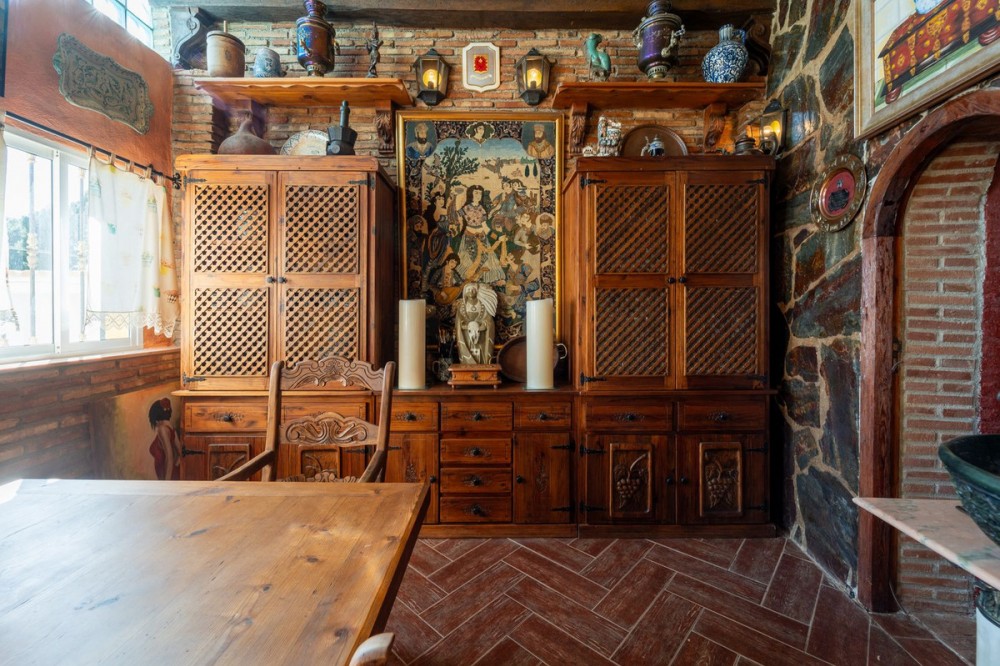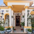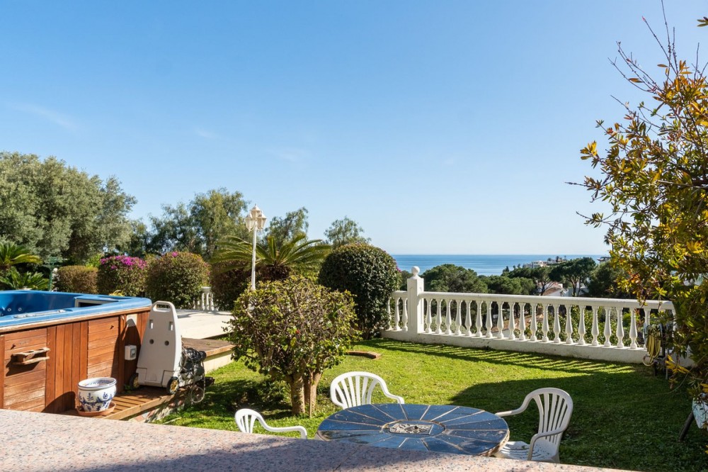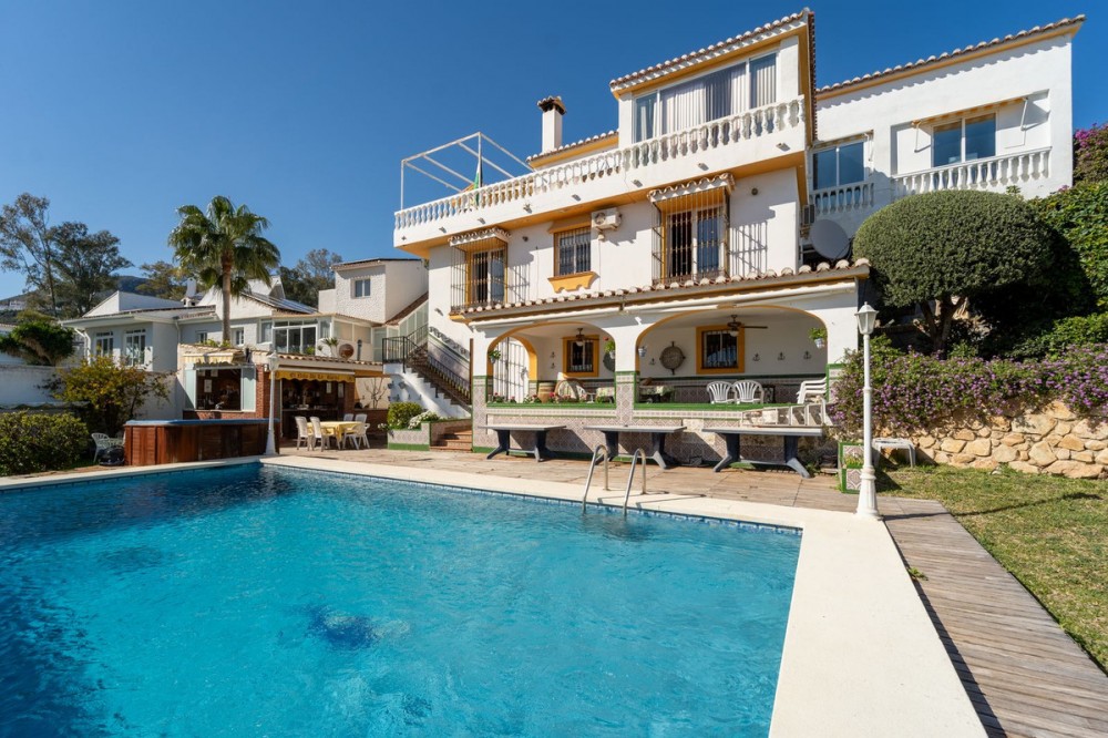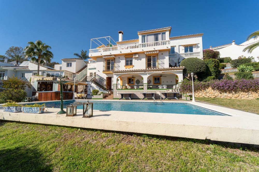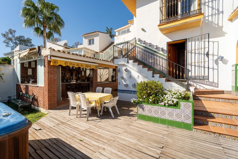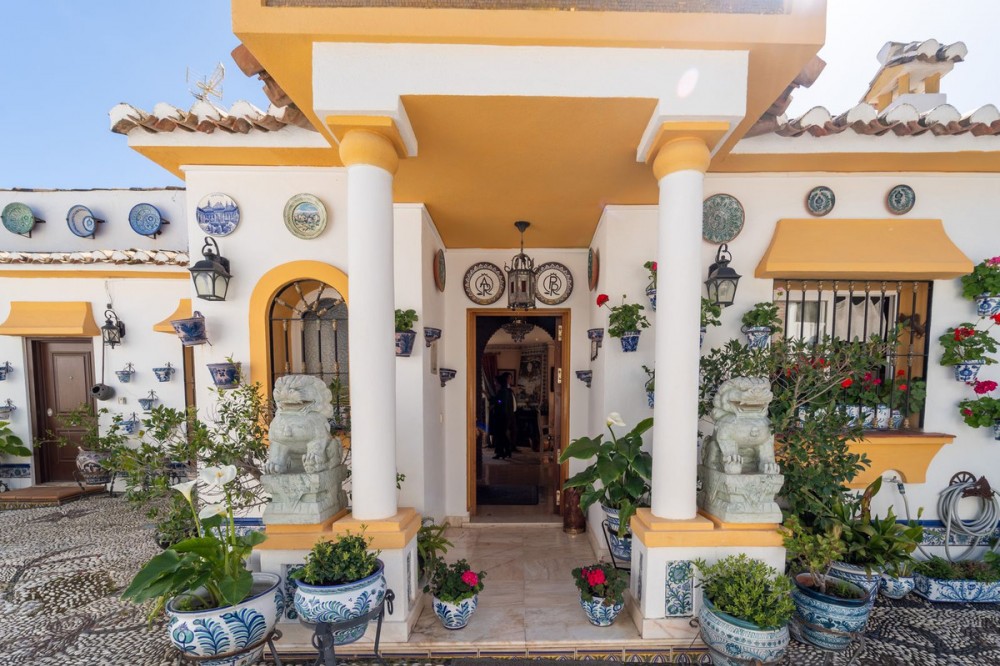 - Exclusive Andalusian-Style Villa with Panoramic Sea Views in Torremuelle Imagine waking up every morning in a magnificent Andalusian-style villa where timeless architecture blends seamlessly with the natural beauty of the Mediterranean surroundings. Set on an expansive plot of approximately 1,500 m², this remarkable property offers an exceptional lifestyle, with breathtaking sea views that can be enjoyed from almost every corner of the home. Upon arrival, the main entrance is framed by two spacious garages and leads to a charming private terrace designed in the style of a traditional Andalusian courtyard. Surrounded by colourful flower pots and authentic Granada ceramics, this peaceful space invites you to relax and enjoy the tranquil atmosphere that defines this unique residence. A welcoming porch supported by elegant columns leads you inside, revealing the character and charm of the villa. The entrance hall, reflecting classic Andalusian design, opens into the main living room — a bright and inviting space that connects directly to a large terrace. Here, you can imagine enjoying family breakfasts while admiring the spectacular sea views. Featuring marble floors, a fireplace, and air conditioning, this living area becomes the heart of the home and the perfect setting for unforgettable moments. The kitchen is equally impressive, highlighted by a beautiful Mudejar-style arched skylight that fills the room with natural light and vibrant colours. Adjacent to the living area, you will find a bedroom with sea views as well as an independent study, ideal as a home office or guest accommodation. The level offers three additional bedrooms, all fitted with generous built-in wardrobes. The master suite with an en-suite bathroom and a walk-in wardrobe. This level also features a large living room with a library and a dining area that comfortably accommodates your guests around a solid wood dining table, making it perfect for hosting memorable gatherings. From here, you can access a beautiful private wine cellar, an ideal feature for wine enthusiasts. The villa continues to surprise with a charming traditional Andalusian-style bar and entertainment area, complete with a spacious lounge and bar — the perfect setting for unforgettable celebrations with family and friends. There is also a large bathroom on this floor. The exterior spaces are equally impressive. A lush garden surrounds the swimming pool and jacuzzi, while a fully equipped terrace and a covered barbecue area create the ideal setting for outdoor dining and entertaining. A newly installed outdoor Finnish sauna adds an extra touch of luxury and wellness to everyday living. The garden also features fruit trees and a charming greenhouse, making it a dream for gardening enthusiasts, all framed by elegant stone pillars and enhanced by breathtaking sea views. Located in Torremuelle, one of the most exclusive residential areas of the Costa del Sol, this villa is ideally positioned close to international schools and just five minutes from the beach, shops, and restaurants, offering both privacy and convenience.