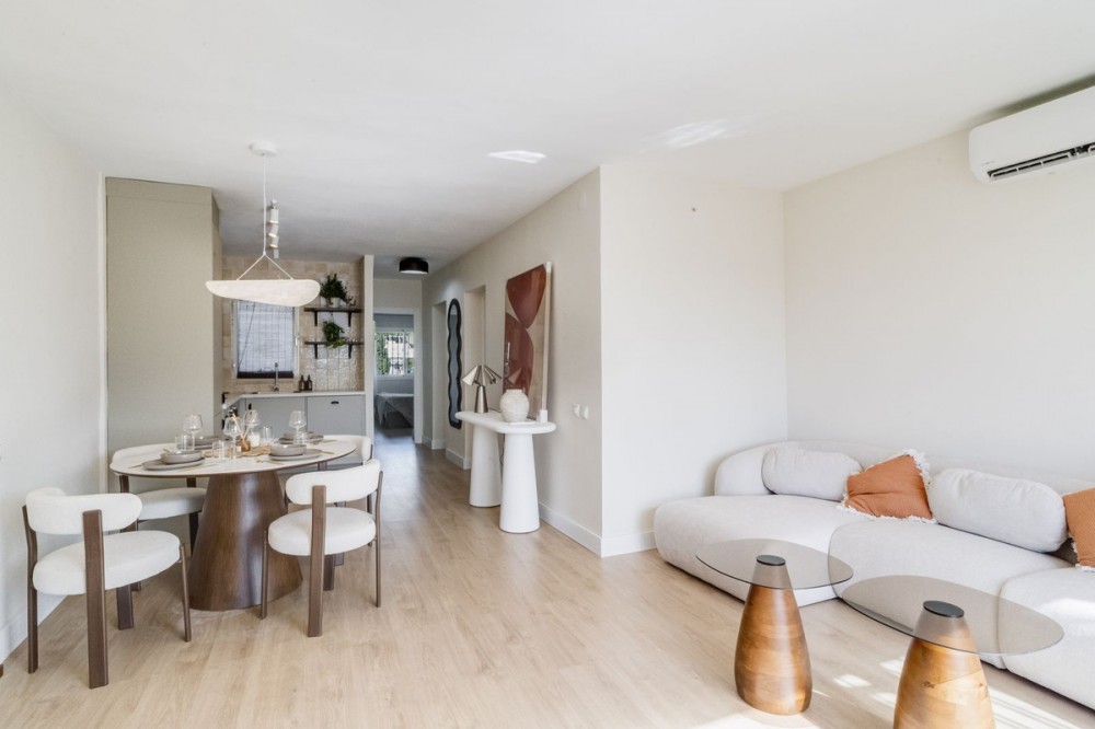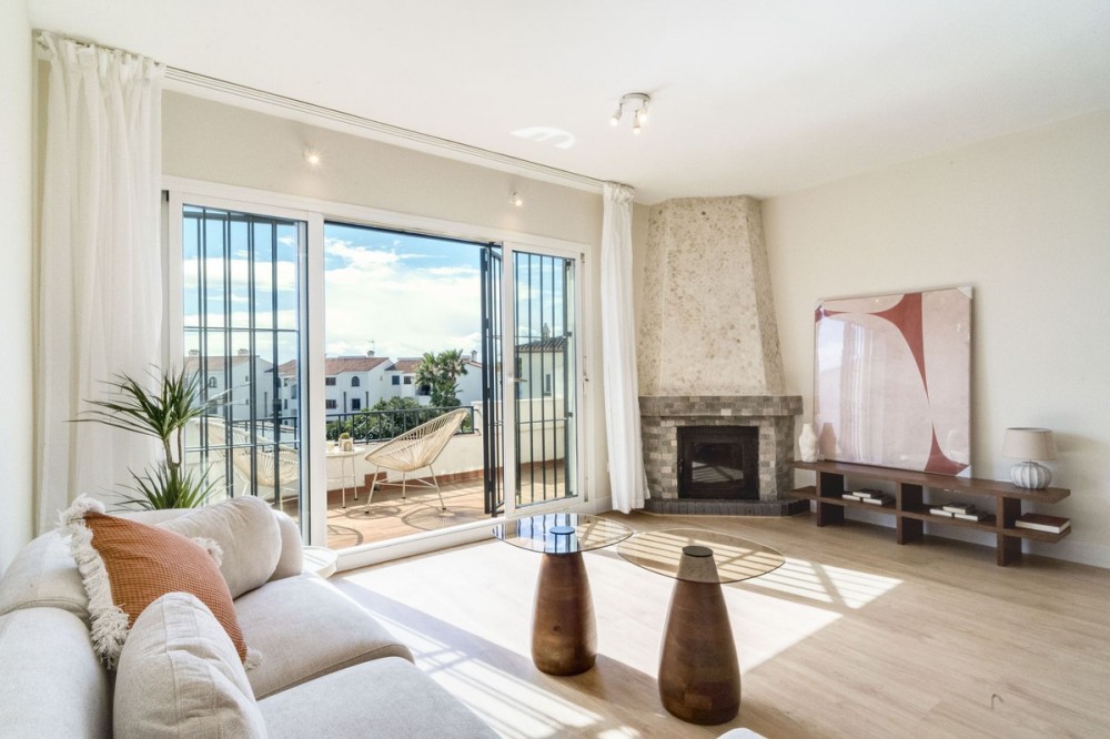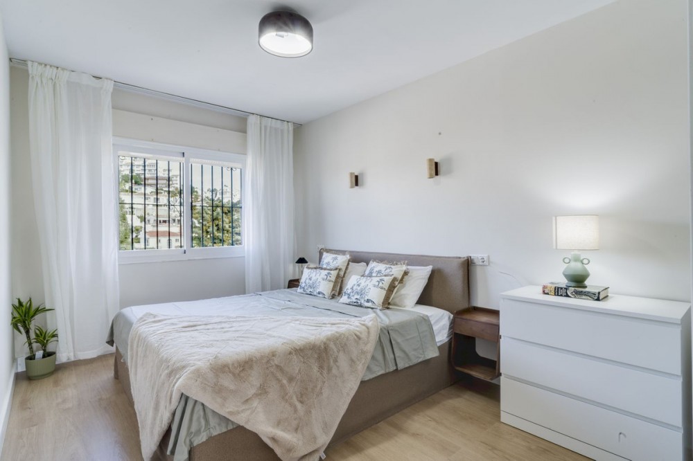 - Architectual Digest -Beautifully Refurbished Apartment Near the Beach – Miraflores, Riviera This brand-new, fully refurbished apartment is ideally located in the sought-after area of Miraflores, Riviera, just a short walk from the beach. The property is situated in a charming boutique complex with only a few apartments, offering a peaceful and private atmosphere on a very quiet street while still being within walking distance of sports facilities, shops, restaurants, and other amenities. The apartment has been thoughtfully designed and furnished by a professional interior design company, combining elegant Mediterranean architectural elements with modern comfort and attention to detail. The property features two spacious bedrooms and a generously sized bathroom. A lovely terrace opens onto lush green gardens and the communal swimming pool, with a partial sea view that enhances the relaxing ambiance. The complex allows short-term rentals, making this property an excellent opportunity both as a comfortable home and as a smart investment. Additional features include a designated parking space directly in front of the building and a desirable south-facing orientation, allowing you to enjoy the beautiful sunshine throughout the day.