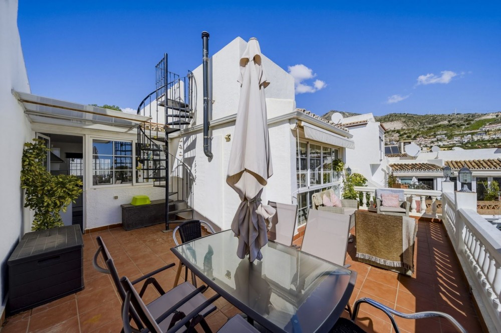 - Charming Townhouse with Sea Views in Montealto We are delighted to bring to the market this beautifully positioned townhouse located in the sought-after Los Naranjos urbanisation on Calle Manzanilla, Arroyo de la Miel, Benalmádena. Set within a quaint and private community of just eight properties, this home offers a wonderful sense of privacy while being ideally located within easy reach of everything the Costa del Sol lifestyle has to offer. The property enjoys a south-facing orientation, ensuring sunlight throughout the day and allowing the terraces to be enjoyed year-round. Spacious Living with Seamless Outdoor Living Situated on a 105 m² plot, the property offers well-designed living spaces that blend indoor comfort with outdoor living. Upon entering the property, you are welcomed by an entrance hall leading into a bright and spacious living room and kitchen area. From here, large doors open onto a generous terrace, perfect for outdoor dining, relaxing, and enjoying the Mediterranean lifestyle. This terrace overlooks the beautiful communal swimming pool and gardens, while also offering stunning sea and mountain views. A spiral staircase leads to a picturesque roof terrace, providing an additional outdoor space ideal for enjoying the panoramic scenery and sunshine. Comfortable Bedrooms with Private Terrace Access The three bedrooms are located on the lower level of the property, creating a peaceful and private sleeping area. The home features: • Three bedrooms • Two bathrooms • Two spacious double bedrooms Both the master bedroom and second bedroom enjoy direct access to a lovely private terrace, again offering beautiful sea and mountain views. Location & Lifestyle The location of this property is truly exceptional. Situated just minutes from Arroyo de la Miel, residents benefit from easy access to: • The train station with direct links to Málaga and the airport • A wide selection of restaurants, cafés and shops • Beaches and coastal amenities The charming Benalmádena Pueblo is also close by, offering a more traditional Andalusian atmosphere with beautiful panoramic views, culture and dining. Additional Features • 105 m² plot • Small and exclusive community of only 8 homes • Communal pool and gardens • South-facing orientation • Sea and mountain views • Roof terrace • Parking directly outside the property • Secure and well-maintained community Ideal for Multiple Uses Whether you are looking for a holiday home, investment property, family residence or a lock-up-and-leave property on the Costa del Sol, this townhouse offers an excellent opportunity in a highly convenient location. This charming home must be viewed to be fully appreciated, not too be missed.