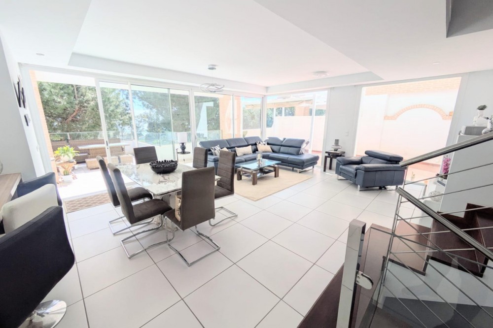 - Discover this spectacular minimalist-style villa (built in 2019), located in one of the most privileged and tranquil areas of Benalmádena, surrounded by nature and with breathtaking sea views from its three terraces. Distributed over three floors with a private elevator: The main floor features a designer kitchen with BOSCH appliances opened to living-dining area with floor-to-ceiling windows and direct access to a magnificent terrace, a double bedroom with en-suite bathroom and built-in wardrobes, and a guest toilet. On the first floor, there is a double bedroom with a dressing room, en-suite bathroom, and a private terrace. The spacious basement includes a private terrace with sea views, two double bedrooms with en-suite bathrooms and built-in wardrobes, an additional living room, a storage room, and a utility room. By adding a small kitchen, this floor could easily be converted into a self-contained apartment. The property also has a private garage and solar panels on the rooftop. This stunning contemporary villa is part of the prestigious BigBlue urbanizacion. Exclusive community amenities include: Infinity pool with breathtaking sea views Fully equipped gym Elegant clubhouse overlooking the coast The development boasts an unbeatable location just 1 km from the beach and only 500 meters from the train station (ideal for travel to Malaga or the airport), close to top-rated public and private schools (including The British College), and minutes from supermarkets, restaurants, golf courses and all local services. This villa is ideal as a luxurious family residence, holiday retreat, or high-yield investment. Don't miss this unique opportunity that combines luxury and functionality, make it your new home today!