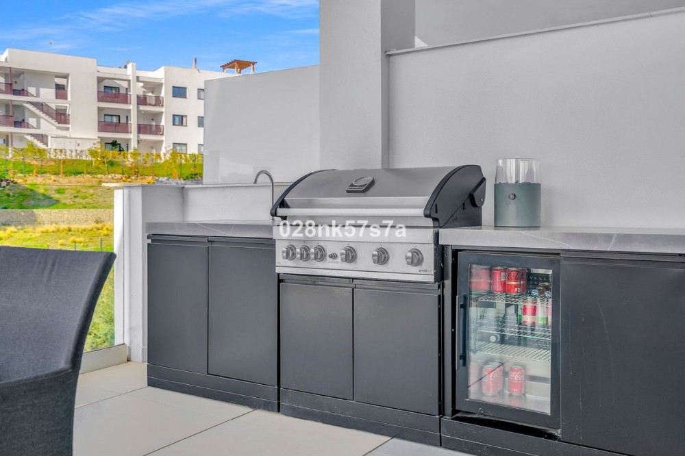 - Higueron West is a modern and exclusive gated residential area between Fuengirola and Benalmadena. The area is known for its high quality architecture, green surroundings and the wide spectre of facilities. Reserva del Higueron has a very attractive location with a short distance to the beach, various amenities and public transportation. This area is at the same time quiet and private. From the apartment there is only a few minutes walk the the Higueron Resort, that offers a luxury hotell, spa, gym, restaurants and a high quality sports center. You are also in walking distance to the beach, beach promenade and train station Carvajal for the train going either to Fuengirola, Malaga or Malaga Airport. The combination of a modern environment, facilities and accessability ,makes Higueron West one of the most desirable areas in this part of Costa del Sol. This is both for holidays and permanent living. This apartment in Higueron West is extra well maintained, with a high upgraded standard, good sun conditions and panoramic sea views. So far this has been a holiday home and not used a lot. The terraces are south-west facing with sun more or less all day and till the sunset. The main terrace is covered, something that gives you shade on the hottest days but also protection from a rainy day in the winter. This terrace has a lovely outdoor kitchen with a barbecue, sink with water and a fridge. This property keeps a high standard through out, with a lot of upgrades. There is underfloor heating in all rooms that can be controlled from each room. The kitchen has an american fridge, wine fridge, all appliances integrated with an extra water filter so you can drink the water from the tap. For this apartment there are 2 extra spacious underground parking places with a huge storage, with almost room for your butler 😉 The apartment is more or less fully furnished, apart form some single pieces and personal items. Book a viewing now, keys are in the office.