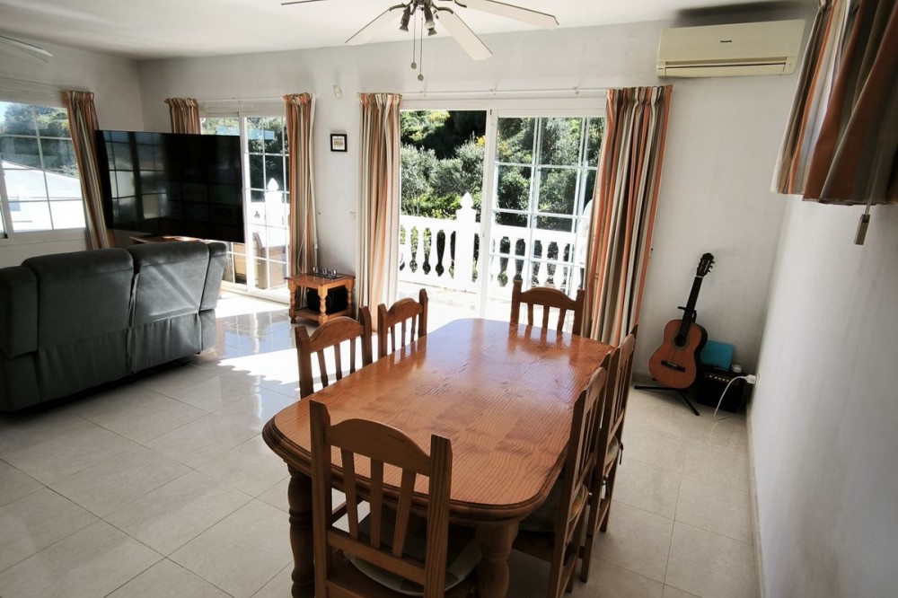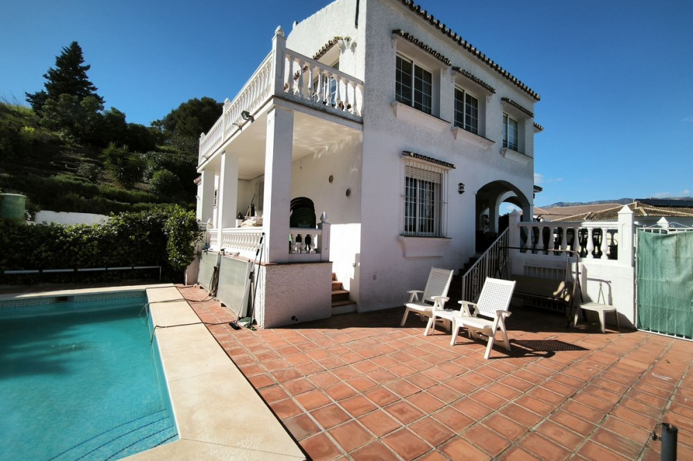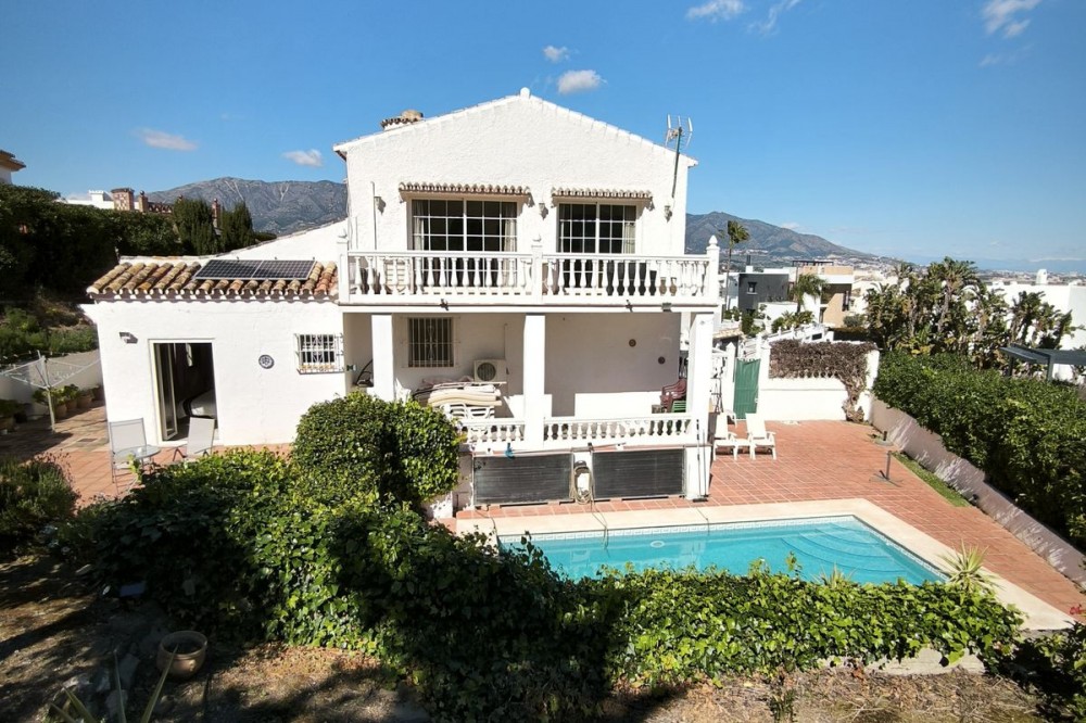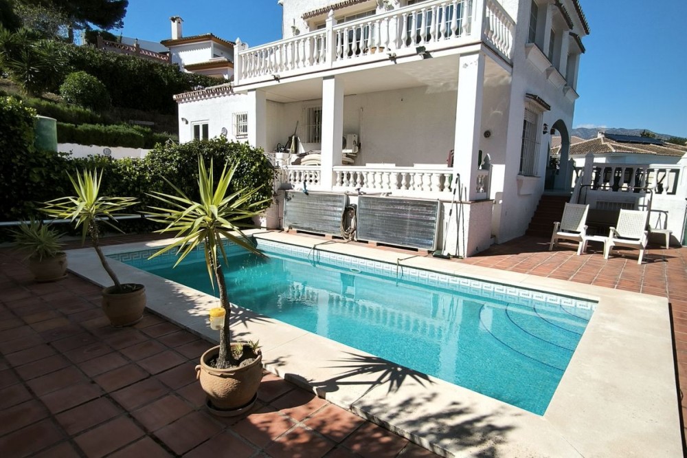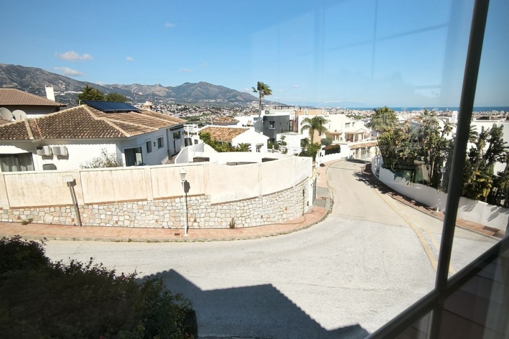 - Elegant Villa with Panoramic Sea, Mountain and Countryside Views in Cerros del Águila Set in the sought-after urbanisation of Cerros del Águila, this impressive villa combines space, privacy and stunning surroundings, with beautiful panoramic views of the Mediterranean Sea, the mountains and the open countryside. The property offers 5 generously sized bedrooms, with 3 bedrooms on the ground floor and 2 on the upper level, making it an ideal home for families or for those seeking generous guest accommodation. There are 3 well-appointed bathrooms, including 1 en-suite. On the main level, the villa features a modern kitchen that flows into a bright and spacious living room with direct access to a large terrace. This is the perfect setting for al fresco dining, entertaining guests, or simply relaxing while enjoying the breathtaking sea views. Upstairs, you will find a second expansive living area, currently used as a TV lounge and bar, offering a wonderful additional space for leisure and socialising. From here, there is access to a private terrace overlooking the beautiful garden and swimming pool, creating a tranquil and intimate retreat. The outdoor areas are equally impressive, with a large terrace surrounding the swimming pool, ideal for enjoying the Mediterranean lifestyle, whether sunbathing, dining outdoors or spending quality time with family and friends. The location is excellent, just 10 minutes from the beaches of Fuengirola and only 5 minutes from the newly opened Gran Parque de Mijas, a fantastic recreational area offering a wide variety of leisure activities for all ages. This is a wonderful opportunity to acquire a spacious and beautifully positioned villa in one of the area’s most desirable residential locations.