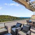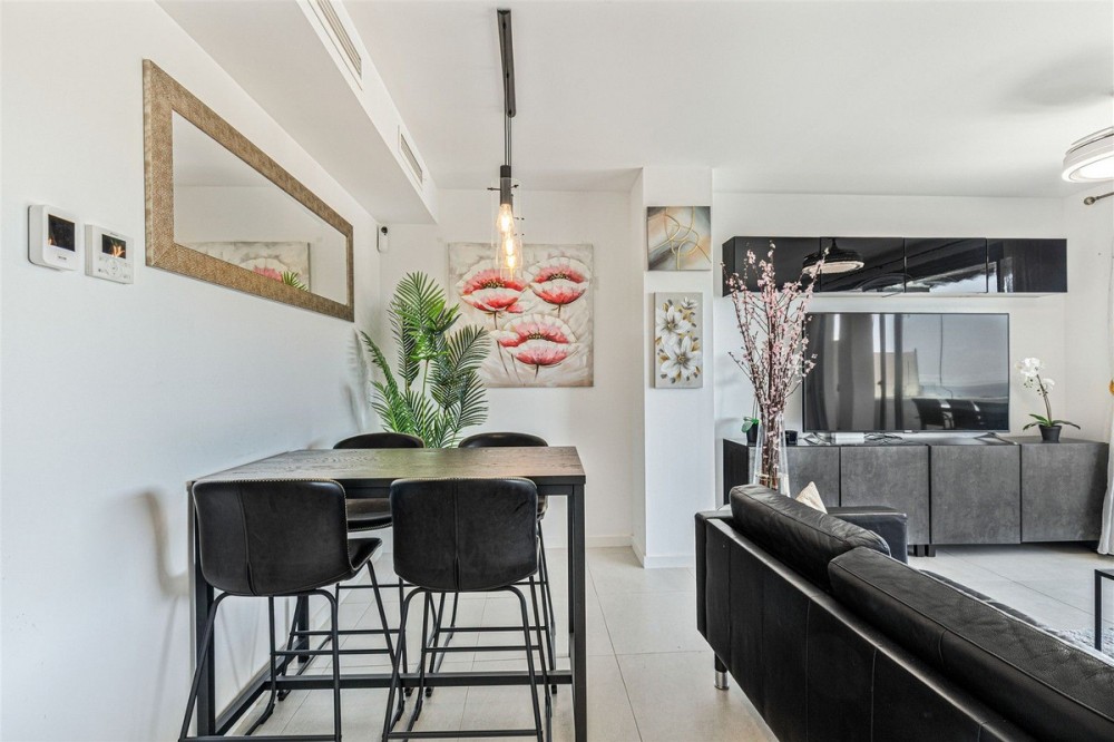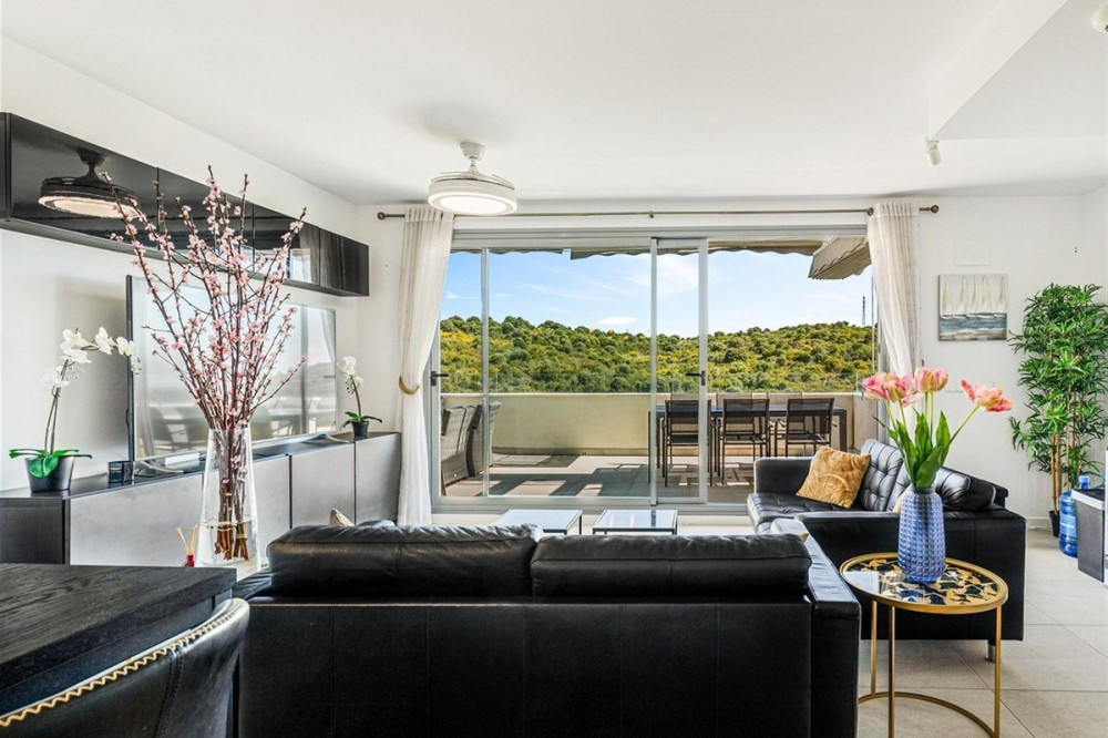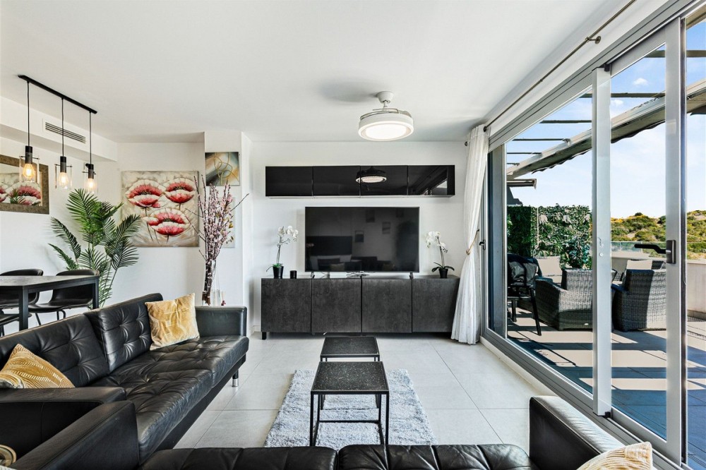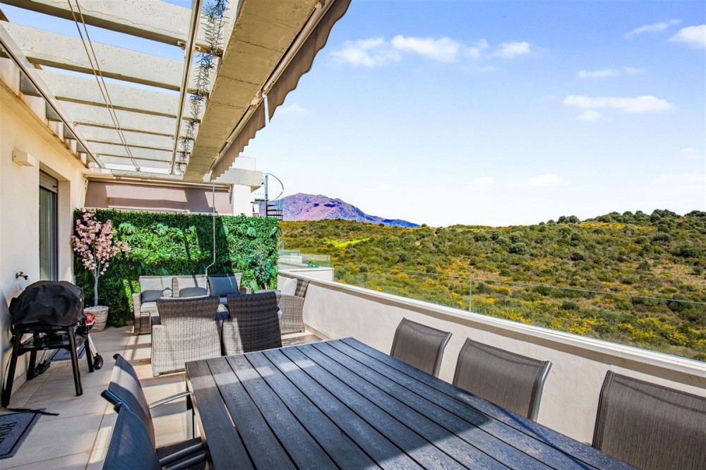 - Enjoy Sophisticated Coastal Living in this fully furnished modern 3 Bedroom Duplex Penthouse with Sea Views in Estepona. This impressive 3 bedroom duplex penthouse located in West Estepona, stands out for its spacious layout and beautiful sea views. Set within a gated community, it offers the perfect balance of tranquility by the sea and convenient access to nearby golf courses, shops, restaurants, and schools. The property features a bright and spacious open plan living area that connects to a private serene terrace, creating an ideal space to relax while enjoying this peaceful retreat and views of the sea, farmland and surrounding mountains. The modern fully equipped kitchen integrates with the living space and includes high quality appliances along with a practical separate and discreet laundry area. On the main level there are two well proportioned bedrooms with built in wardrobes and two full bathrooms one of which is en suite. These bedrooms are designed to provide both comfort and privacy. The master bedroom also benefits from its own private terrace overlooking the communal pool and gardens. An internal staircase leads to the upper level, where you will find the third bedroom, bathroom and direct access to a generous solarium. This outdoor space enjoys all day sun and offers stunning 360 degree views. Additional features include air conditioning, shutters, double glazing, a reinforced security door, an underground parking space and a storage room. The residential complex is well maintained, offering a communal swimming pool, mature gardens, and lift access, The property is in excellent condition and ideally located just a five minute drive to the beach, 10 minutes from Estepona town centre, and 20 minutes to Marbella and 15 minutes to Sotogrande. This is an excellent opportunity to acquire a modern, move in ready home, ideal as a permanent residence or a second home on the Costa del Sol.