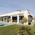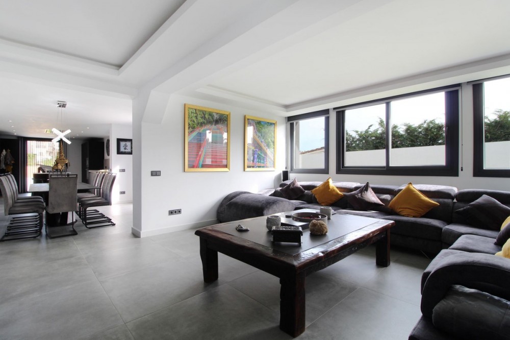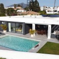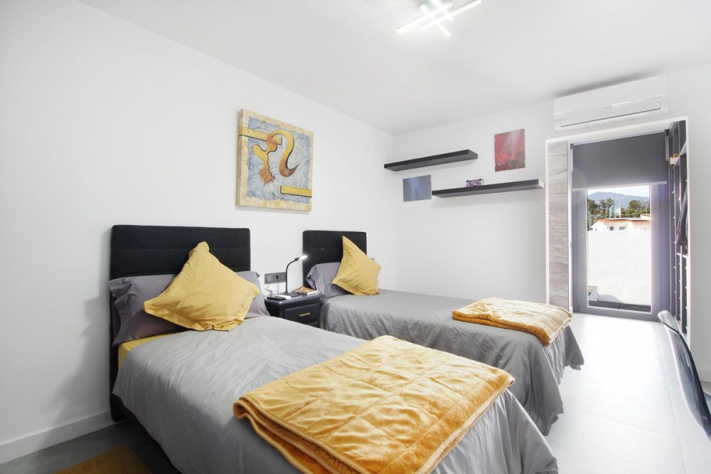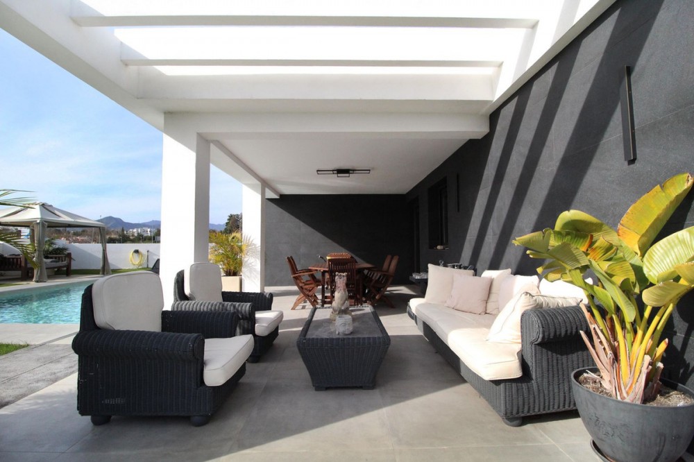 - Don't miss this fantastic villa, beachside of San Pedro de Alcantara This unique, single-level modern home, was completely renovated in 2023, and offers an exceptional living experience. Crafted with top-quality materials, the villa features three spacious bedrooms and three fully equipped bathrooms and a guest toilet.. Enjoy a grand, state-of-the-art kitchen, open plan living /dining area, a modern fireplace, and a BBQ area, beautifully illuminated by LED lighting throughout. The stunning terrace leads to a fantastic swimming pool with shallow area and lush garden, highlighting the villa's minimalistic design and large windows that enjoy abundant natural light. The property has been recently and completely modernized, situated in a quiet location near San Pedro Beach. It’s also close to numerous bars, restaurants, and the San Pedro Boulevard, with excellent motorway access. Located just moments from the beach, you’ll have easy access to San Pedro's town area, the modern boulevard, as well as the picturesque promenade connecting to Puerto Banus and Estepona. Upon entering, you are greeted by a beautifully crafted wooden front door and a seated area with a mature lemon tree. A guest bathroom is to your right, and as you walk down the hallway, the first bedroom with an ensuite bathroom is on the right, while the open kitchen and dining room area with the latest appliances are on the left. The second bedroom is just next to the first, also with ensuite and ample cupboard space. The well designed living area makes this a comfortable and welcoming home. The main bedroom has a terrace leading to the swimming pool and double doors, with another en suite bathroom. The house is decorated to a high standard, featuring custom-made furniture influenced by Southeast Asia. The stone-carved sinks add a unique touch to the property. On the roof, there is a pre-installation for a solarium area, including the possibility of a Jacuzzi and open kitchen / barbecue. The large grass area, covered terrace, and expansive pool make this perfect for a holiday home or permanent residence for those who want to be in bustling San Pedro.