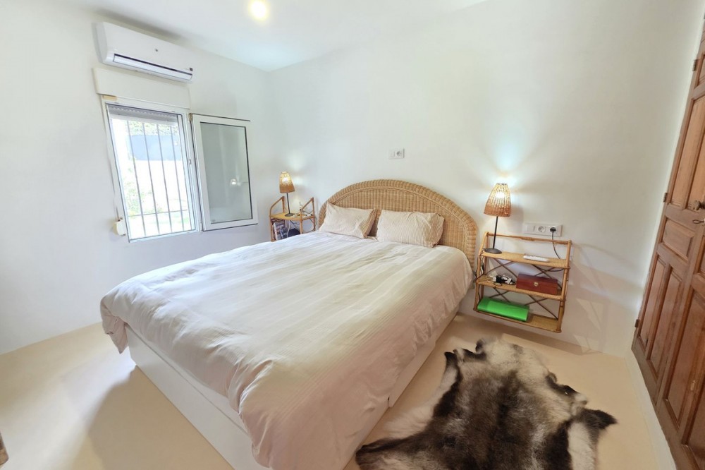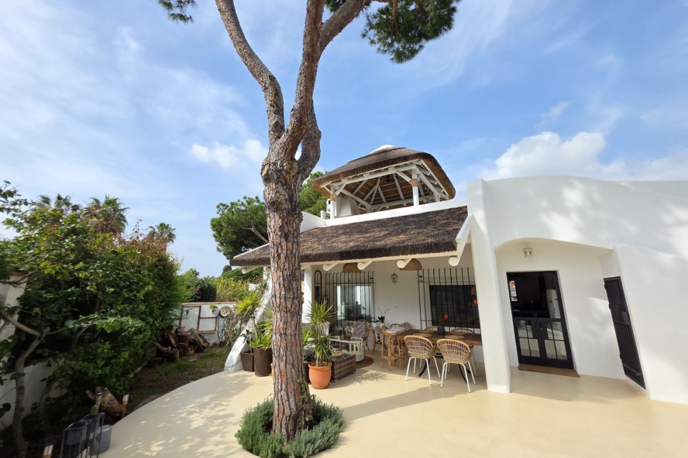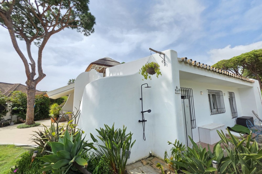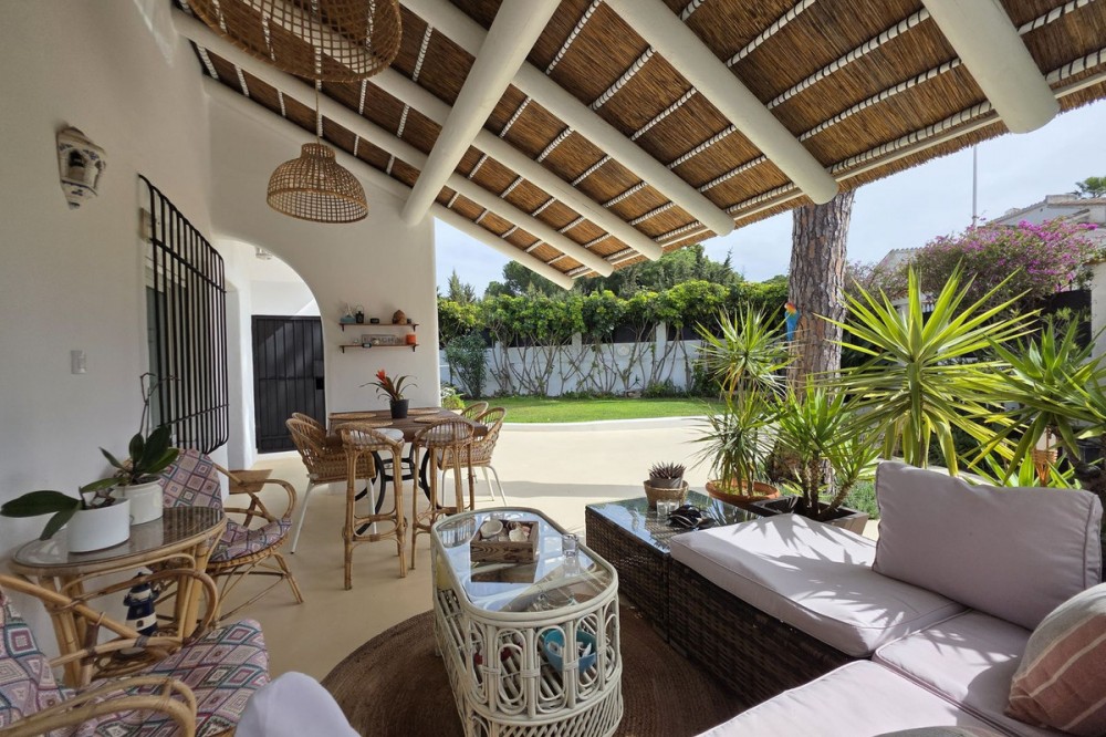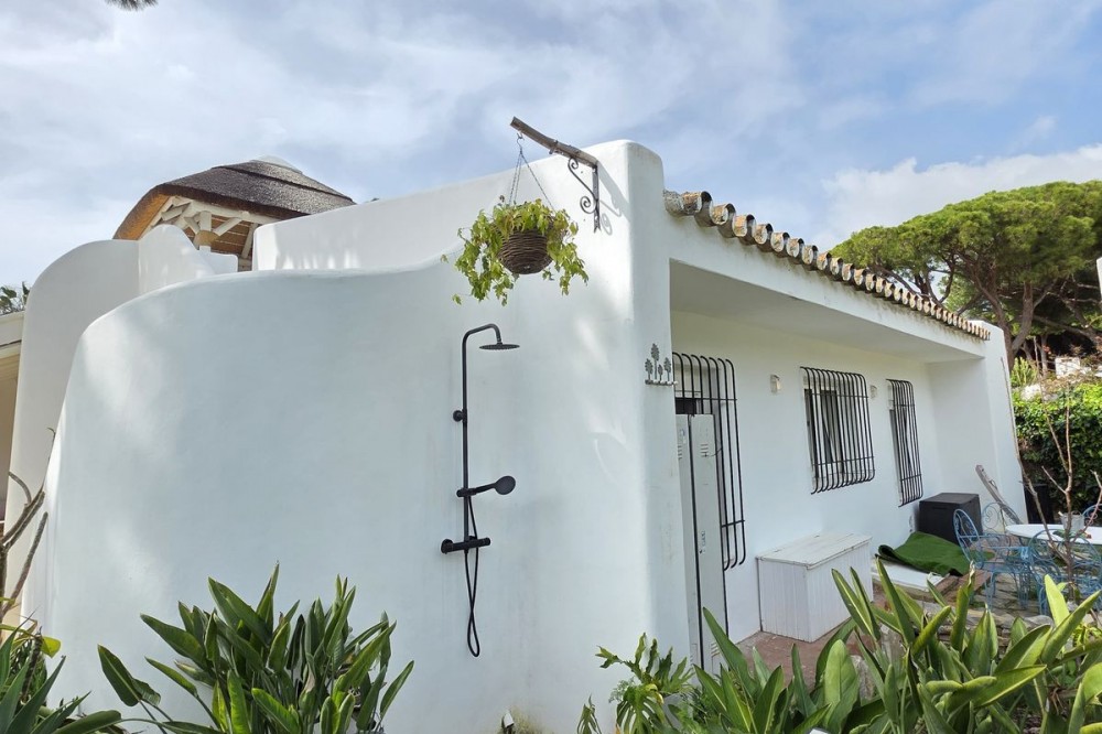 - Live the Andalusian Dream with Ibizan Flair by the Sea! We are pleased to present this exclusive detached corner villa, an architectural gem that has been fully refurbished in an exquisite Ibizan style, combining Mediterranean warmth with the most modern comforts. Located in a privileged setting, just 500 metres from the sea, this property offers a unique lifestyle where design and functionality come together on a single floor, with no stairs. The house has undergone a complete renovation, with every detail carefully considered to create bright, open and welcoming spaces. It sits on a generous private plot of almost 500 m², offering exceptional outdoor space to enjoy the area’s excellent climate in total privacy. Main features: Design & Layout: 3 spacious bedrooms and 2 full luxury bathrooms, finished with high‑quality materials and a contemporary, Ibizan‑inspired aesthetic. The entire property is arranged on a single level, ensuring easy access and a smooth flow between rooms. Private On‑Plot Parking: The property has its own parking area within the plot, with capacity for 2 cars and equipped with an electric gate to ensure maximum security and convenience. Outdoor Oasis: Private plot of almost 500 m² with garden and terrace areas, ideal for creating your own outdoor paradise. Functionality: Includes a utility room and pantry, cleverly integrated for optimal home organisation. Exclusivity & Surroundings: The property is part of a gated and very select community of only 13 villas, guaranteeing a quiet and secure residential environment. In addition, you can enjoy excellent communal areas: – Communal swimming pool open all year round – Social club for events and moments of relaxation – Multi‑sports court for fitness and outdoor activities This house is not just a property; it is a peaceful retreat with the character of Ibizan style and the advantage of a brand‑new, full refurbishment in an unbeatable location. Come and discover your new home by the Mediterranean!