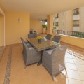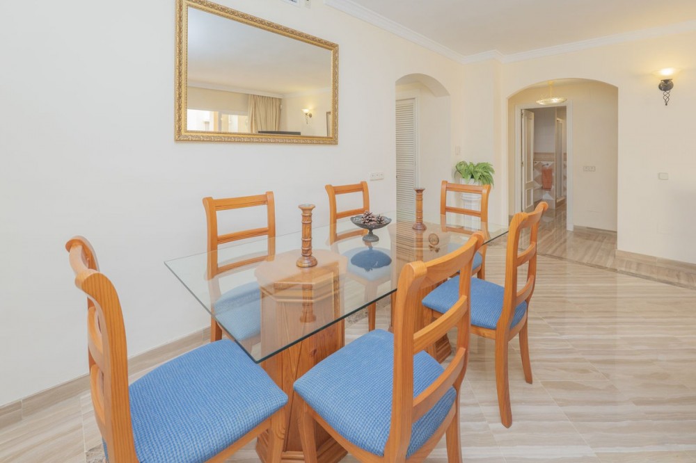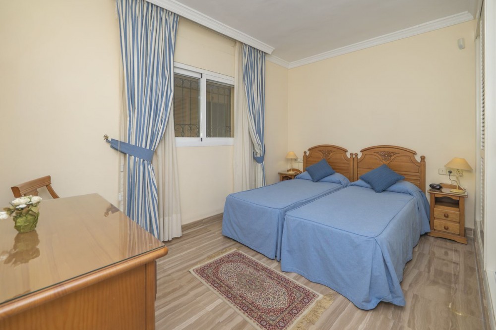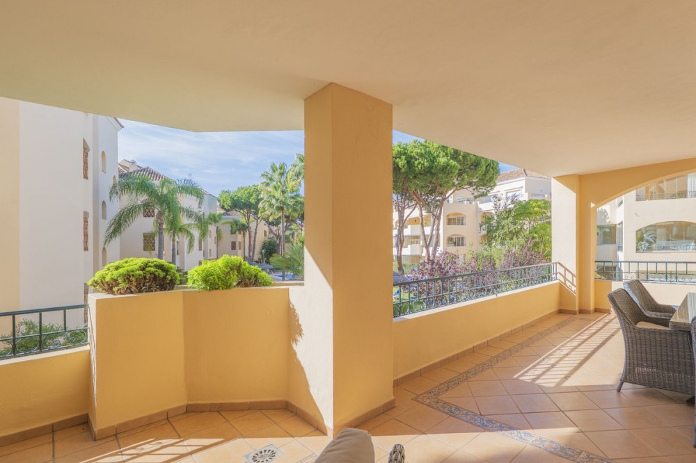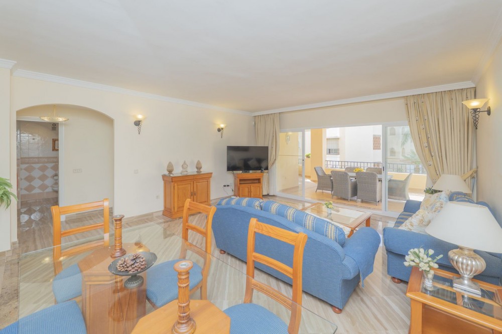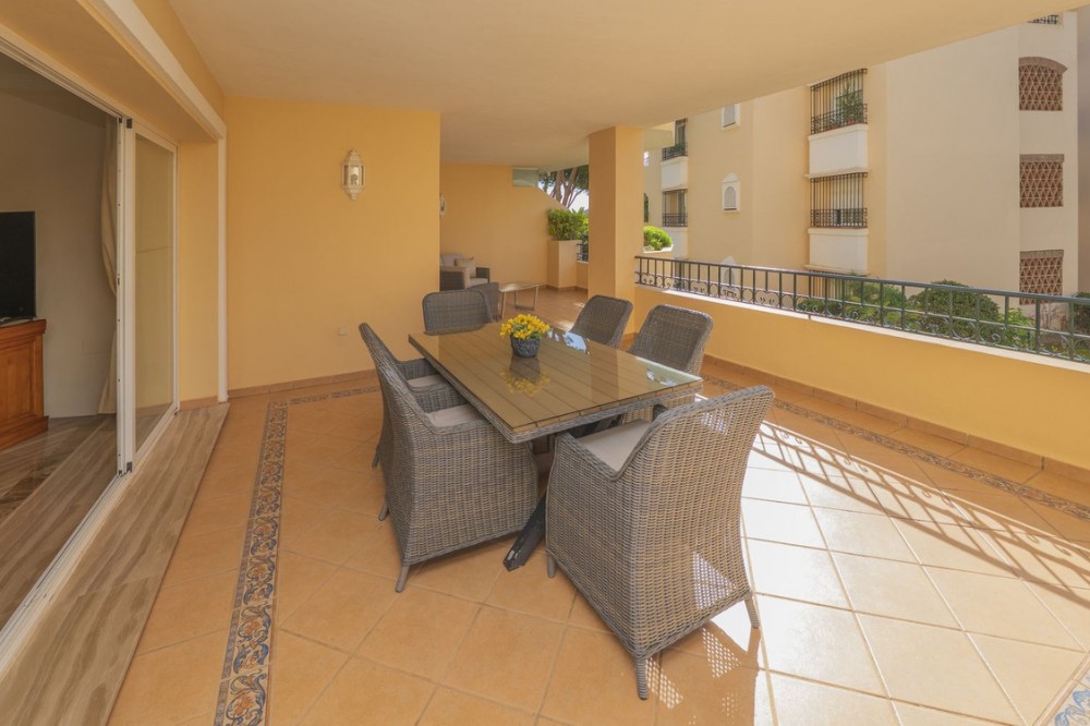 - Great Middle Floor Apartment at Hacienda Playa, Elviria beachside. The best and most important development beachside Elviria would be Hacienda Playa Complex, made up of several phases and boasting high end building materials and finishes, as well as properly taken care of common green areas, with a big adult pool as well as children's. This unit comprises two bedrooms, the main one en suite, and two bathrooms; an ample living room with dining area and access to the huge garden facing covered terrace adding up to 38sqm, besides, a complete kitchen with utility room. A spacious apartment with marble flooring and double glazing. The property includes private underground huge private parking space and storage room. Located at short distance of Elviria's Open Commercial Center offering a plethora of facilities such as pharmacy, supermarkets, hardware store, municipality, etc. Besides, a number of leisure and gastronomic businesses. All in a privileged location beachside the A7 with all the chiringuitos, beach clubs and restaurants of Elviria Beaches. Property Tax: IBI 910€ (dwelling + parking and storage). Community Fee: 172€/month. Garbage Tax: 185€/year.