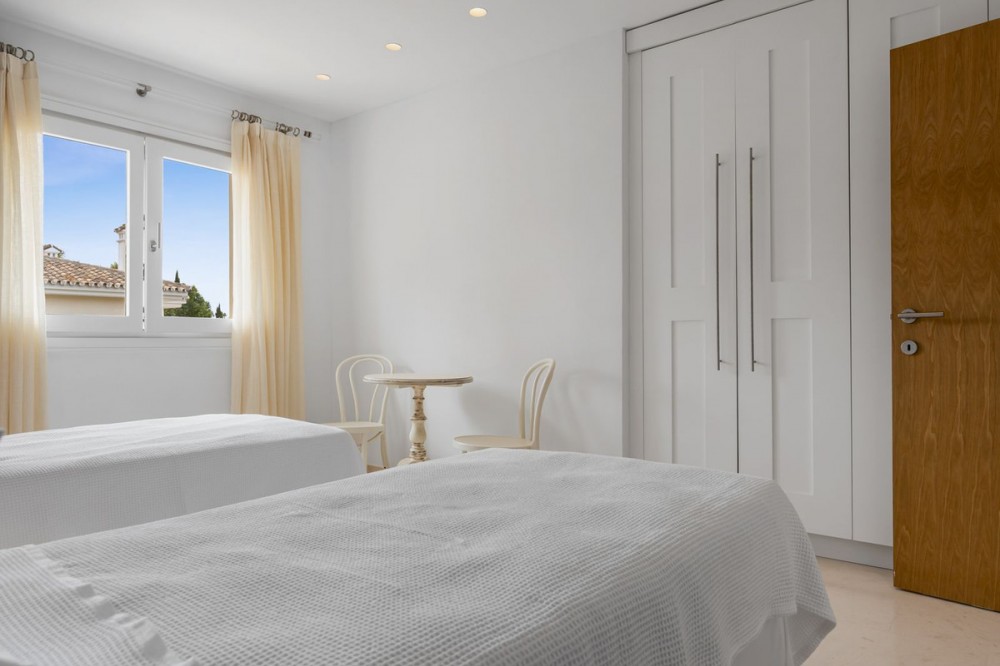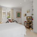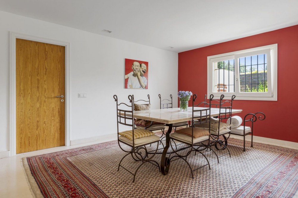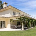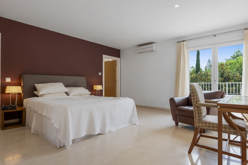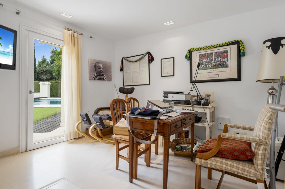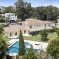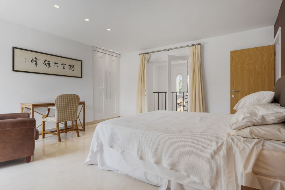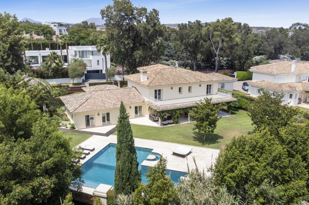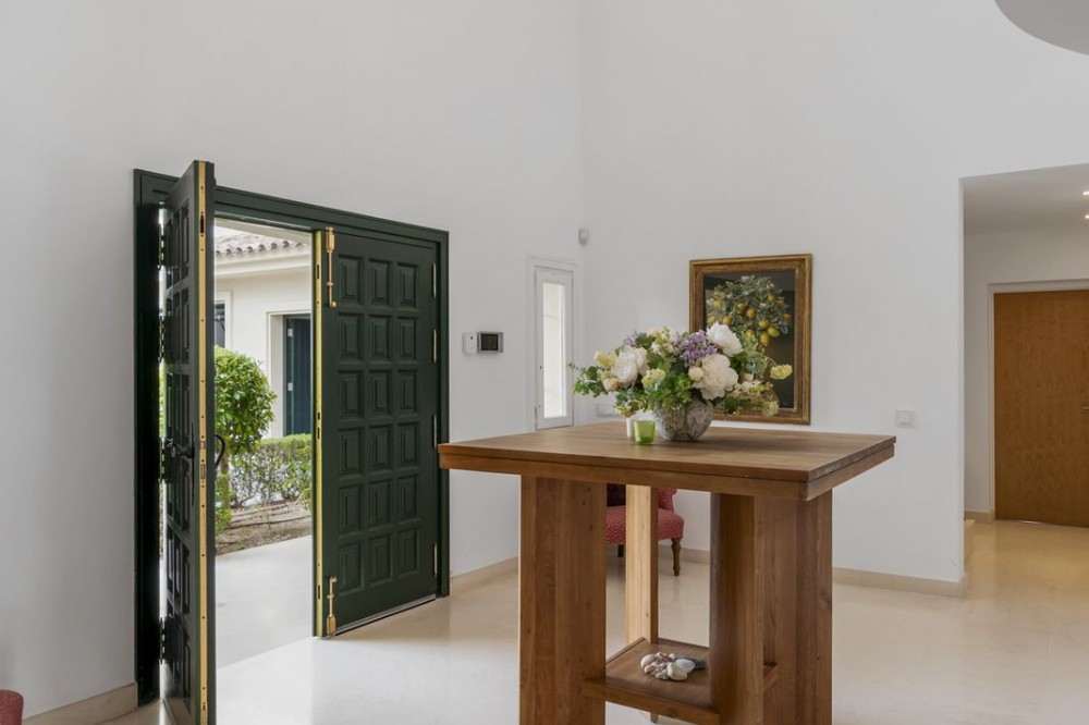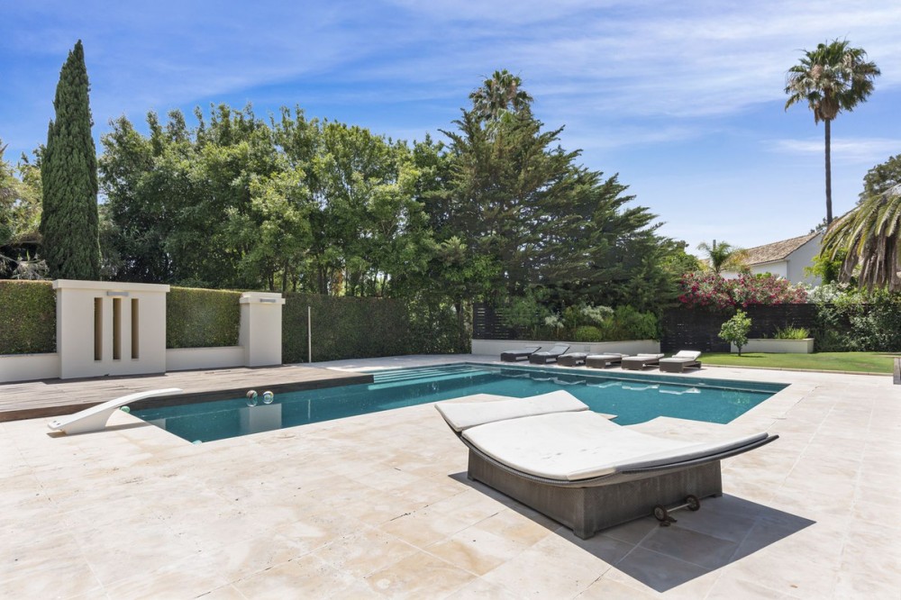 - Modern Andalucian Villa in the Prestigious Kings and Queens, Sotogrande Costa Welcome to this exquisite Modern Andalucian Villa, situated in the prestigious Kings and Queens area of the highly sought-after Sotogrande Costa location. This exceptional property offers a perfect blend of contemporary luxury and traditional charm, set on a generous south-facing plot with mature gardens and versatile entertainment spaces. The villa features a large swimming pool surrounded by natural flagstones and decking, providing the perfect environment for relaxation and social gatherings. Upon entering, you are greeted by a double volume entrance hall that leads to a spacious open plan kitchen and formal lounge, both of which open onto a covered patio with access to the gardens and pool. The ground floor also includes a formal dining room, a separate laundry area, a service bathroom, and ample storage spaces. In the right wing, there is a very large master bedroom with a walk-in wardrobe, en-suite bathroom, and direct access to the gardens and pool, a private study, as well as an additional private suite with a bedroom and en-suite bathroom. The upper level boasts two large bedrooms with en-suite bathrooms, both leading onto a spacious terrace overlooking the gardens and pool. Additionally, there are two more bedrooms sharing a bathroom, along with a separate informal lounge/TV room. The property also includes a large parking area, a private garage, and elegant fountains at the entrance. This villa epitomizes luxury living, offering ample space, modern amenities, and beautiful surroundings, making it the ideal setting for a serene retreat or entertaining guests.