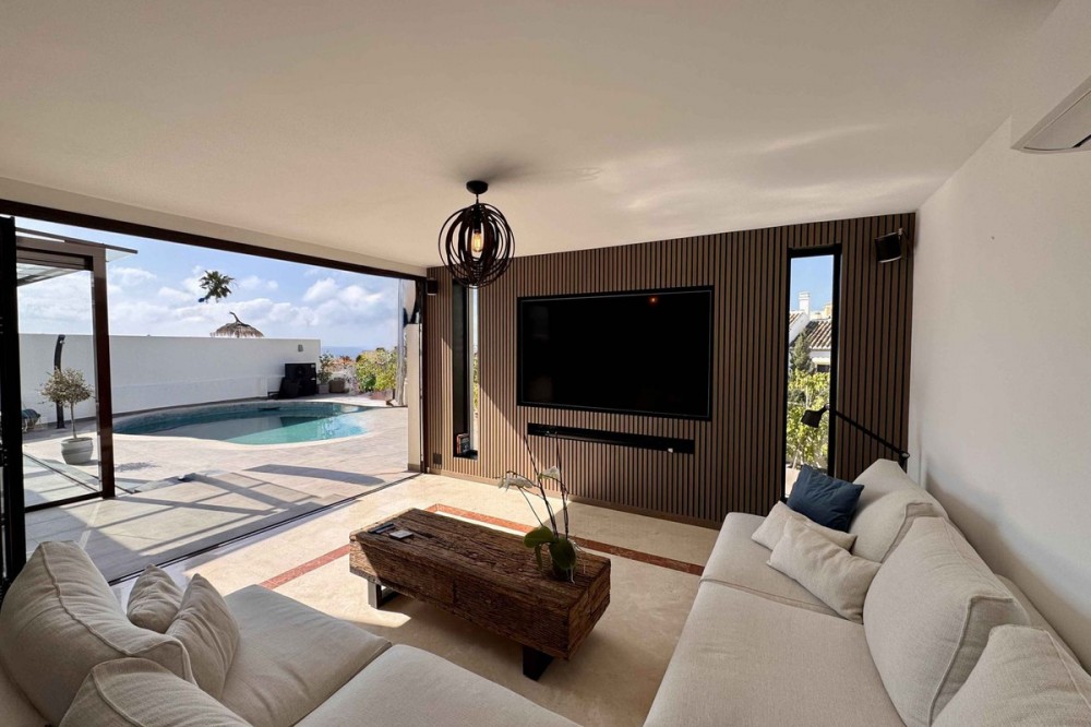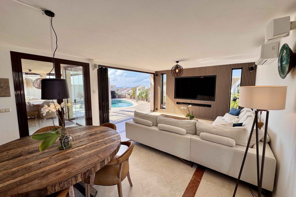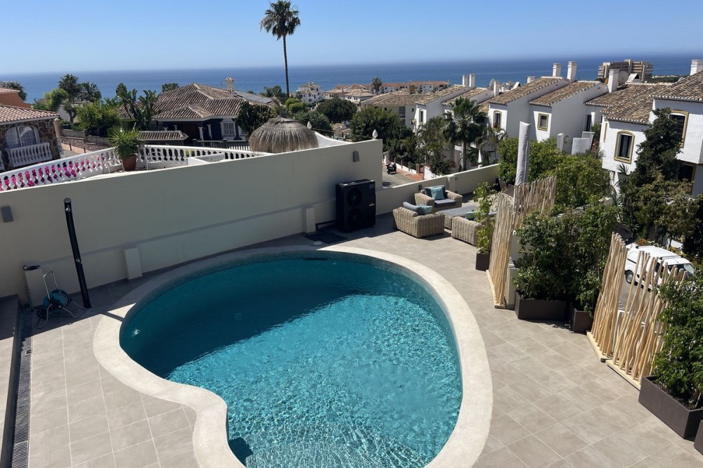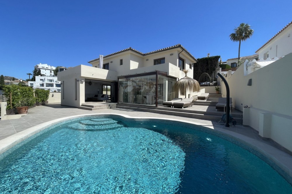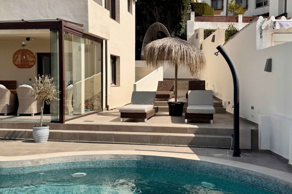 • Introducing an exceptional detached villa in Riviera del Sol—a prime opportunity to secure a luxury home in one of the Costa del Sol’s most sought-after coastal locations, just a short walk from the beach, restaurants, and everyday amenities. This beautifully renovated property offers four generous bedrooms, four stylish bathrooms, and a separate self-contained apartment—ideal for guests, extended family, or rental income potential. Finished to an impeccable standard, the villa features marble flooring, air conditioning, double glazing, underfloor heating, and an integrated Sonos sound system, delivering both comfort and sophistication throughout. The main living area is bright, open, and designed for modern living, with expansive windows and folding glass doors that create a seamless indoor-outdoor experience. The southwest orientation ensures all-day sun, enhancing both the interior ambiance and the outdoor lifestyle. A glass-curtained terrace provides a versatile year-round entertaining space. The high-spec kitchen is fully equipped with premium appliances and flows effortlessly into the dining area—perfect for hosting and social occasions. A guest bedroom and contemporary bathroom on this level add flexibility and convenience. Upstairs, the bedrooms are spacious and elegantly finished, each with luxurious en-suite bathrooms. The master suite and second bedroom enjoy private terraces with attractive views towards the Mediterranean—ideal for relaxing or entertaining. Outside, the property truly shines. A heated swimming pool, dedicated BBQ area, and expansive terraces create the perfect setting for outdoor living. The landscaped garden, complete with mature orange, lemon, and avocado trees, adds a unique Mediterranean charm. Combining location, quality, and lifestyle appeal, this villa represents an outstanding investment—whether as a full-time residence, high-end holiday home, or premium rental property on the Costa del Sol.