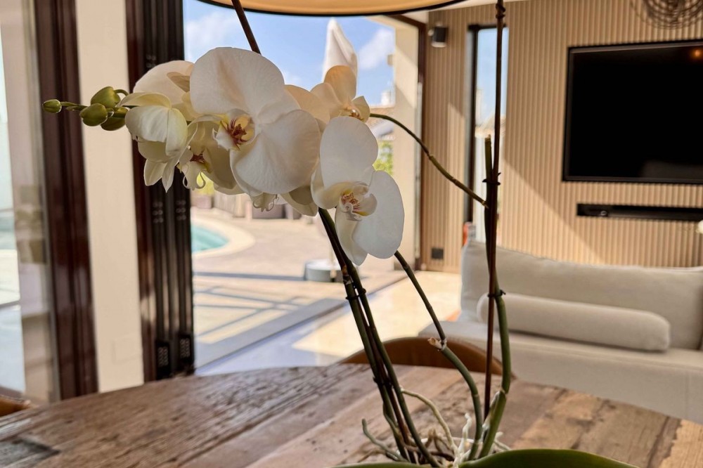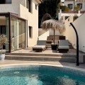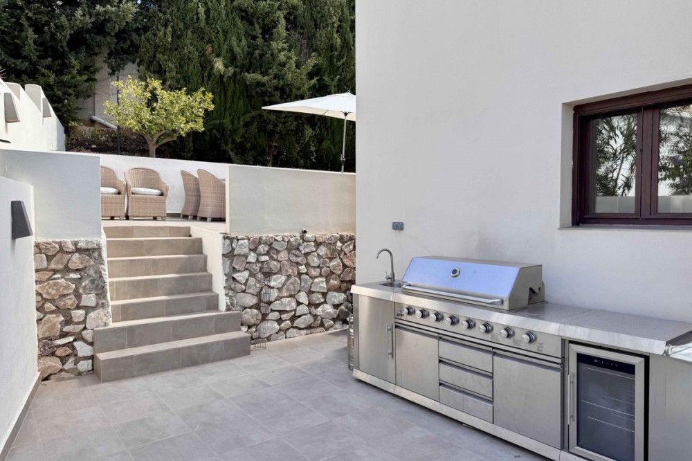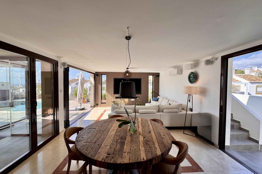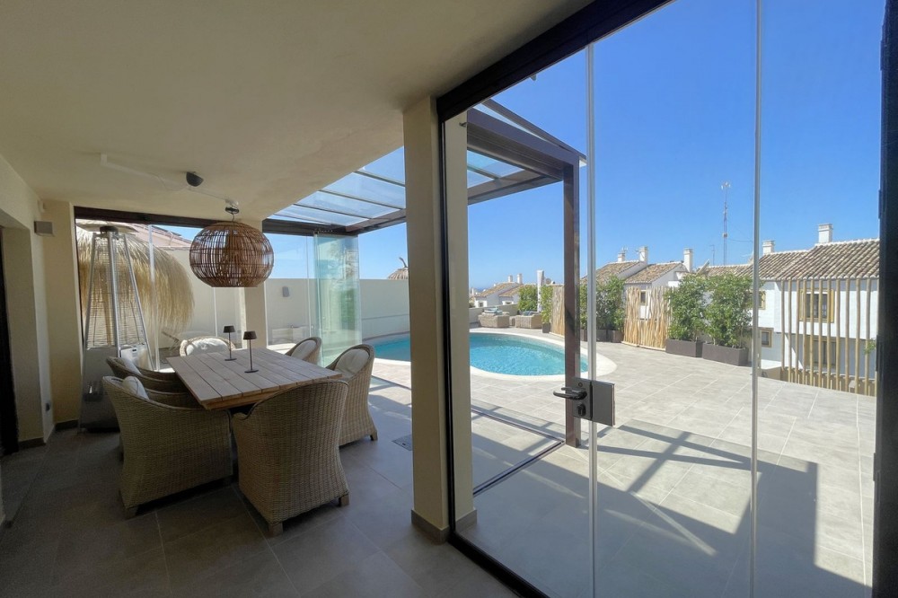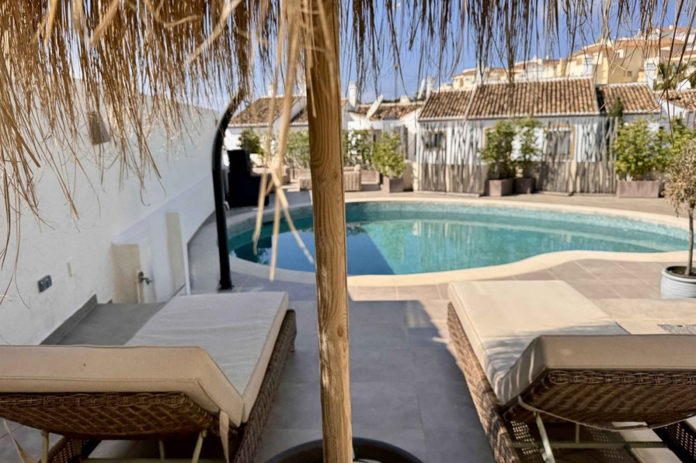 • Introducing an exceptional detached villa in Riviera del Sol—a prime opportunity to secure a luxury home in one of the Costa del Sol’s most sought-after coastal locations, just a short walk from the beach, restaurants, and everyday amenities. This beautifully renovated property offers four generous bedrooms, four stylish bathrooms, and a separate self-contained apartment—ideal for guests, extended family, or rental income potential. Finished to an impeccable standard, the villa features marble flooring, air conditioning, double glazing, underfloor heating, and an integrated Sonos sound system, delivering both comfort and sophistication throughout. The main living area is bright, open, and designed for modern living, with expansive windows and folding glass doors that create a seamless indoor-outdoor experience. The southwest orientation ensures all-day sun, enhancing both the interior ambiance and the outdoor lifestyle. A glass-curtained terrace provides a versatile year-round entertaining space. The high-spec kitchen is fully equipped with premium appliances and flows effortlessly into the dining area—perfect for hosting and social occasions. A guest bedroom and contemporary bathroom on this level add flexibility and convenience. Upstairs, the bedrooms are spacious and elegantly finished, each with luxurious en-suite bathrooms. The master suite and second bedroom enjoy private terraces with attractive views towards the Mediterranean—ideal for relaxing or entertaining. Outside, the property truly shines. A heated swimming pool, dedicated BBQ area, and expansive terraces create the perfect setting for outdoor living. The landscaped garden, complete with mature orange, lemon, and avocado trees, adds a unique Mediterranean charm. Combining location, quality, and lifestyle appeal, this villa represents an outstanding investment—whether as a full-time residence, high-end holiday home, or premium rental property on the Costa del Sol.