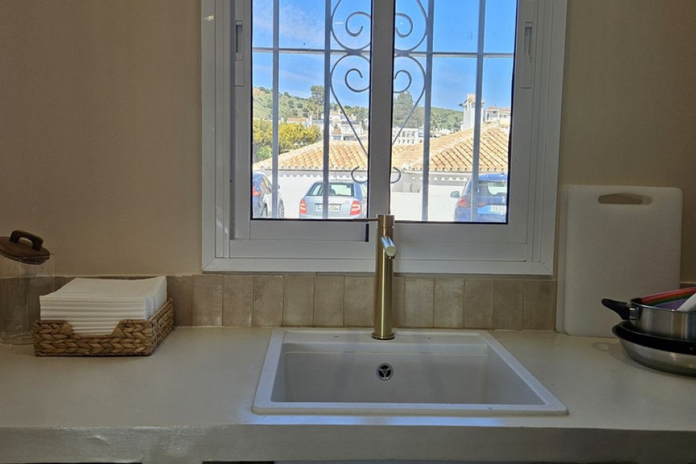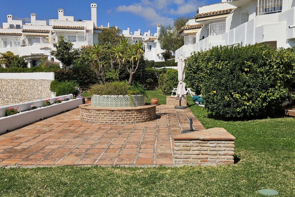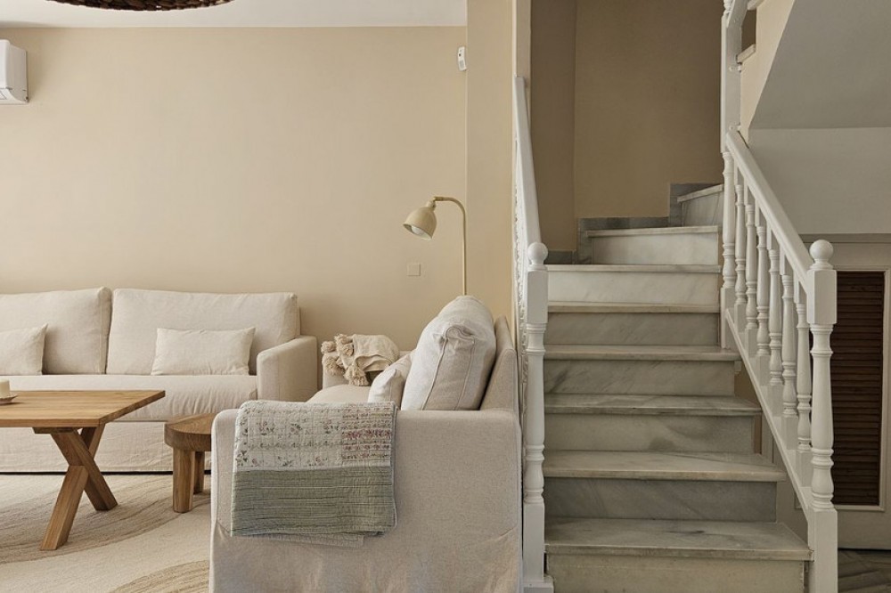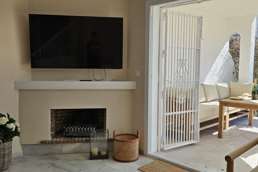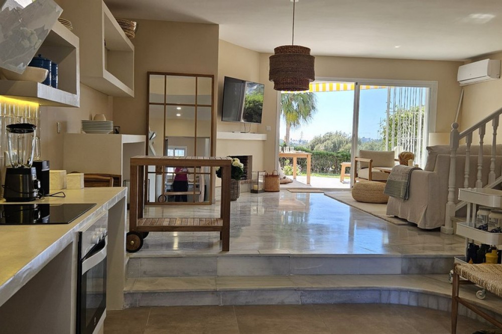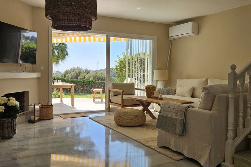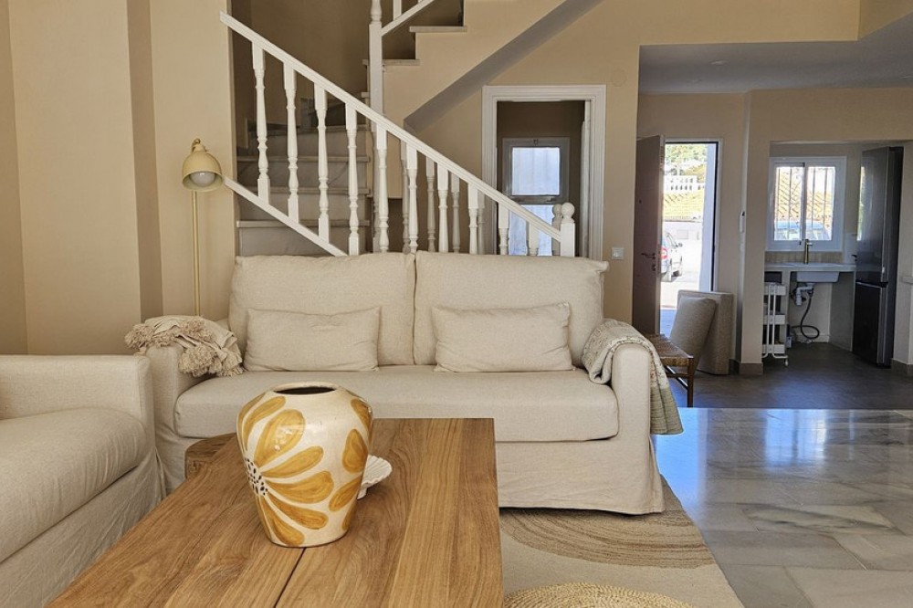 - Elegant and charmingTownhouse with Open Views in Calahonda Set within the highly sought-after urbanisation of La Cornisa, this beautifully renovated townhouse offers an effortless blend of style, tranquillity, and Mediterranean charm—surrounded by lush greenery and a lovely sense of openness. The entrance level welcomes you into a refined open-plan living space, where a newly renovated kitchen flows seamlessly into the lounge. The interior is thoughtfully curated in a sophisticated bohemian style, featuring brand-new, carefully selected furnishings—all unused—creating a fresh and inviting atmosphere. Large openings lead directly onto a charming terrace, where views of the manicured gardens are complemented by partial sea views—an ideal setting for relaxed outdoor living. A tastefully updated guest toilet completes this level. Upstairs, two serene bedrooms each open onto their own private terraces, both enjoying beautiful green views combined with partial views of the Mediterranean. Between the bedrooms, you will find a spacious, fully renovated bathroom finished to a high standard. From the master bedroom terrace, a private staircase leads to an exclusive rooftop terrace—an exceptional space designed for complete privacy, all-day sun, and a lovely open outlook. A perfect setting for quiet moments, entertaining, or simply embracing the Costa del Sol lifestyle. Ideally positioned in the heart of Calahonda, La Cornisa offers the rare combination of convenience and calm, with easy access to local restaurants, cafés, and shopping, while maintaining a distinctly peaceful ambiance. The urbanisation features expansive communal pool areas, ideal for enjoying long sunny days, social gatherings, or relaxed afternoons by the water. The property is offered fully furnished, allowing for a seamless and immediate move-in experience.