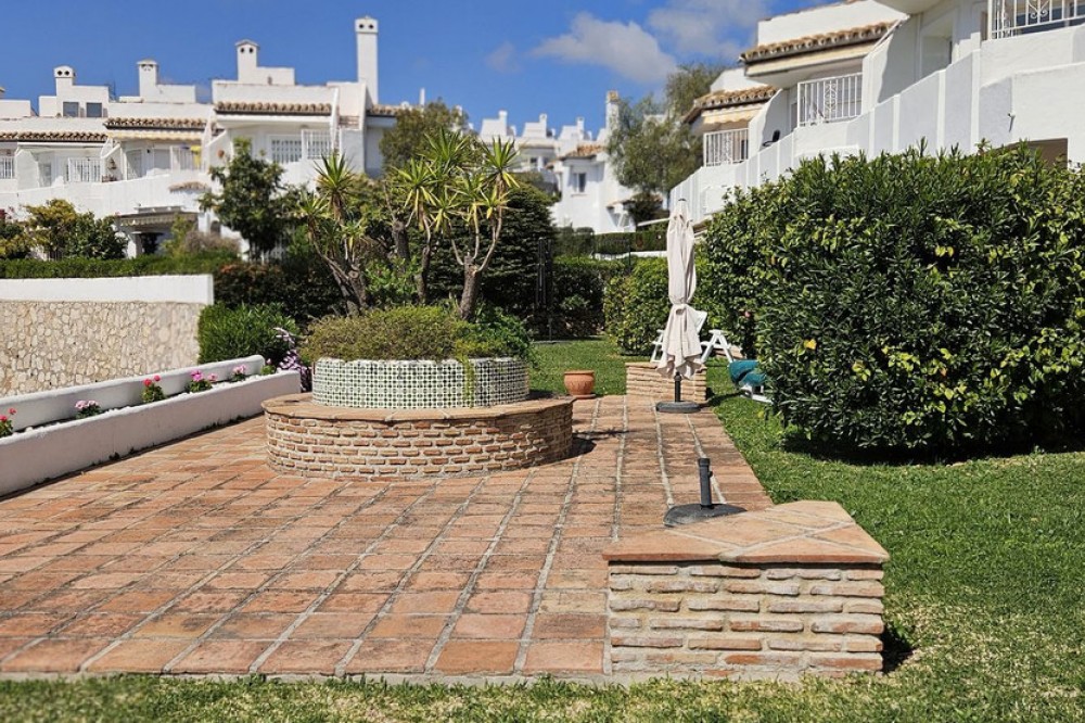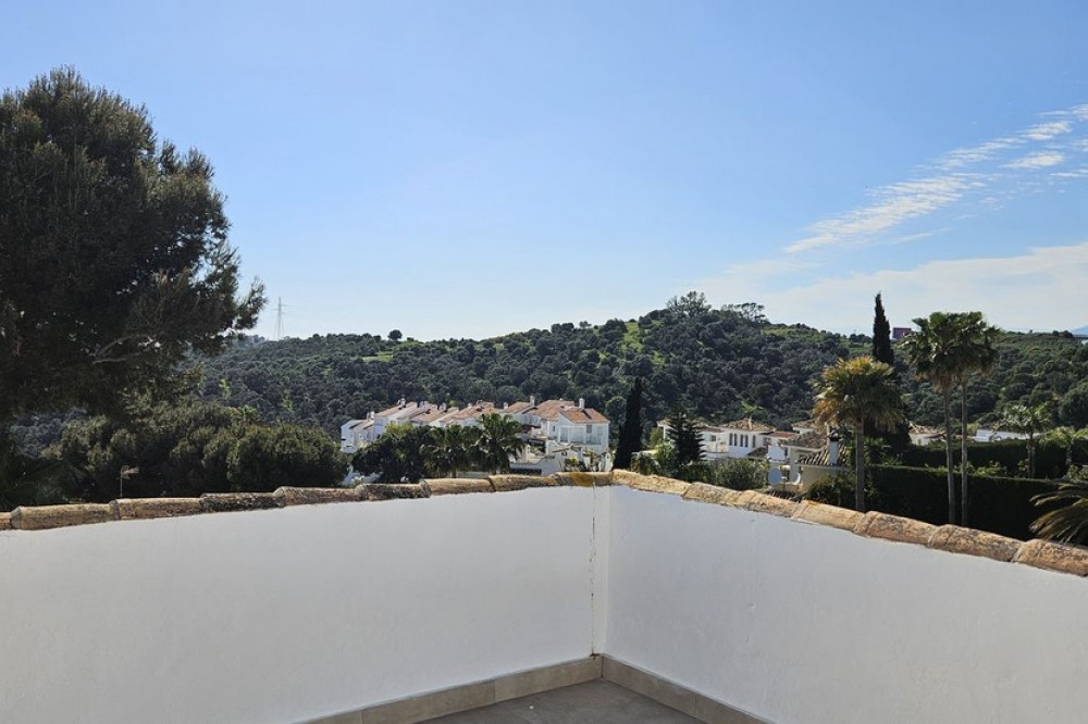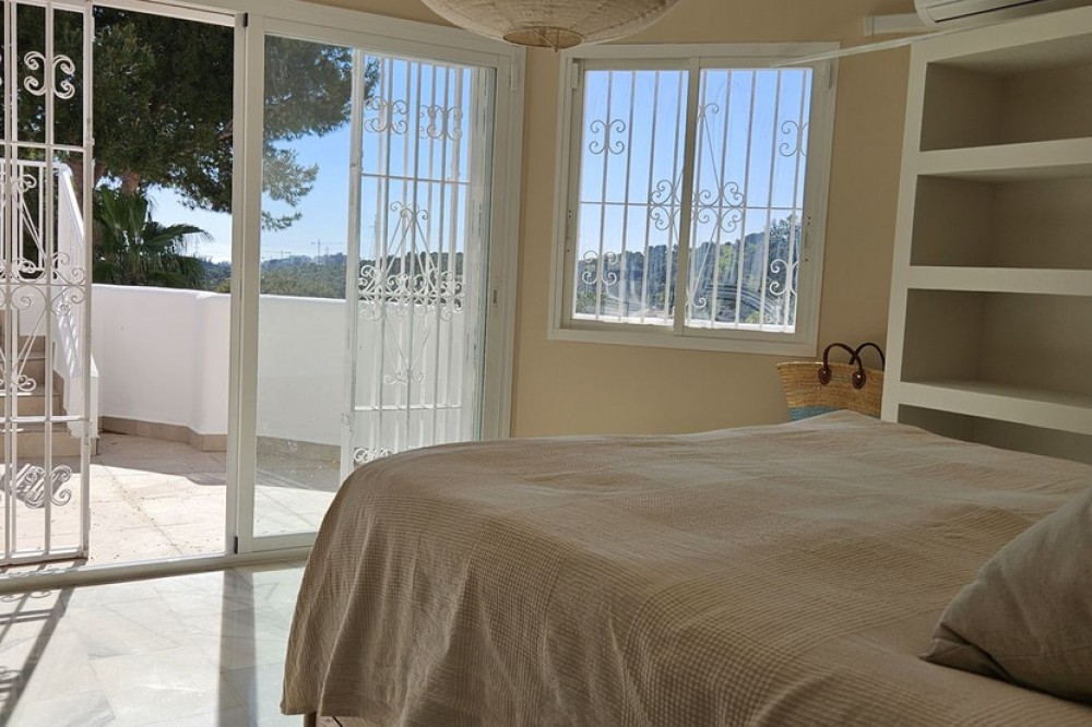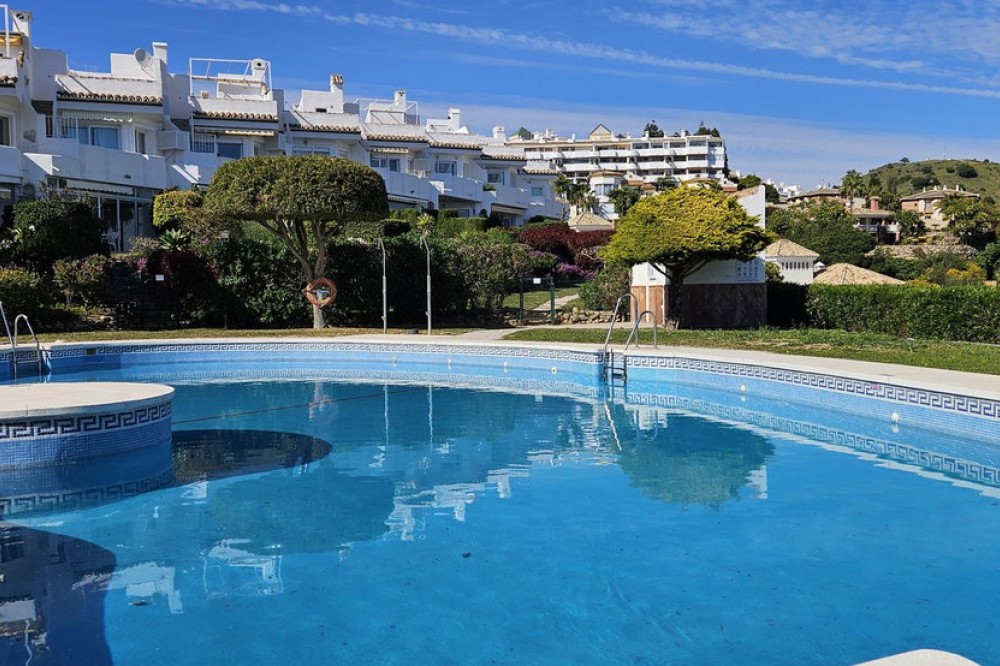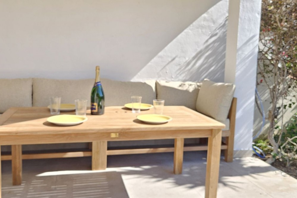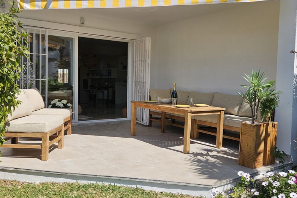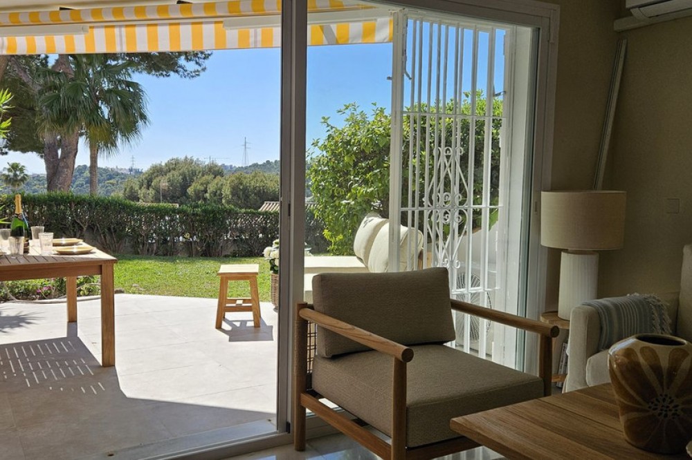 - Elegant and charmingTownhouse with Open Views in Calahonda Set within the highly sought-after urbanisation of La Cornisa, this beautifully renovated townhouse offers an effortless blend of style, tranquillity, and Mediterranean charm—surrounded by lush greenery and a lovely sense of openness. The entrance level welcomes you into a refined open-plan living space, where a newly renovated kitchen flows seamlessly into the lounge. The interior is thoughtfully curated in a sophisticated bohemian style, featuring brand-new, carefully selected furnishings—all unused—creating a fresh and inviting atmosphere. Large openings lead directly onto a charming terrace, where views of the manicured gardens are complemented by partial sea views—an ideal setting for relaxed outdoor living. A tastefully updated guest toilet completes this level. Upstairs, two serene bedrooms each open onto their own private terraces, both enjoying beautiful green views combined with partial views of the Mediterranean. Between the bedrooms, you will find a spacious, fully renovated bathroom finished to a high standard. From the master bedroom terrace, a private staircase leads to an exclusive rooftop terrace—an exceptional space designed for complete privacy, all-day sun, and a lovely open outlook. A perfect setting for quiet moments, entertaining, or simply embracing the Costa del Sol lifestyle. Ideally positioned in the heart of Calahonda, La Cornisa offers the rare combination of convenience and calm, with easy access to local restaurants, cafés, and shopping, while maintaining a distinctly peaceful ambiance. The urbanisation features expansive communal pool areas, ideal for enjoying long sunny days, social gatherings, or relaxed afternoons by the water. The property is offered fully furnished, allowing for a seamless and immediate move-in experience.