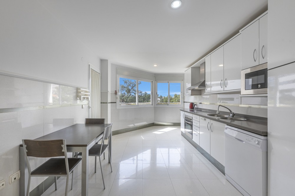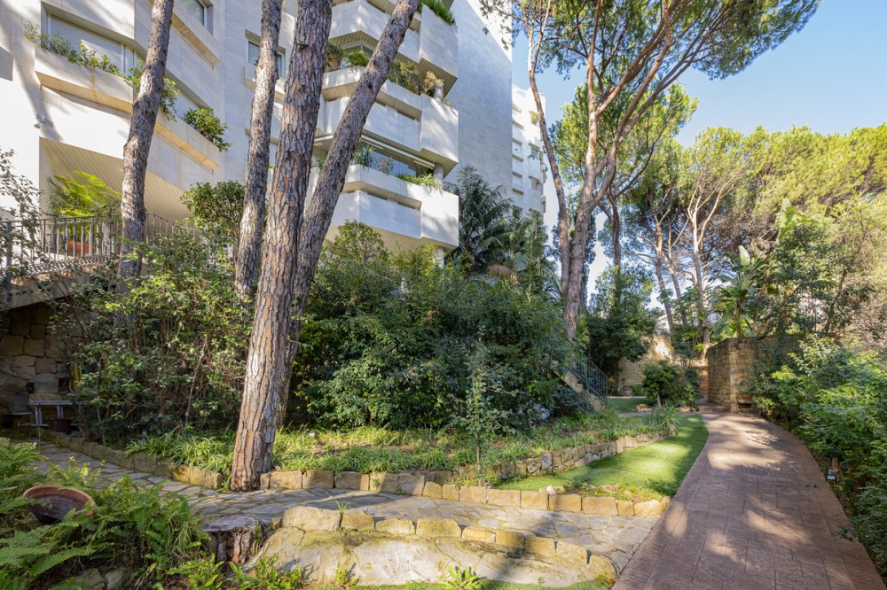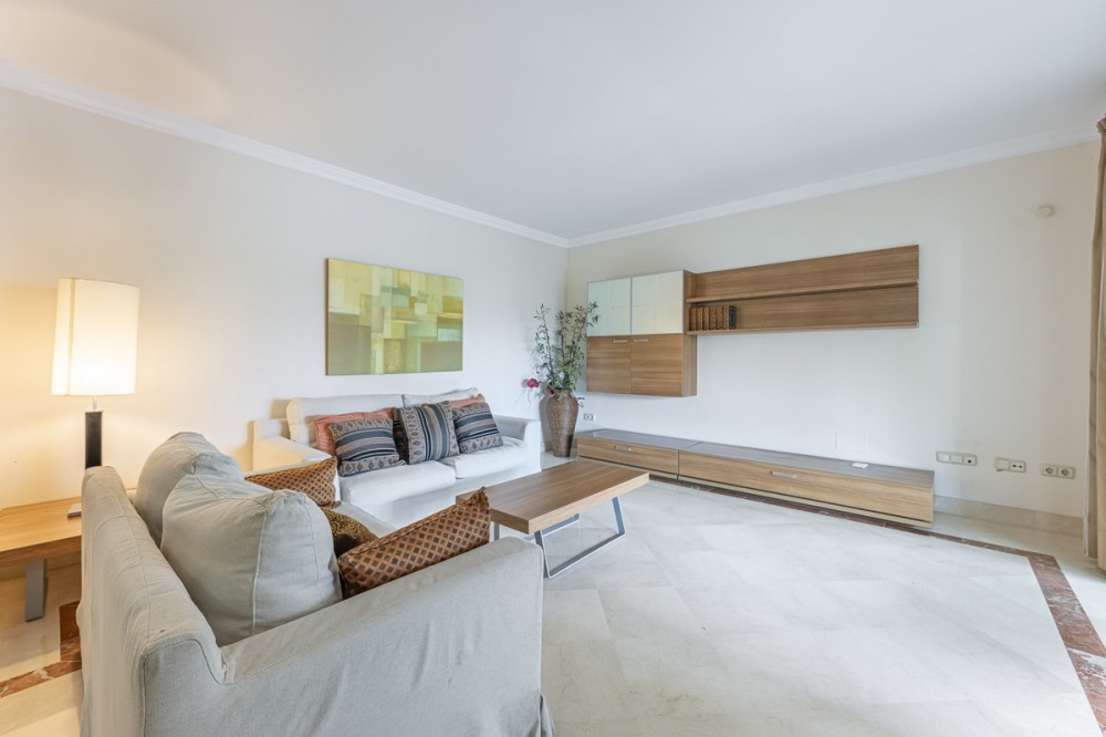- Located in Marbella’s prestigious Golden Mile, this elegant apartment offers a rare combination of prime location, comfort, and Mediterranean lifestyle. Set within the sought-after Jardín del Mediterráneo community, it is just a short stroll from the beachfront promenade and within walking distance of Marbella’s charming Old Town. Here, the শান্ত and privacy of a gated residential setting blend seamlessly with the vibrant social and culinary scene of beachfront restaurants, cafés, and chiringuitos. The apartment is thoughtfully designed to maximize natural light and functionality, featuring a well-balanced and fluid layout. It offers two bedrooms and two bathrooms, including a spacious master bedroom with en-suite bathroom and built-in wardrobes. The second bedroom also includes fitted wardrobes and is served by a full independent bathroom. The bright and inviting living-dining area forms the heart of the home, ideal for both everyday living and entertaining guests. The fully equipped kitchen includes a separate utility/laundry area for added convenience. With approximately 130 m² built, the property provides comfortable proportions and practical design. A key highlight is the covered terrace of approximately 14 m², located on the fourth floor with a southeast orientation. It enjoys abundant natural light throughout the morning and much of the day, along with pleasant partial views of the Mediterranean Sea and the surrounding mountains. This outdoor space serves as a natural extension of the living room, perfect for relaxed breakfasts, informal dining, or unwinding at the end of the day. The property is part of a well-established gated community known for its mature gardens and tranquil atmosphere. Jardín del Mediterráneo offers 24-hour security, concierge service, and two communal swimming pools set among beautifully landscaped grounds. The apartment also includes a private parking space and storage room. From a lifestyle and investment perspective, this property stands out for its exceptional location. The ability to walk to the beach, promenade, Old Town, and a wide range of amenities adds significant daily value. Whether as a permanent residence, holiday home, or rental investment, the Golden Mile remains one of the most desirable areas on the Costa del Sol. Distances: Beach: 2 minutes Marbella Old Town: 5 minutes Puerto Banús: 10 minutes International schools: 10–15 minutes Málaga Airport: 40 minutes