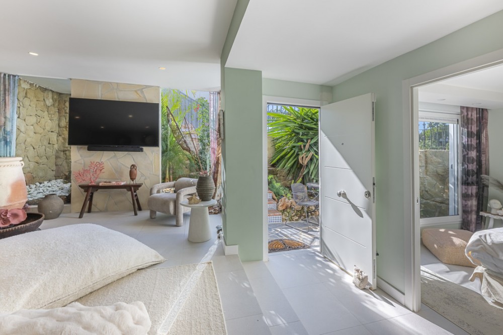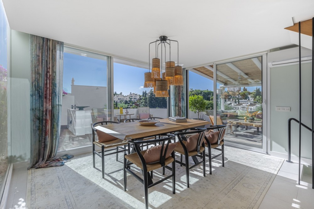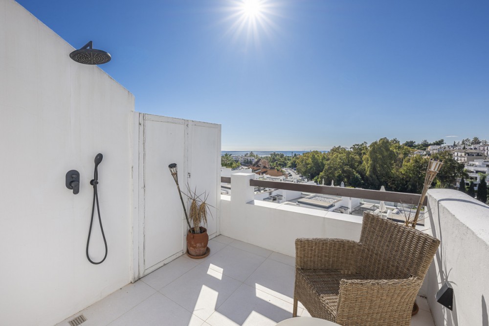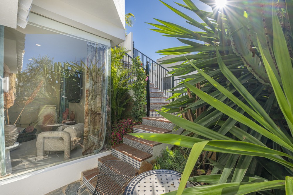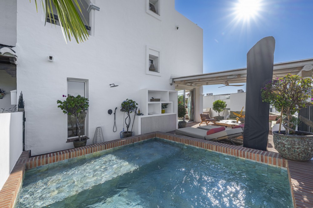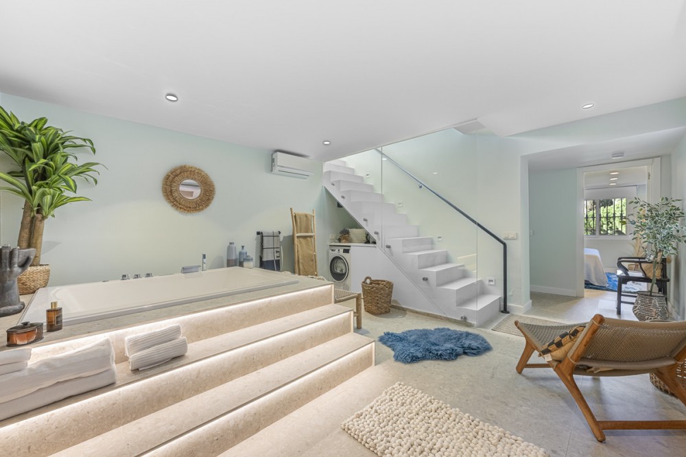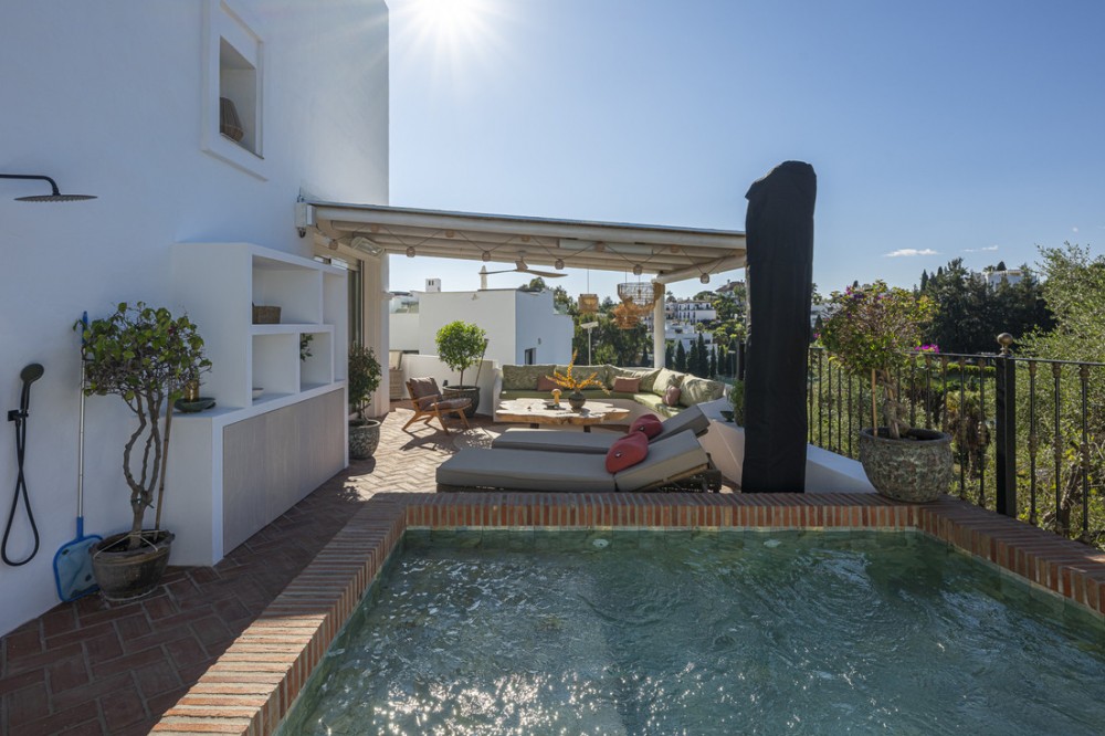 - Situated in the sought after urbanisation of Arco Iris in Altos de Puente Romano, this exceptional townhouse offers a rare opportunity to own one of the most spacious homes within the community. Set in the heart of Marbella Golden Mile, just a short walk from the renowned Puente Romano Resort, the beach promenade, and the dining venues at Forum Marbella, its prime location provides convenience, prestige, and a refined Mediterranean lifestyle. Presented in immaculate condition, the property spans an impressive 250 square metres of interior space, featuring a contemporary design defined by comfort, natural light, and generous proportions. The main living area offers a large open plan kitchen and dining space that flows seamlessly to the outdoor terrace and private pool, creating an ideal setting for both relaxation and entertaining throughout the year. The home comprises four bedrooms and three bathrooms, including two en suite, along with a guest toilet. Each space has been carefully designed to ensure privacy and a calm living environment. A distinctive feature of the property is the private spa area, complete with sauna and jacuzzi, offering a dedicated wellness space within the residence. The property enjoys open views from every level, with the iconic La Concha forming a striking natural backdrop, while the upper floors benefit from sea views extending across the coastline. Additional features include private parking for two vehicles and a large storage room, enhancing practicality for both permanent living and holiday use. Combining contemporary design, a prime location, open views, and amenities such as a private pool and spa, this townhouse represents a compelling opportunity within one of Marbella’s most prestigious residential areas. Christie’s Insight: From our expert Sten Goosen, the property is distinguished by its rare combination of scale, positioning, and lifestyle amenities within a well established enclave on the Golden Mile. The generous interior proportions, together with private wellness facilities and outdoor living spaces, position the residence as a rare offering in this segment of the market, appealing to both end users and investors seeking long term value in a prime coastal setting.