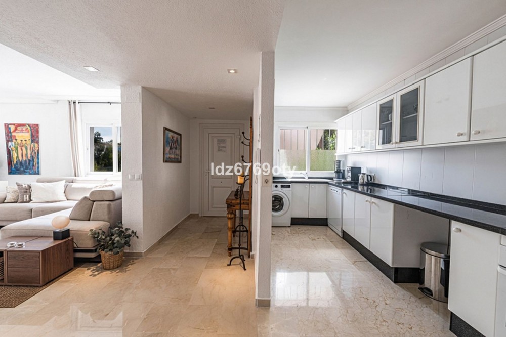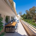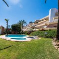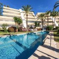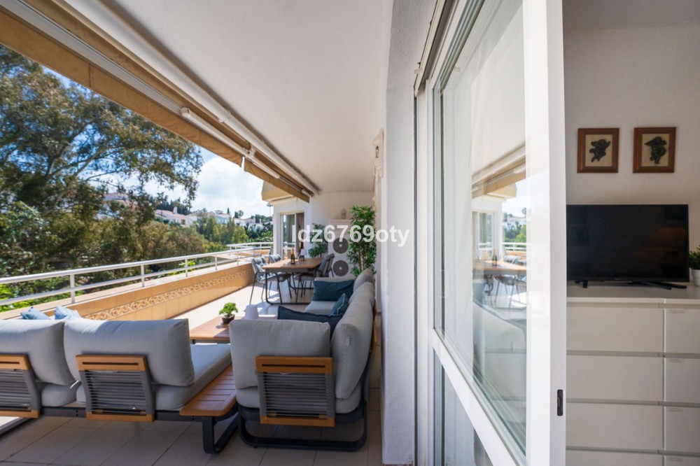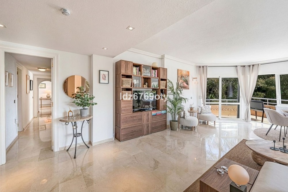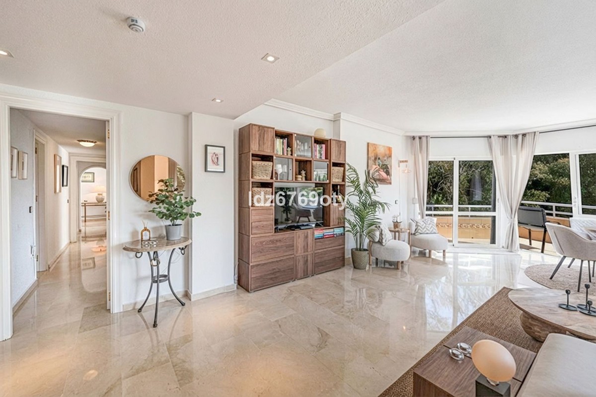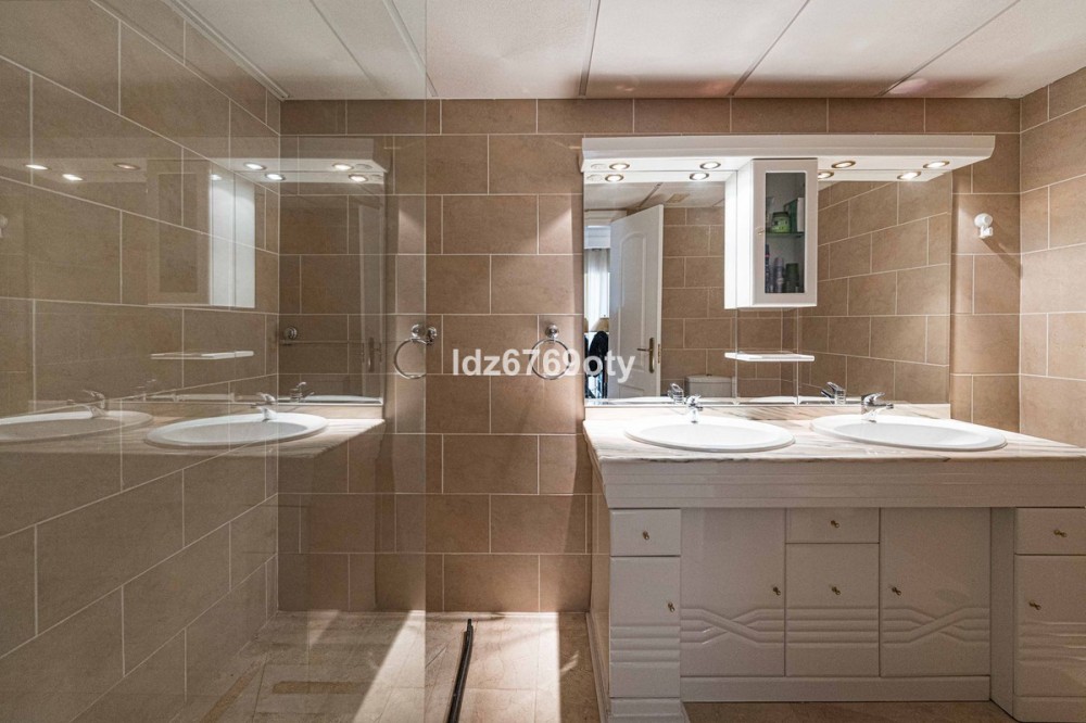 - A spacious and very well-maintained luxury apartment in a prime location next to the popular Torrequebrada Golf Course in Benalmádena Costa! This spacious and light-filled corner apartment is situated in the beautifully maintained small-scale ‘Palmeras del Golf’ urbanisation, featuring numerous palm trees and gardens and boasting two swimming pools. The 3-bedroom apartment features a large master bedroom with an en-suite bathroom with double sinks and built-in cupboards, a bath and a toilet. The other two spacious bedrooms share a second bathroom, which also features double sinks and built-in cupboards, a large walk-in shower and a toilet. All bedrooms are fitted with spacious built-in wardrobes and air conditioning units for both cooling and heating. The spacious and light-filled living room has large windows, is fitted with a fibre-optic connection and connects to a semi-open-plan kitchen with various built-in appliances. From the living room and all bedrooms you have direct access to the large outdoor terrace of approximately 65 m², which offers ample space for a seating area for six people and sun loungers. The terrace faces south/east,offering ample opportunity to enjoy the sun or the sweeping views over the golf course and the surrounding area. Both the living room and the three bedrooms are fitted with roller shutters. From the so-called ‘garden apartment’, a staircase leads to the car park with a dedicated parking space. The property is being sold partially furnished. This luxury apartment is situated in the popular Torrequebrada neighbourhood, within walking distance of the beach, a supermarket and various restaurants. Benalmádena’s popular marina, ‘Puerto Marina’, with its many restaurants and entertainment options, is a 10-minute drive away. Málaga Airport is 15 km away and Marbella 35 km. A unique, quietly situated (family) home with a very spacious outdoor terrace to enjoy the sun, sea, beach, golf and relaxation to the full! Book your viewing now!
