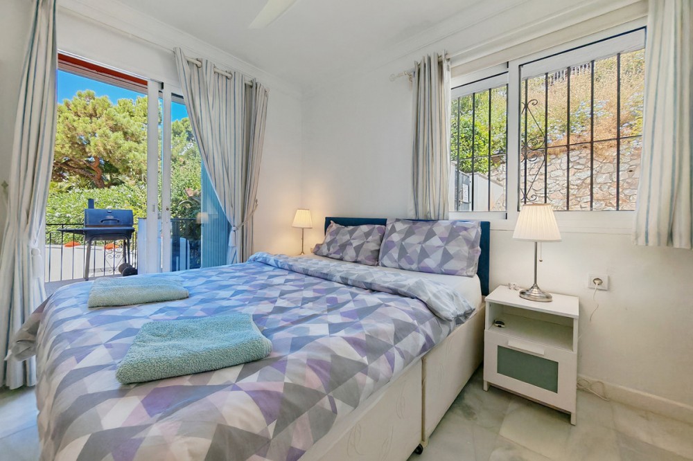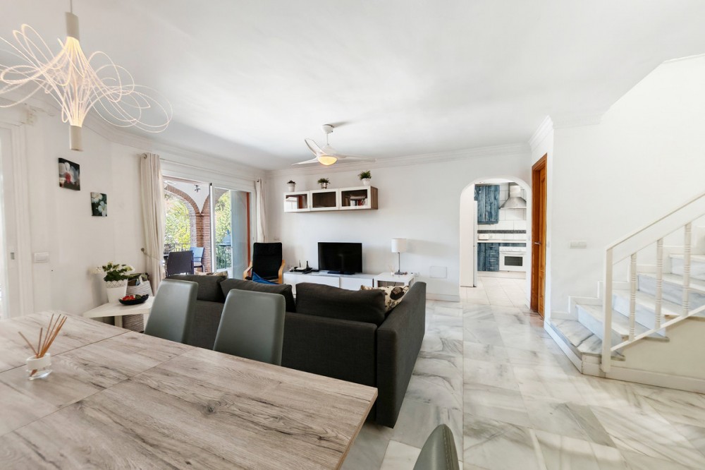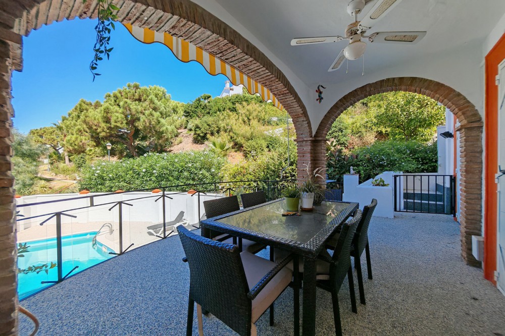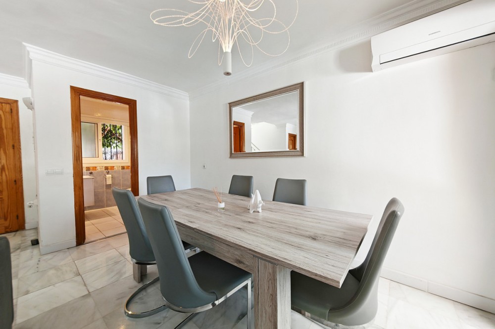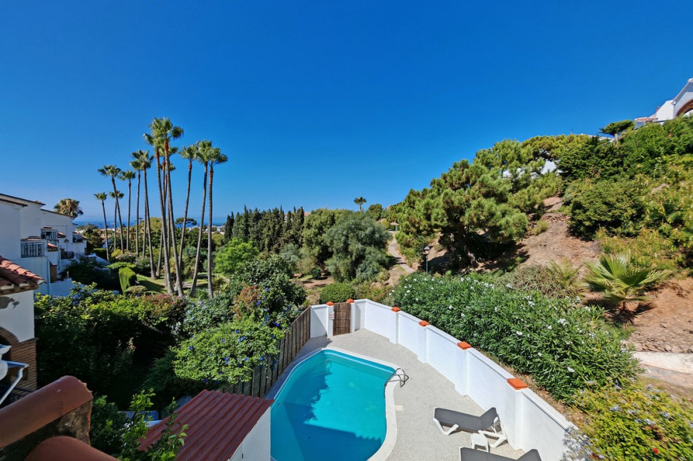 - Town House for sale in , Mijas Costa with 5 bedrooms, 4 bathrooms and with orientation south/west, with private swimming pool, private garage (2 parking spaces) and private garden. Regarding property dimensions, it has 210 m² built and 140 m² terrace. Has the following facilities transport near, air conditioning, fully furnished, fully fitted kitchen, utility room, fireplace, basement, guest room, storage room, solarium, double glazing, barbecue, guest toilet, private terrace, kitchen equipped, living room, study room, separate apartment, sea view, bars, laundry room, internet - wi-fi, covered terrace, fitted wardrobes, garden view, pool view, panoramic view, close to children playground, close to sea / beach, close to golf, uncovered terrace, glass doors, balcony, excellent condition, ceiling cooling system, close to shops, close to town, close to schools, guest apartment, office room and pets allowed.