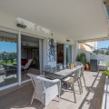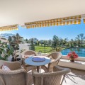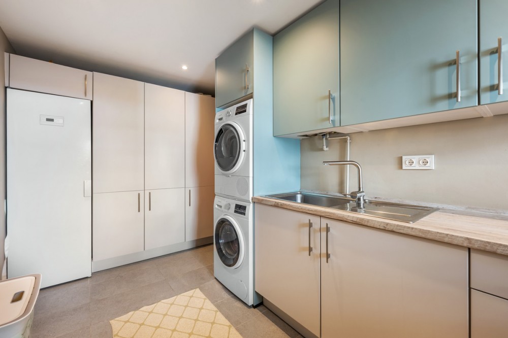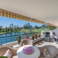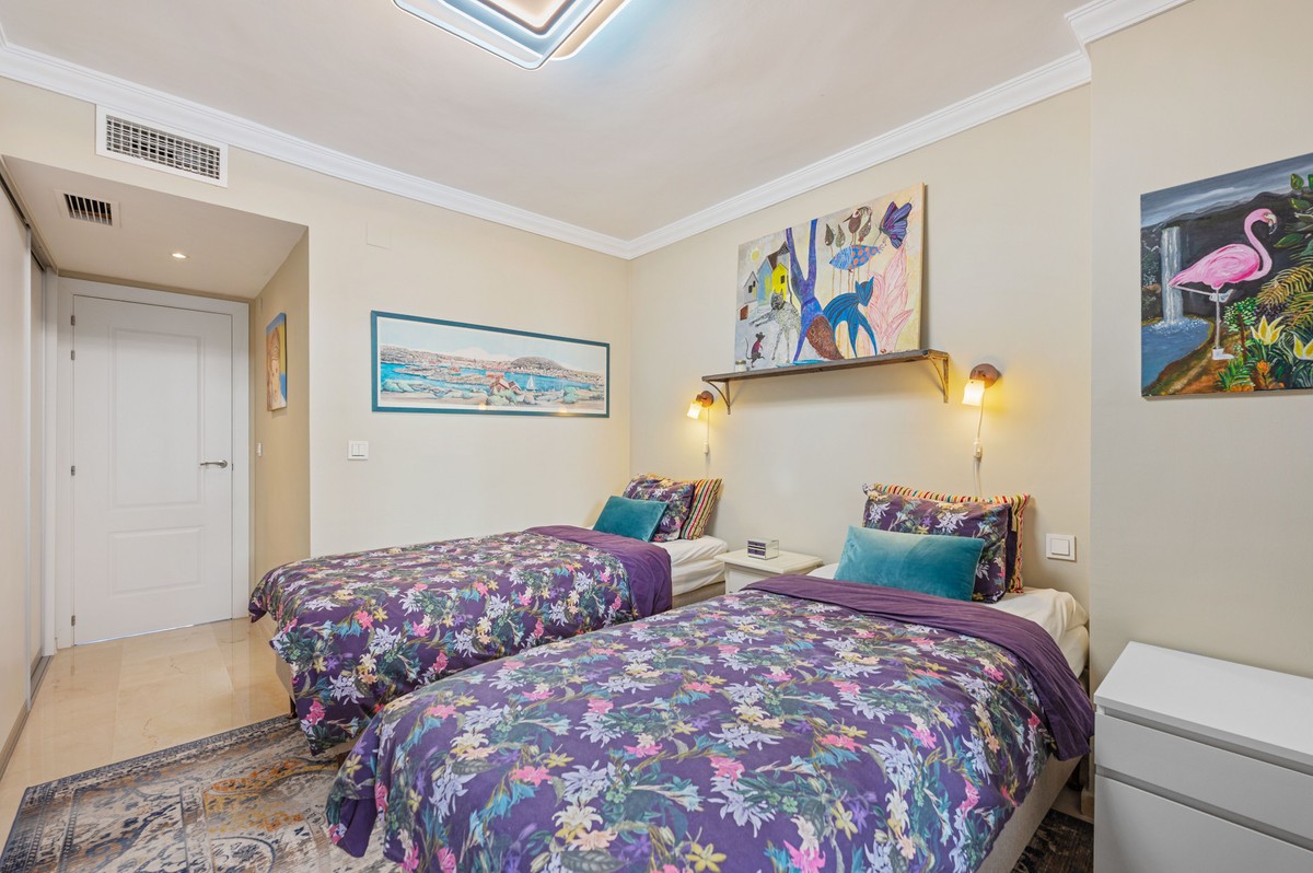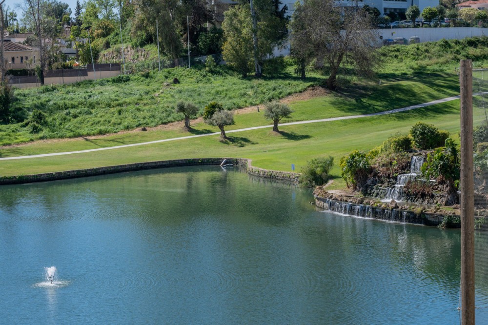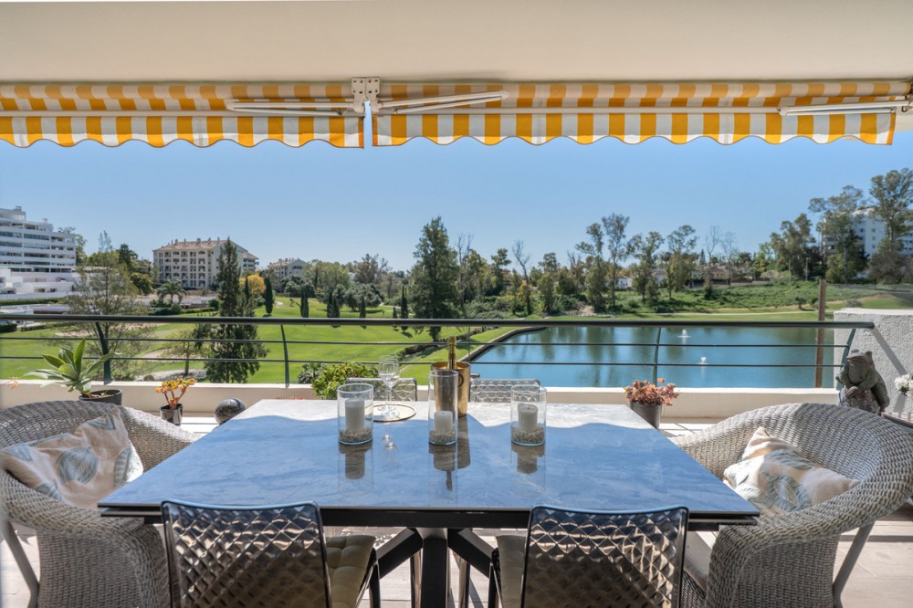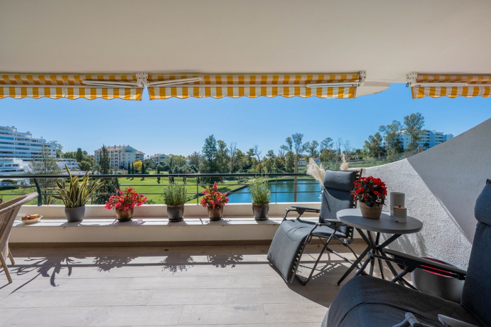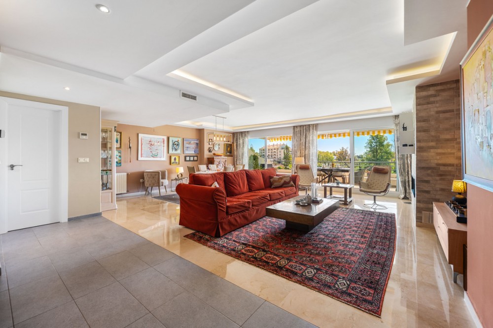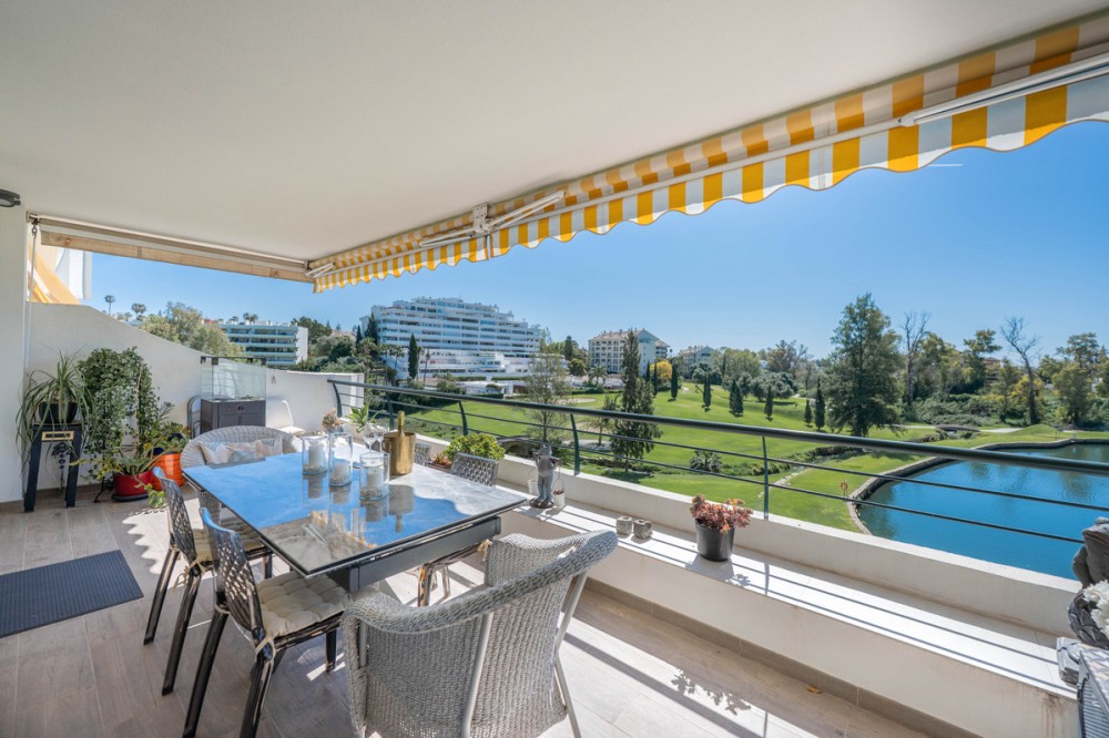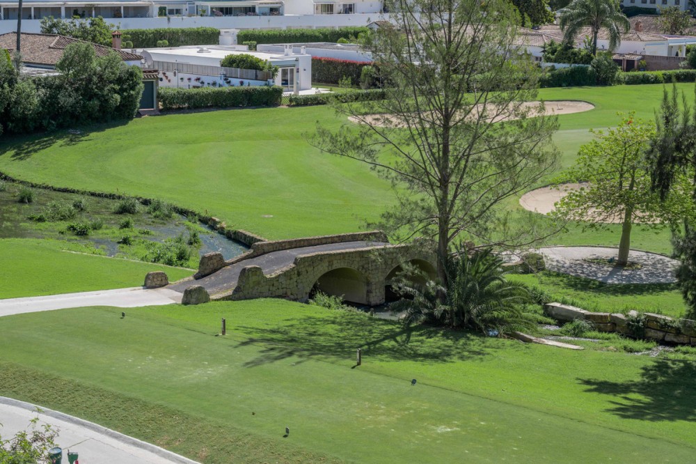- This truly special home combines space, light and tranquility in one of Guadalmina’s most sought-after settings. Originally 2 apartments, combined into one. Located on the first floor yet elevated above the golf course, the apartment enjoys the feel of a third floor or penthouse, with uninterrupted views across the lush fairways. The property has been completely renovated to a high standard and offers a thoughtful layout across one level. Upon entering, you are welcomed by a spacious hallway. To the right, there is a large utility and laundry room with excellent storage. To the left, a beautifully designed Scandinavian-style kitchen features a central island with integrated cooking area, allowing you to enjoy the views while entertaining guests. The bright and expansive living and dining area flows seamlessly onto a generous south-facing terrace, ideal for outdoor dining and relaxation. On this side of the apartment, you will also find a stylish guest bedroom and bathroom. A separate hallway leads to the private sleeping quarters, featuring custom-built storage with mirrored wardrobes and elegant shelving. The master bedroom enjoys an ensuite bathroom, south-facing orientation and direct access to its own large private terrace. Additional bedrooms are well-sized and share beautifully finished bathrooms. The apartment includes partial underfloor heating and central heating for year-round comfort. Originally two apartments, the property has been expertly combined to create a spacious and unique residence rarely found in the area. Additional features include two private parking spaces, the option for a golf buggy space with charging point and storage, as well as generous underground guest parking. An exceptional home for golf enthusiasts or anyone seeking peaceful surroundings with nature at their doorstep.