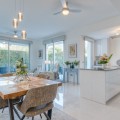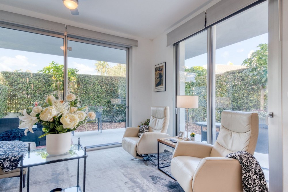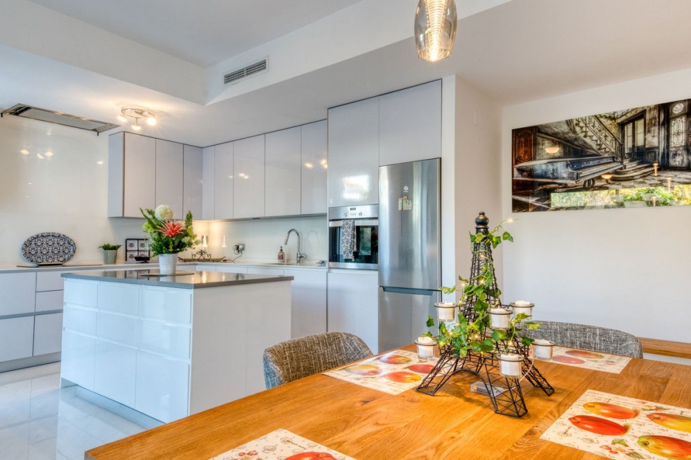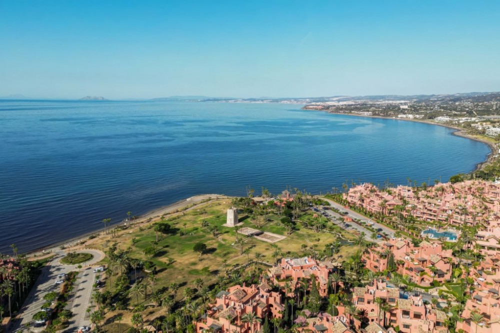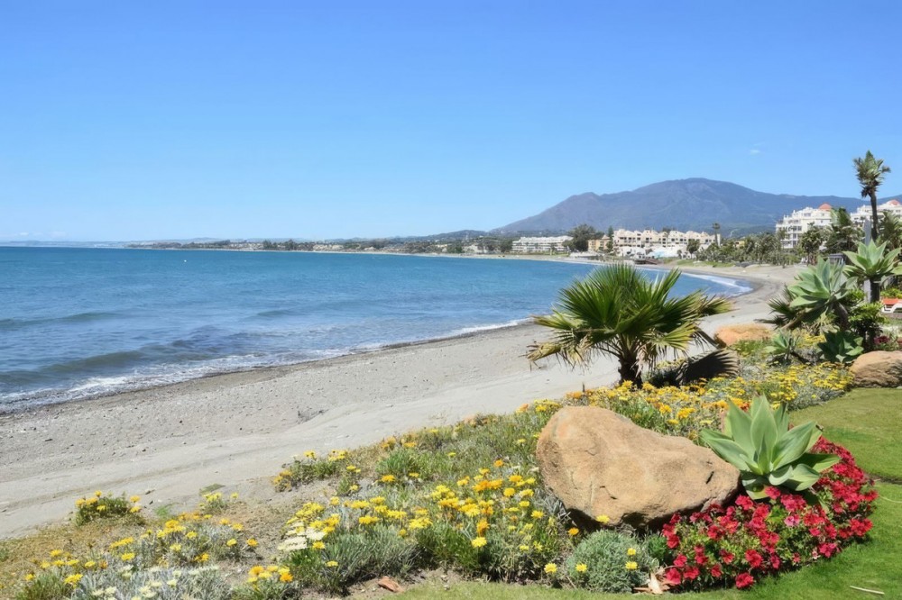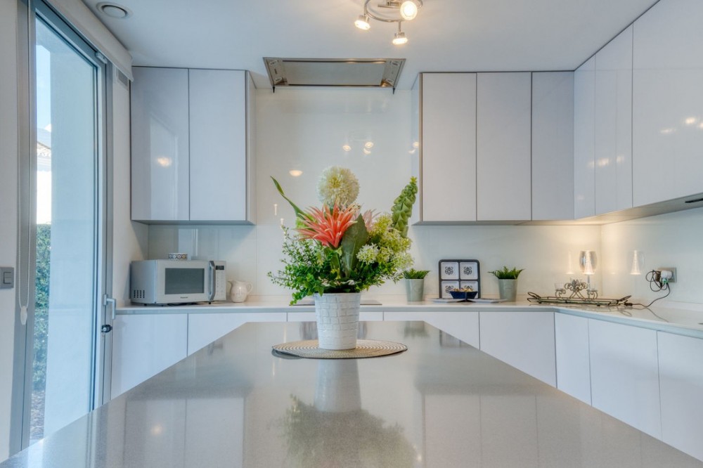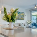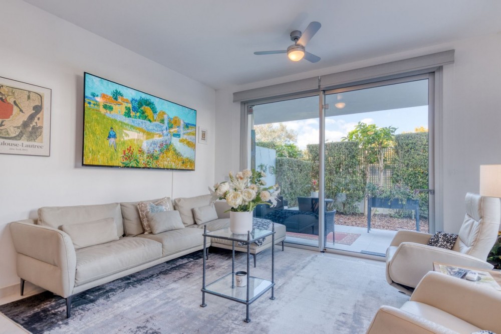 - Contemporary Garden Apartment with Private Outdoor Space | New Golden Mile, Cancelada Set within a sought-after gated community in Cancelada, this three bedroom ground floor apartment offers modern design, privacy and a strong indoor-outdoor lifestyle on the New Golden Mile between Marbella and Estepona. The property enjoys a well-positioned setting within the development, combining a peaceful environment with close proximity to the beach, local amenities, cafés and restaurants. The interior is arranged around a bright open-plan living and dining area that connects directly to the terrace and private garden. The kitchen is finished to a high standard, featuring a central island and integrated appliances, creating a practical and social space. The layout includes three bedrooms and two bathrooms, including a principal suite with en suite bathroom. The overall design focuses on comfort and functionality, making the property suitable for both full-time living and holiday use. The outdoor areas provide a key feature of the home, with a covered terrace leading onto a private landscaped garden, offering a level of privacy rarely found in apartment living. Additional features include underground parking and a storage room, within a secure gated community with landscaped gardens and a communal swimming pool. A well-located property offering modern living, private outdoor space and strong lifestyle appeal on the New Golden Mile.